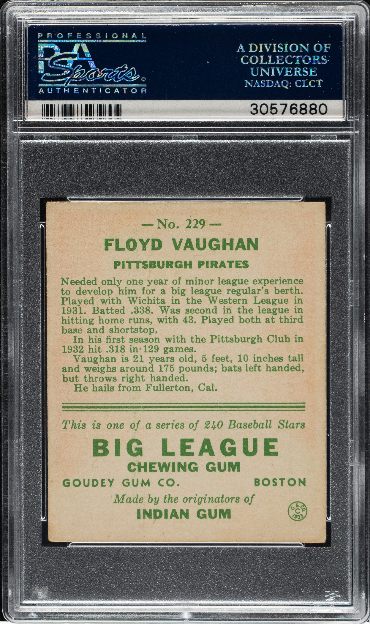 Graded EX-MT 6 by PSA. Pittsburgh Pirates Hall of Famer Floyd "Arky" Vaughan.