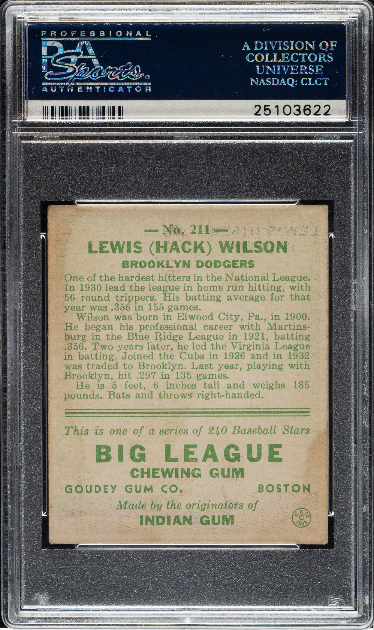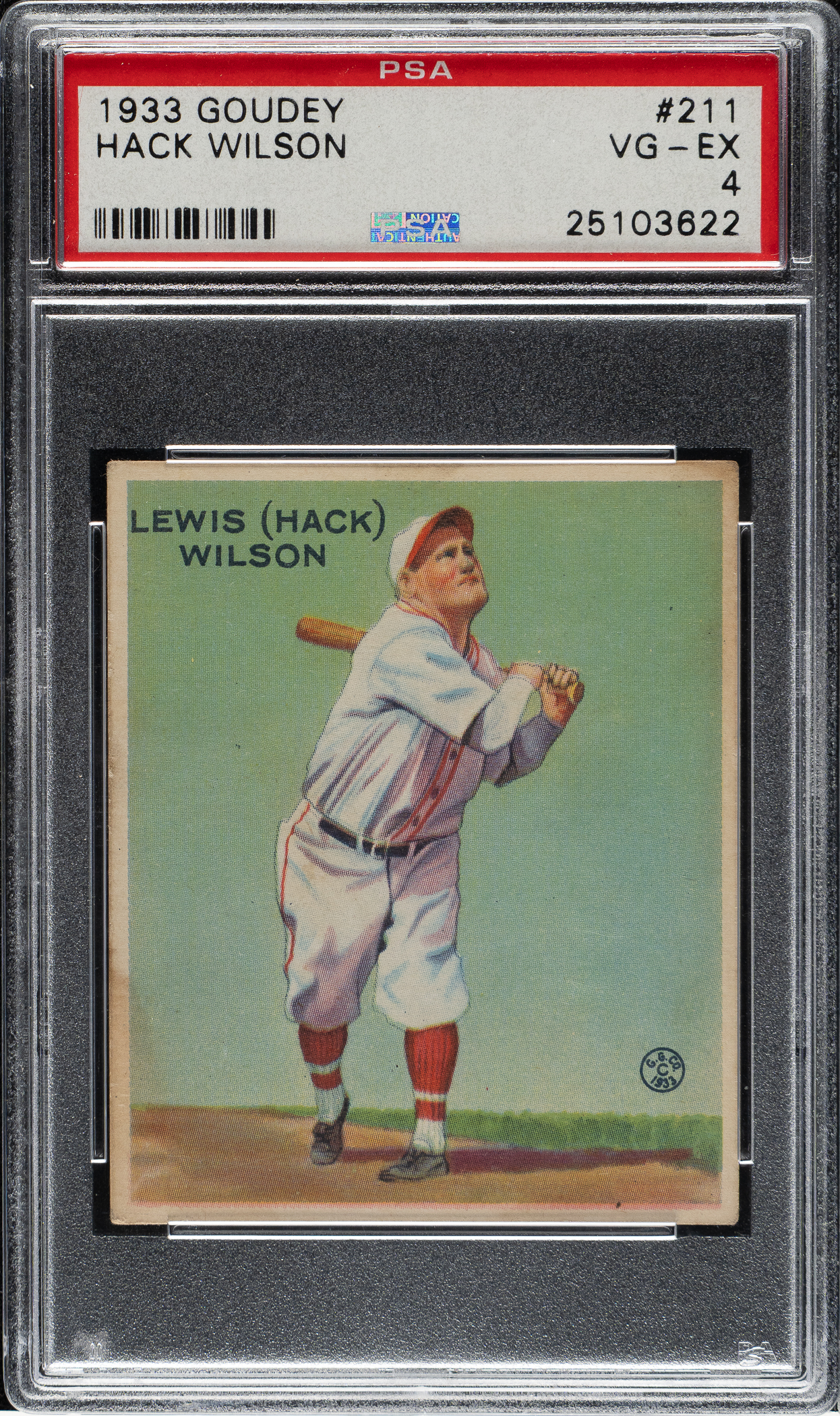 Graded VG-EX 4 by PSA. Brooklyn Dodgers Hall of Famer Hack Wilson.