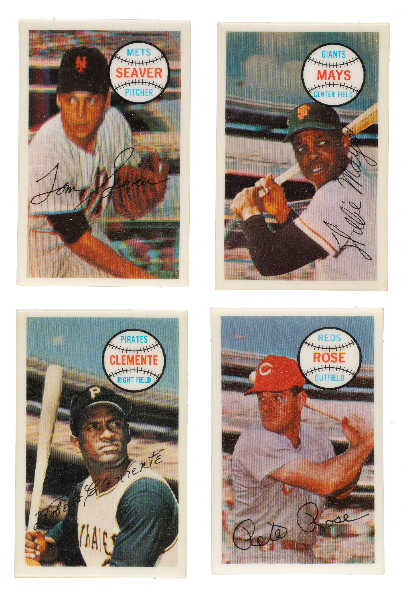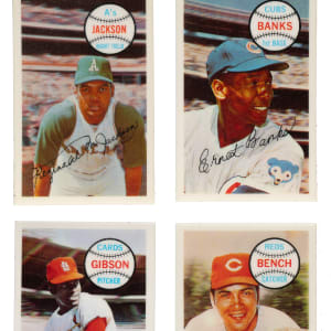 Throughout the 1970s and early 1980s, the Kellogg's cereal company was the only true competition for Topps in the baseball-card market. The 1970 issue, offered here, represents the first time in decades that Kellogg's included baseball cards in cereal boxes, and is well known for its three-dimensional design. These sets have always been of great interest to collectors as they offer affordable alternatives to standard-issue Topps cards of the many Hall of Famers and stars included in each set. An impressive twenty-one Hall of Famers are featured throughout this set, including Johnny Bench, Roberto Clemente, Willie Mays, and Ernie Banks, as well as the many other stars of the day, including Pete Rose. Condition is 72% Nr/Mt to Nr/Mt-Mt, 14% Ex to Ex-Mt, and 14% Vg to Vg-Ex. Keys: #2 Rose (Nr/Mt+), 7 Seaver (Nr/Mt-Mt), 12 Mays (Nr/Mt), 27 Clemente (Nr/Mt), 32 Jackson (Vg-Ex), 40 Banks (Nr/Mt-Mt), 58 Bench (Ex-Mt), and 71b Gibson (Nr/Mt-Mt). Total: 75 cards.