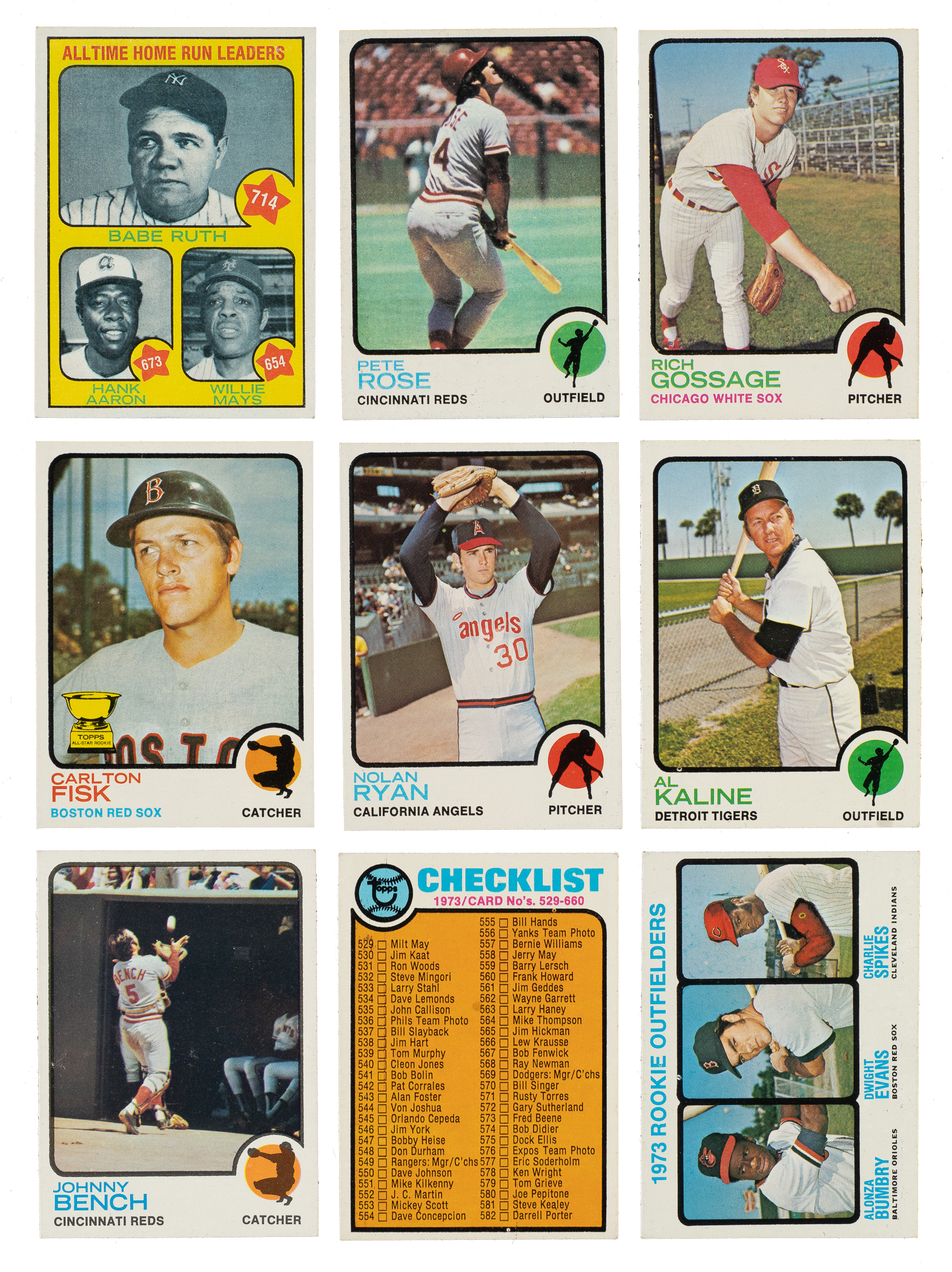 Presented is an outstanding complete set of the 1973 Topps series consisting of 660 different cards. The rookie cards of Hall of Famers Mike Schmidt and Rich Gossage, as well as the final cards of Roberto Clemente and Willie Mays, highlight the 1973 Topps issue, one of the most popular sets of the 1970s. Condition is 65% Nr/Mt to Nr/Mt-Mt (including a few Mint) and 35% Ex to Ex-Mt (including 2% slightly lesser). Two cards have been professionally graded and encapsulated by PSA. Keys: #1 Ruth/Mays/Aaron (Ex-Mt+), 50 Clemente (NM-MT 8), 100 Aaron (Vg-Ex+), 130 Rose (Ex), 174 Gossage RC (Nr/Mt+), 193 Fisk (trimmed, otherwise Nr/Mt+), 220 Ryan (Ex-Mt+), 280 Kaline (Ex), 305 Mays (NM-MT 8), 380 Bench (Ex+), 588 Checklist (Ex-Mt), 614 Evans RC (Ex), and 615 Schmidt RC (Ex+). This is an extremely attractive high-grade 1973 Topps complete set with numerous highlights. Total: 660 cards.