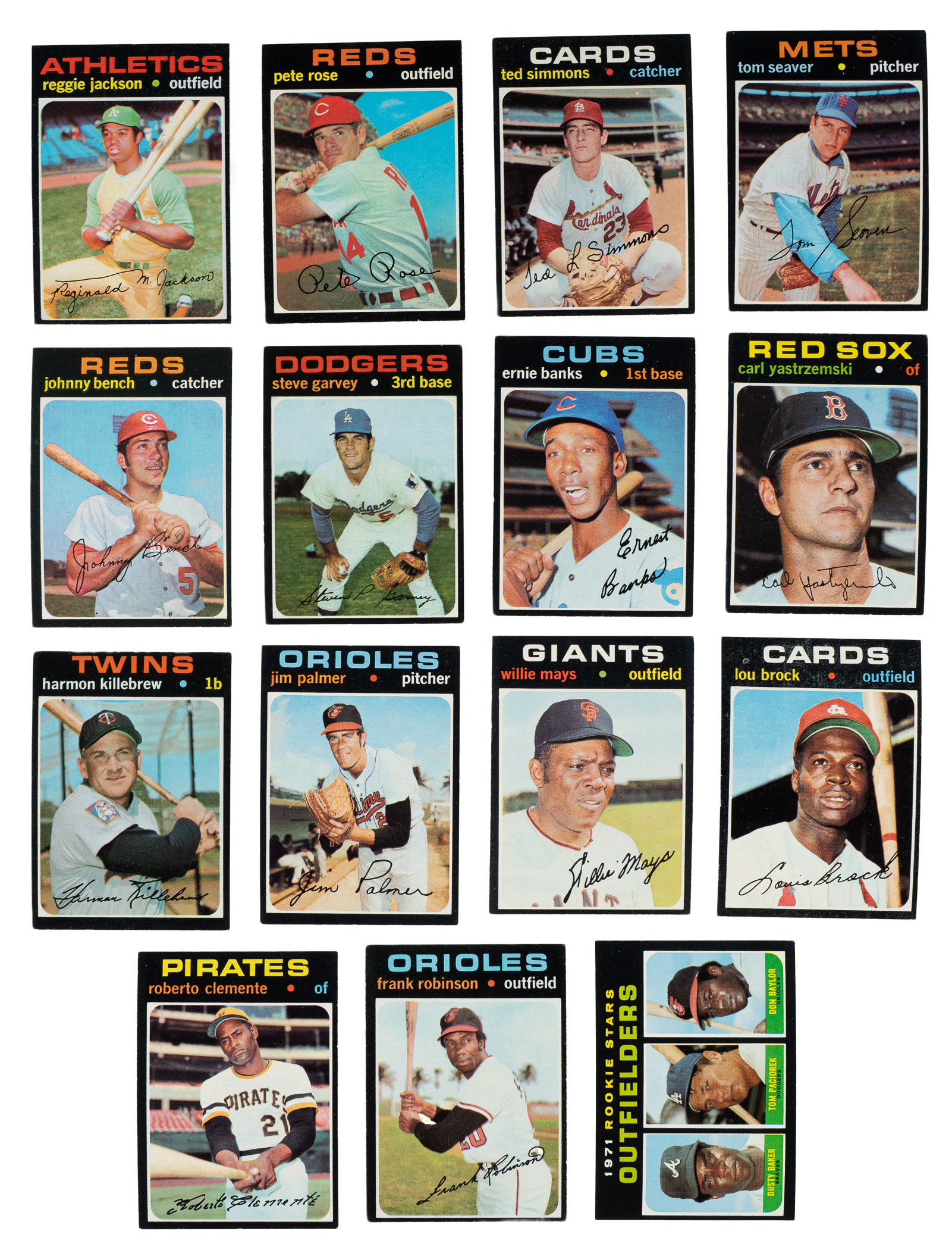 Crisp and clean 1971 Topps set, at 752 cards the largest set of Topps cards issued up to that time. The black flush-to-the-border design of the 1971 Topps set makes this issue particularly challenging to collect in extremely high grade. Condition is 23% Nr/Mt or better, 68% Ex to Ex-Mt, and 9% Vg to Vg-Ex (including a few that measure a bit small, a couple with a slight trim, and a few with color added). Keys: #5 Munson (Ex), 20 Jackson (trimmed and color added, otherwise Ex-Mt), 26 Blyleven RC (Ex-Mt), 45 Hunter (slight trim and color added, otherwise Ex-Mt), 100 Rose (Nr/Mt), 117 Simmons RC (Nr/Mt), 160 Seaver (Ex-Mt), 250 Bench (Nr/Mt+), 341 Garvey RC (Vg-Ex), 400 Aaron (Ex-Mt), 513 Ryan (Ex-Mt), 525 Banks (Ex), 530 Yastrzemski (Ex), 550 Killebrew (Ex), 570 Palmer (Ex+), 580 Perez (color added, otherwise Ex), 600 Mays (Ex), 625 Brock (Ex), 630 Clemente (Ex), 640 F. Robinson (Ex), and 709 Baylor/Baker RC (Ex-Mt). Outstanding mid- to high-grade complete set. Total: 752 cards.