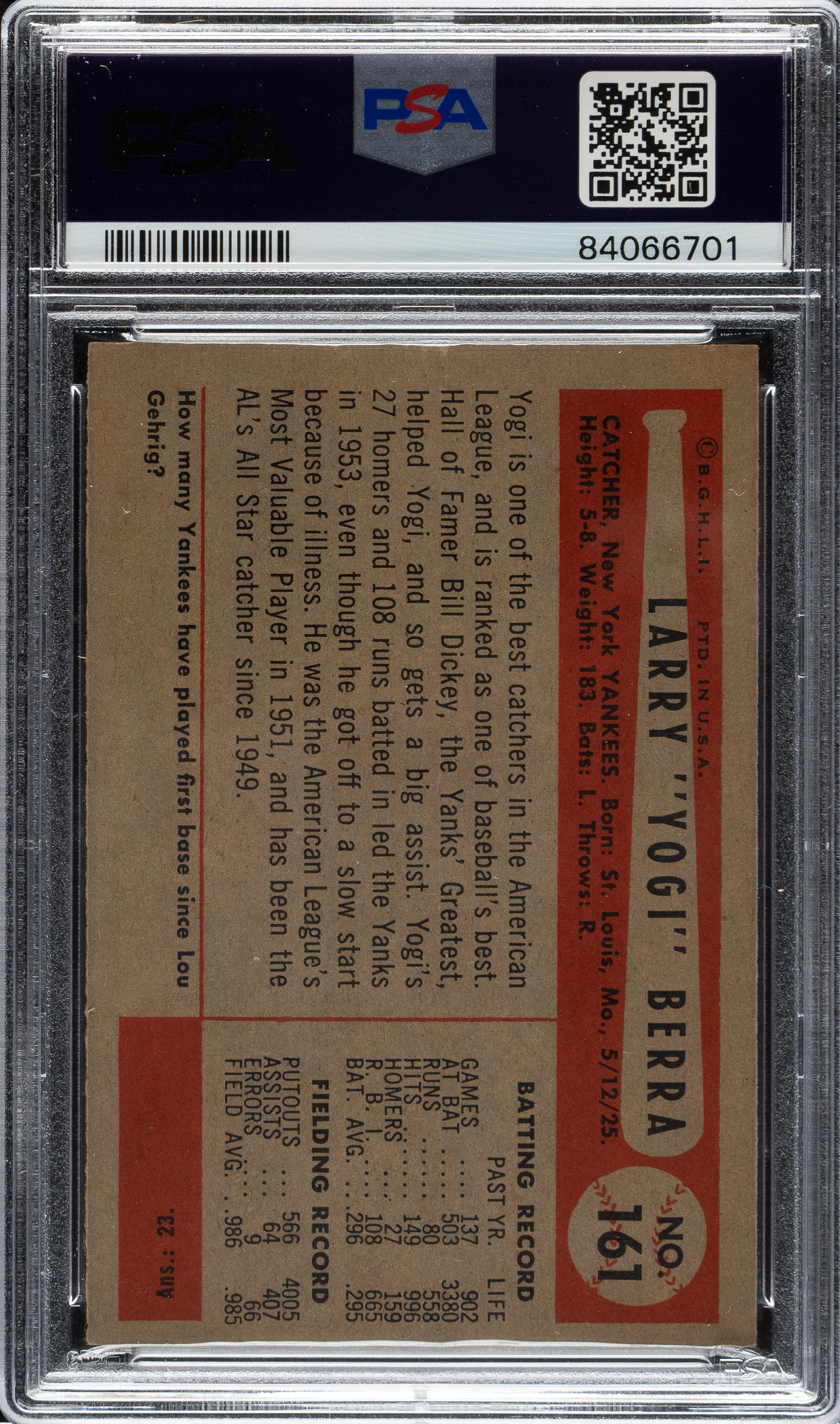 Graded EX-MT 6 by PSA. New York Yankees Hall of Famer Yogi Berra.
