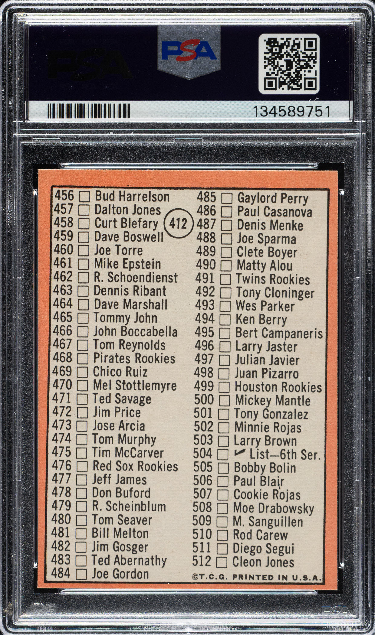 Lot # 2117: 1969 Topps #412 Checklist with Mantle PSA NM-MT 8 (OC)