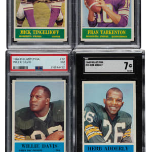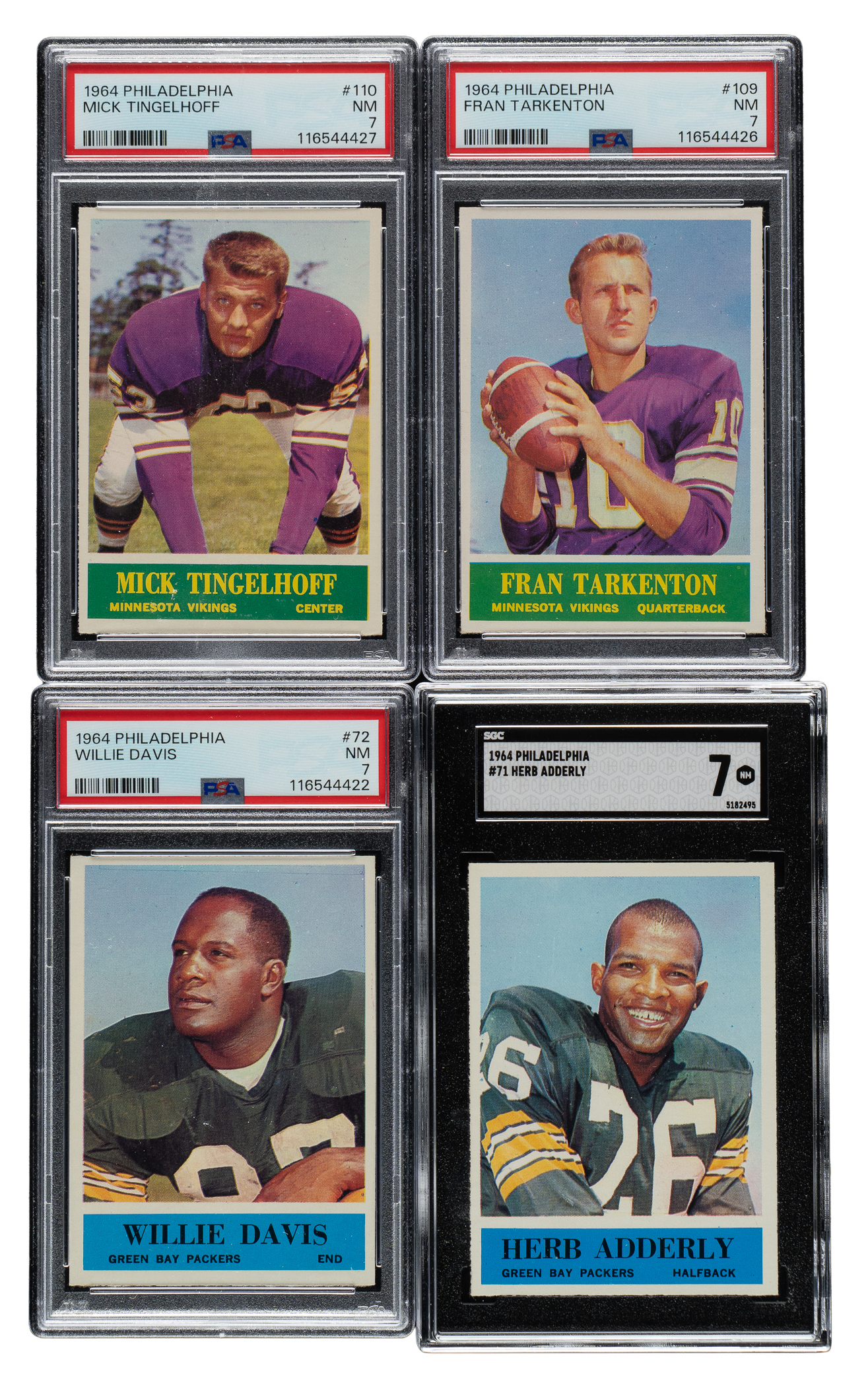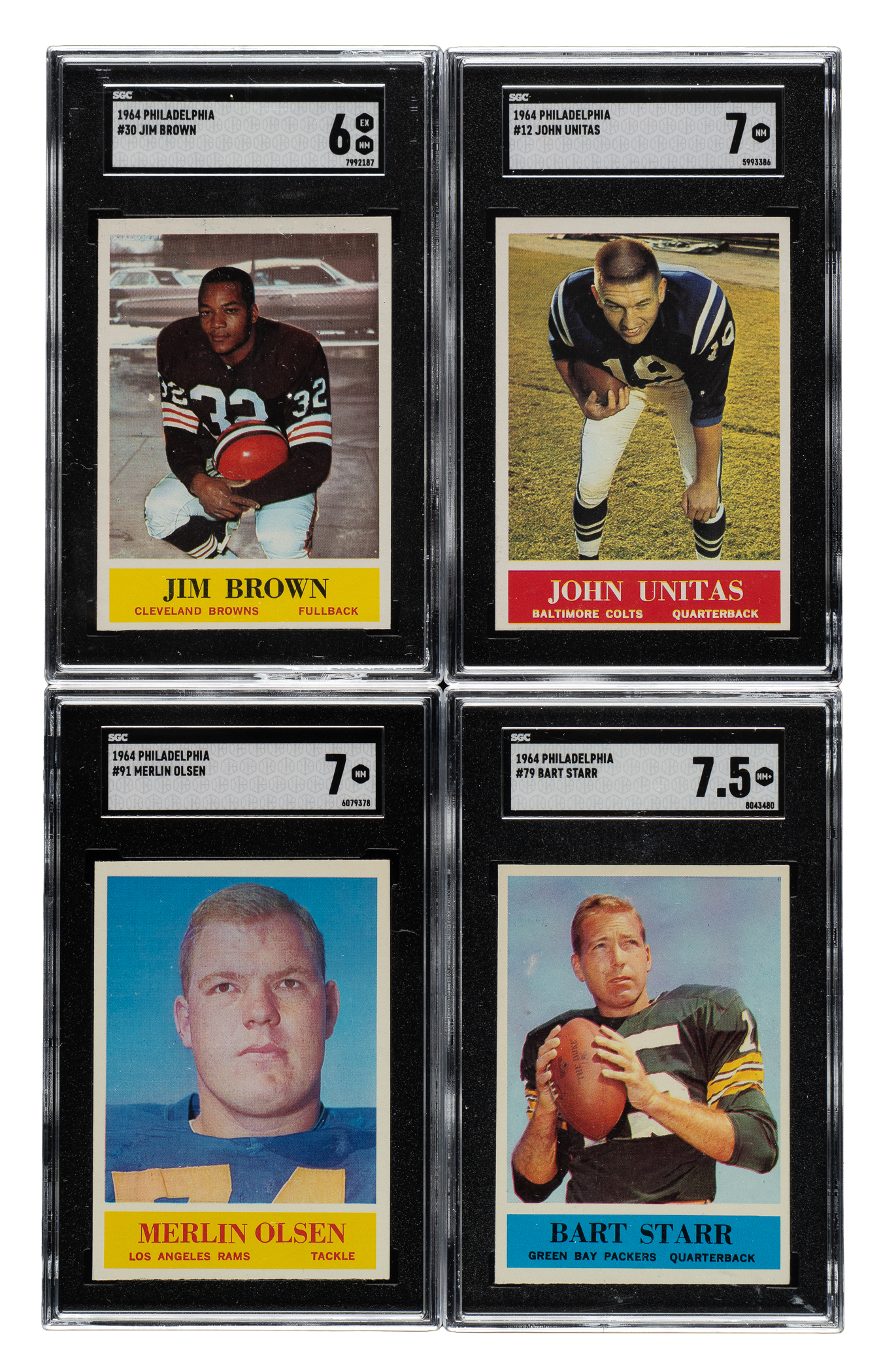Presented is an outstanding complete set of 1964 Philadelphia football cards. This set features all the NFL stars of the day highlighted by thirty-four Hall of Famers, including Jim Brown, Bart Starr, and Johnny Unitas, as well as the Hall of Fame rookie cards of Merlin Olsen, Herb Adderley, Willie Davis, Mick Tingelhoff, and John Mackey. Condition is 59% Nr/Mt to Nr/Mt-Mt (approximately two-thirds Nr/Mt), 36% Ex to Ex-Mt, and 5% lesser (mostly Vg-Ex). Eight cards have been professionally graded and encapsulated by PSA (3) and SGC (5). Keys: #3 Mackey RC (Vg-Ex+), 12 Unitas (NM 7), 17 Ditka (Ex-Mt), 30 Brown (EX/NM 6), 48 Lilly (Ex), 51 Meredith (Ex), 71 Adderley RC (NM 7), 72 Davis RC (PSA NM 7), 74 Hornung (Vg-Ex+), 79 Starr (NM+ 7.5), 80 Taylor (Nr/Mt), 91 Olsen RC (NM 7), 109 Tarkenton (PSA NM 7), 110 Tingelhoff RC (PSA NM 7), 117 Gifford (traces of ink on right edge, otherwise Ex), 124 Tittle (Ex), 186 Jurgenson (Ex), 197 Checklist (Vg-Ex+), and 198 Checklist (Vg-Ex+). This is a superb high-grade complete set of this classic football issue. Total: 198 cards.