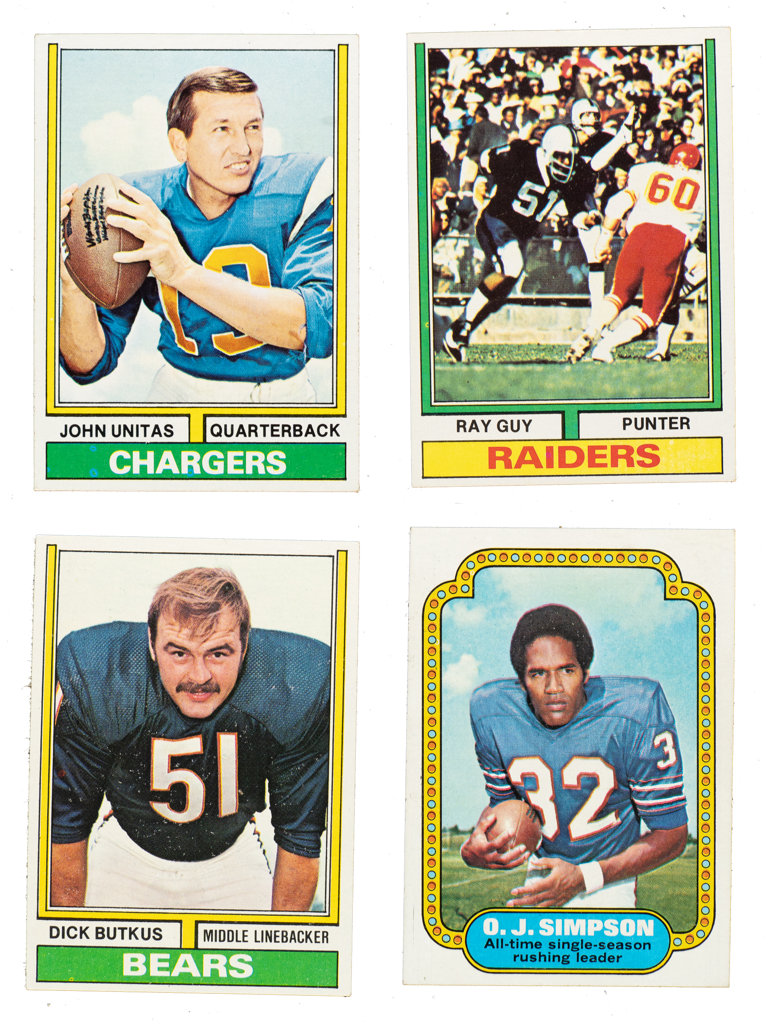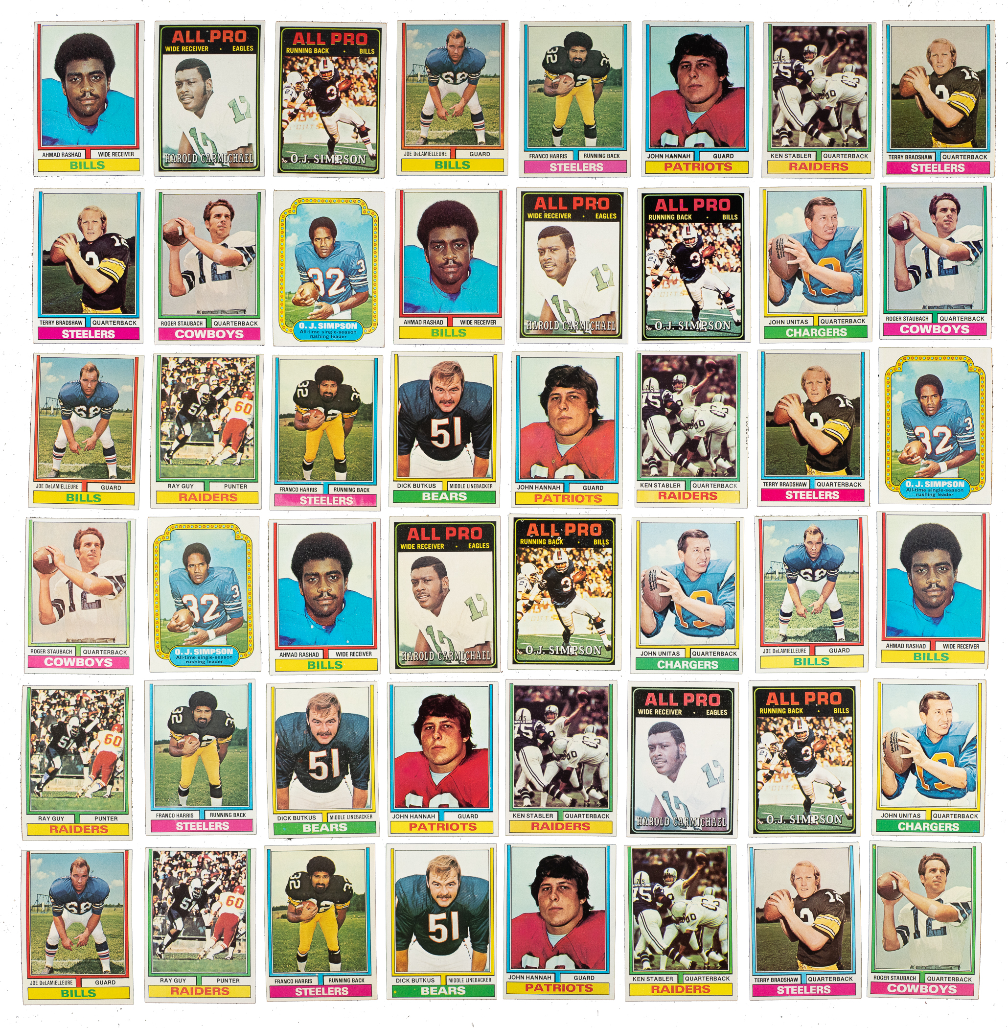 Presented are four mid- to high-grade complete 528-card sets of 1974 Topps football. The 1974 Topps set features rookie cards of Hall of Famers John Hannah, Ray Guy, Harold Carmichael, and Joe DeLamielleure as well as numerous other stars and Hall of Famers, including Johnny Unitas, Roger Staubach, and Ahmad Rashad. Condition is 33% Nr/Mt to Nr/Mt-Mt, 57% Ex to Ex-Mt (including some due solely to centering), and 10% Vg to Vg-Ex. Keys: Four #1 Simpson (Ex-Mt, Ex, and two Vg-Ex), four 105 Rashad RC (two Ex-Mt+ and two Ex due mostly to centering), four 121 Carmichael RC (slight tilt to picture, otherwise Nr/Mt+, Ex-Mt, and two Ex), four 150 Unitas (two Ex and two Vg-Ex), four 183 DeLamielleure RC (Nr/Mt, Ex-Mt, and two Ex), four 219 Guy RC (Ex-Mt and three Ex), four 220 Harris (two Nr/Mt+, Ex-Mt, and Ex+), four 383 Hannah RC (Nr/Mt, two Ex-Mt, and Ex due to centering), four 470 Bradshaw (two Ex-Mt, Ex, and Vg-Ex+), four and 500 Staubach (Nr/Mt+, Ex-Mt, Ex+, and Vg-Ex+). Total: 4 sets, 2,112 cards. The size/weight of this item requires that there will be an additional shipping charge for this lot.