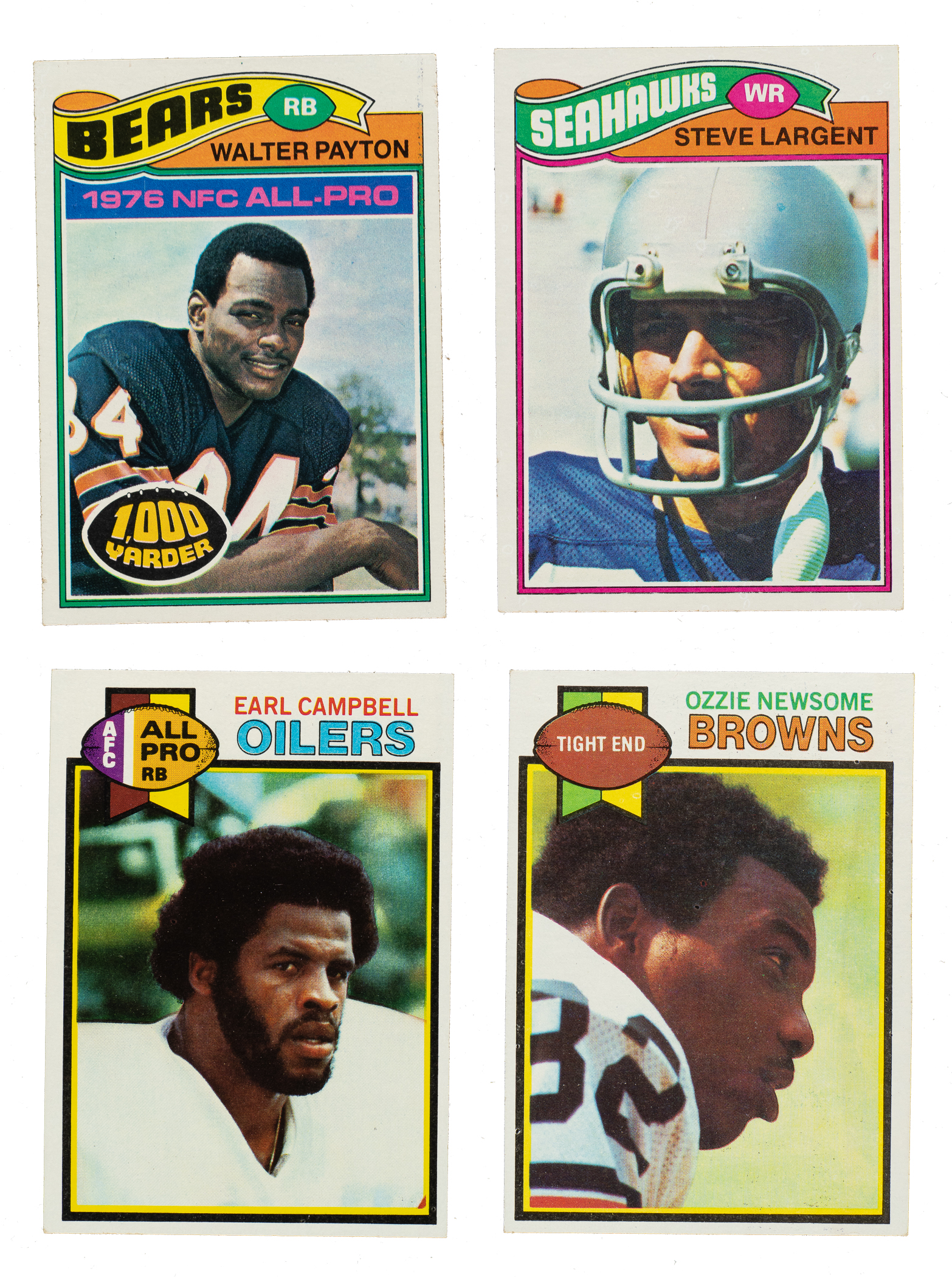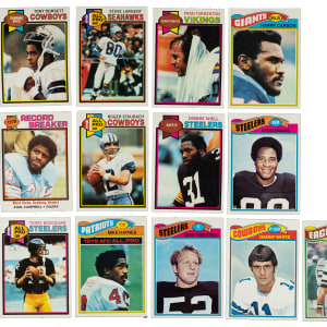 Presented are mid- to high-grade complete Topps football sets from 1977 and 1979, loaded with Hall of Famers and highlighted by the rookie cards of Steve Largent and Earl Campbell. This collection consists of the following: 1) 1977 (528): Condition is 35% Nr/Mt to Nr/Mt-Mt, 41% Ex to Ex-Mt, and 24% Vg to Vg-Ex. Keys: #29 L. Selmon RC (Vg-Ex), 50 Haynes RC (Ex), 99 Webster RC (Nr/Mt), 146 Carson RC (Ex-Mt), 177 Largent RC (Ex+), 195 Swann (Nr/Mt), 284 White RC (Ex), 360 Payton (Ex), and 397 Papale RC (Ex). 2) 1979 (528): Condition is 35% Nr/Mt to Nr/Mt-Mt, 40% Ex to Ex-Mt, and 25% Vg to Vg-Ex (mostly due to water stains). Keys: #3 Rushing Ldrs - Payton/Campbell (Vg-Ex), 308 Newsome RC (Ex-Mt), 310 Lofton RC (Nr/Mt), 331 Campbell RB (Ex+), 390 Campbell RC (Vg-Ex), 400 Staubach (Nr/Mt-Mt), 411 Shell RC (Nr/Mt), 480 Payton (Vg-Ex), and 500 Bradshaw (Ex-Mt). These are very attractive complete sets of these classic 1970s Topps football series. Total: 2 sets, 1,056 cards. The size/weight of this item requires that there will be an additional shipping charge for this lot.