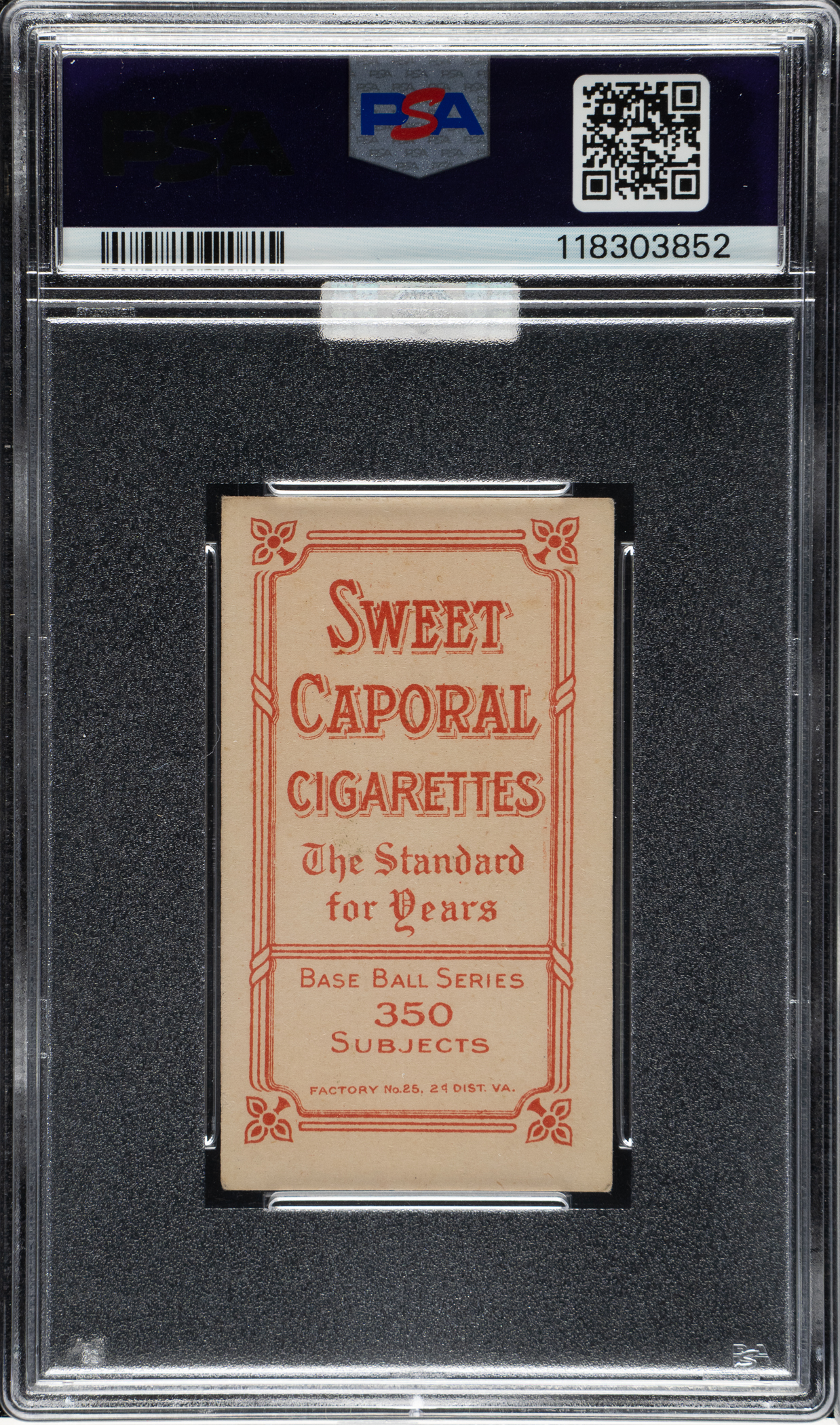 Graded VG-EX+ 4.5 by PSA. Very attractive mid-grade example of one of Detroit Tigers Hall of Famer Ty Cobb's most striking cards. The red background pose is considered one of the classics of the T206 set and all vintage cards. This well-centered card has a brilliant red background and light corner wear. The Sweet Caporal 350/25 advertising reverse is boldly printed and clean. The red background Cobb portrait is one of the key cards of the set, and this example would be a highlight in a high-quality T206, Hall of Famer, or Ty Cobb card collection. Awarded an MBA Silver Diamond by Mike Baker Authenticated for high-end eye appeal. A corresponding MBA sticker is affixed to the front of the holder.