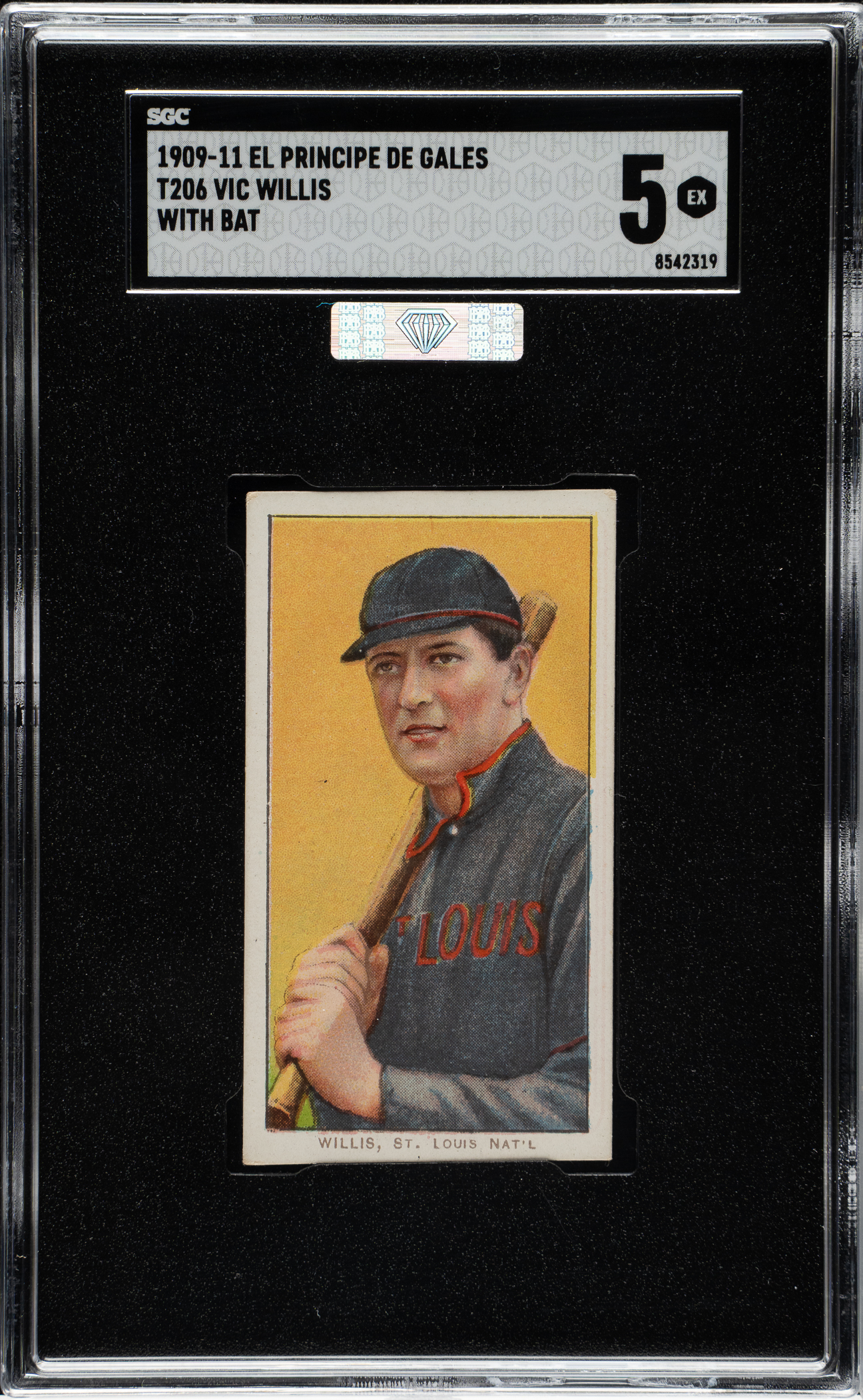 Graded EX 5 by SGC. Only two examples of this front/back combination have been graded higher by PSA to date. Superb example of St. Louis Cardinals Hall of Famer Vic Wills (with bat) from the legendary T206 White Border set featuring a desirable El Principe De Gales reverse. The offered card displays vibrant colors, impressive registration, excellent centering, and light corner wear. The important advertising reverse is boldly printed and clean. A superb example worthy of any high-quality T206 set or Hall of Fame collection. Awarded an MBA Silver Diamond by Mike Baker Authenticated for high-end eye appeal. A corresponding MBA sticker is affixed to the front of the holder.