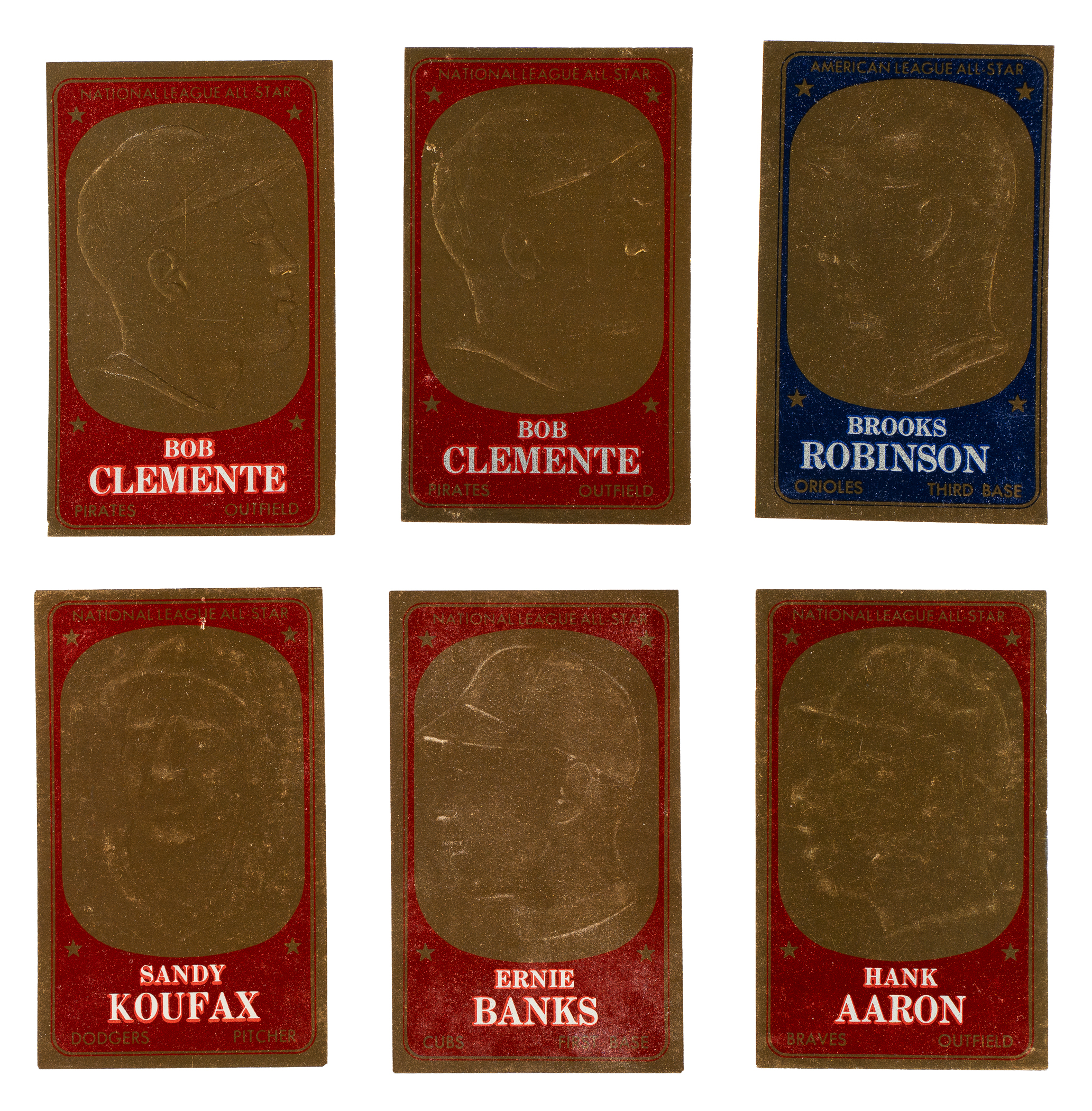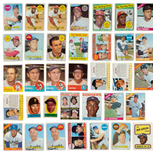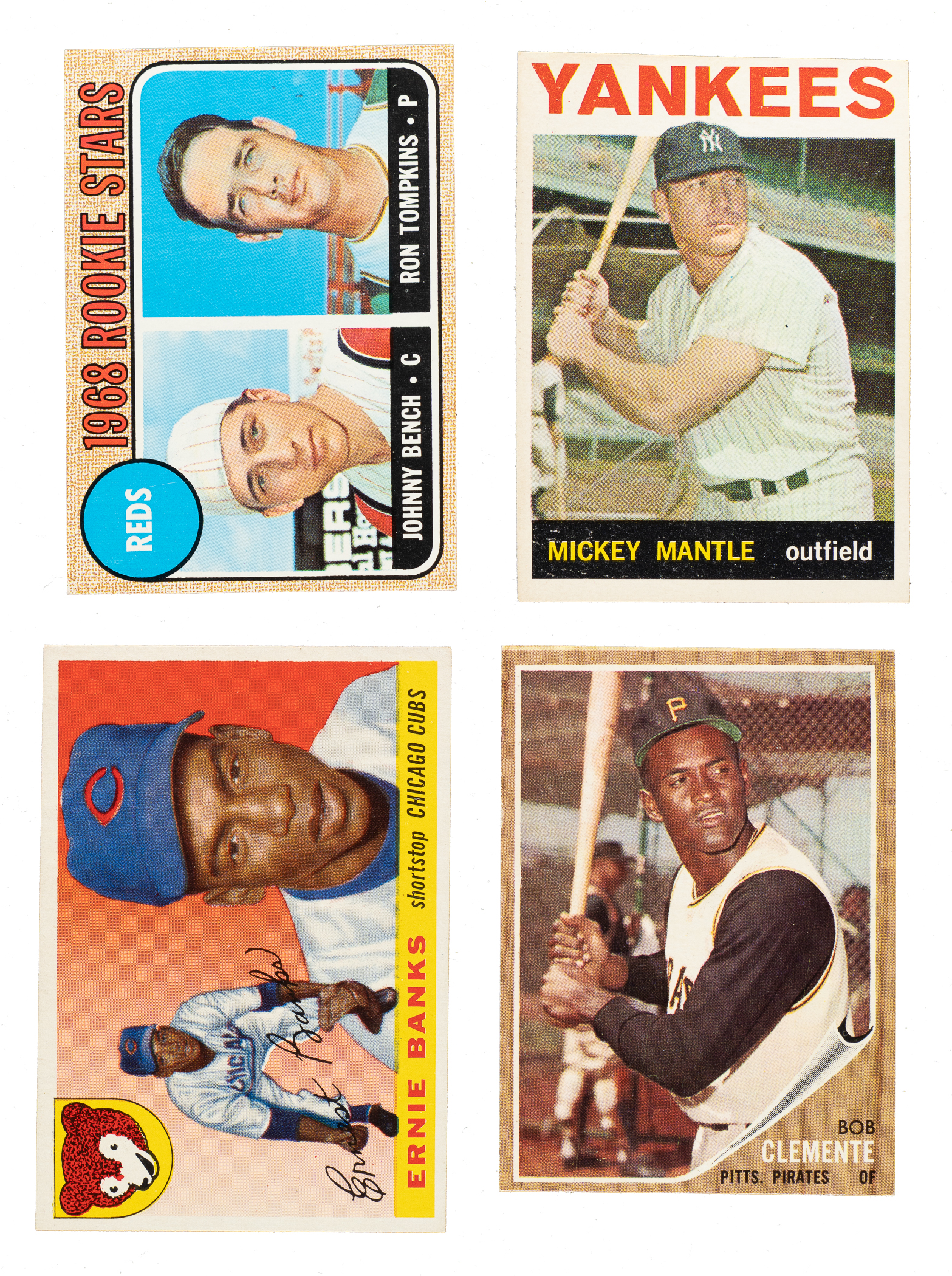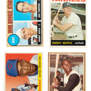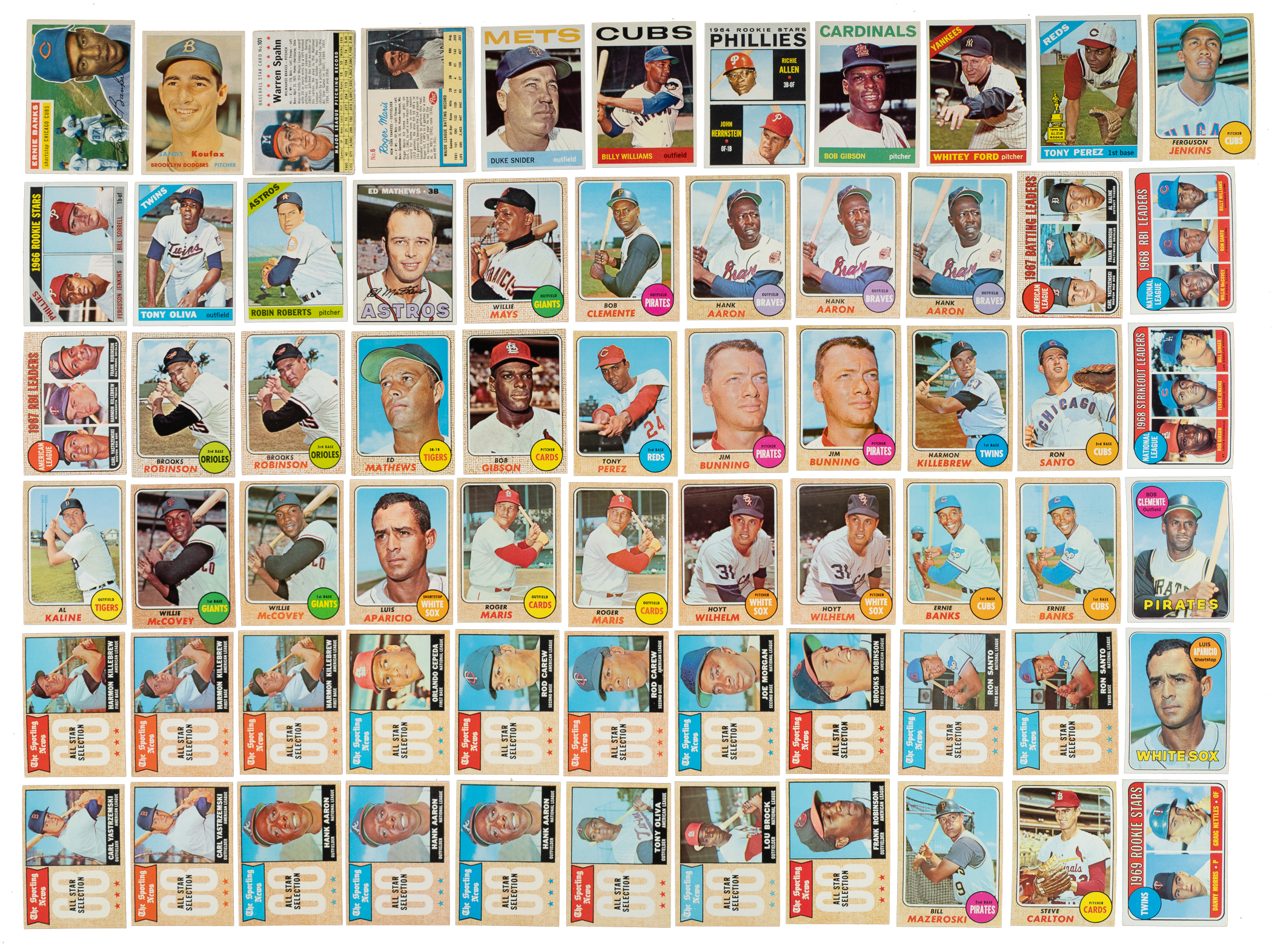Shoebox collection of 1,229 baseball cards, including Topps, Fleer, Jell-O, Post Cereal, and Exhibit issues, spanning the years 1954 to 1970. The collection is highlighted by ninety-seven Hall of Famers, including a 1957 Topps #302 Sandy Koufax, a 1964 Topps #50 Mickey Mantle, and a 1968 Topps #247 Johnny Bench rookie. This collection consists of the following: 1) 1947-1966 Exhibits (7 cards): Ex to Ex/Ex-Mt overall. Includes: Brewer, Burdette/front view, Cerv/plain uniform, Goodman/batting, Malzone, Score/plain cap, and Wertz/portrait. 2) 1954 Topps (8 cards): Ranging from Ex to Nr/Mt (averaging Ex-Mt), with one Vg. Includes: #54, 61, 63, 66, 77, 80, 133, and 197. 3) 1955 Topps (1 card): #28 Banks (Ex). 4) 1956 Topps (4 cards): #15 Banks (Vg+, gray back), 140 Score RC (Vg-Ex, gray back), 226 Giants Team (Vg-Ex), and 295 (Ex). 5) 1957 Topps (3 cards): #201 (Ex), 302 Koufax (Ex-Mt), and 398 (Ex-Mt). 6) 1958 Topps (4 cards): #489 (Vg-Ex+), 492 (Ex-Mt), 493 (Vg), and 495 (Vg+). 7) 1961 Post (10 cards): Ranging from Pr to Gd (averaging Fr). Includes: #53, 95, 99, 100, 101 Spahn (Gd), 109, 126, 140, 169, and 200. 8) 1962 Topps (5 cards): #10 Clemente (possible slight trim, otherwise Ex-Mt), 222 (Ex+), 541 (Nr/Mt), 563 (Gd-Vg), and 585 (Vg-Ex+). 9) 1962 Post (23 cards): Ranging from Pr to Vg (averaging Gd), with a couple Vg-Ex. Includes: #4 Kubek, 6b Maris (Fr, from Life Magazine), 18, 32 D. Williams, 36, 42, 50, 56, 65, 90, 93, 99, 103, 106, 117, 120, 141, 146, 163, 176, 178, 180, and 187. 10) 1963 Topps (230 cards, 168 different): Ranging from Vg-Ex to Ex-Mt (averaging Ex), with a few slightly higher and lower. Keys: #205 Aparicio (Ex), two 245 Hodges (both Ex), 458 Lopez, and 562 McNally RC (Ex). 11) 1963 Post (28 cards): Ranging from Pr to Ex (averaging Vg). Includes: #2, 10 Kaat (Pr), 23, 26, 40, 52, 54, 55, 58, 77, 78, 82, 91, 94, 103, 104, 110, 117, 125, 126, 137, 147, 156 Torre, (Vg-Ex) 157, 159, 168, 175, and 195. 12) 1963 Jell-O (3 cards): #17 Berra (Fr), 67 (Vg), and 133 (Pr-Fr). 13) 1963 Fleer (1 card): #62 (Ex+). 14) 1963 Peel-Offs (11 cards): Ranging from Gd to Ex+ (averaging Vg+). Keys: Ashburn (instructions back) and Mazeroski (blank back). 15) 1964 Topps (102 cards): Ranging from Vg-Ex to Nr/Mt (averaging Ex/Ex-Mt), with a couple slightly lesser. Keys: #3 NL Wins Ldrs w/ Koufax/Marichal/Spahn, 50 Mantle (Ex), 155 Snider (Ex), 175 B. Williams, 243 Allen RC (Ex-Mt), two 247 DeBusschere, and 460 Gibson (Ex-Mt). 16) 1965 Topps (41 cards): Ranging from Ex to Nr/Mt (averaging Ex-Mt), with a couple slightly lesser. 17) 1965 Topps Embossed (10 cards): Ex to Ex-Mt overall, with one Nr/Mt, one with a slight miscut, and two lesser. Includes: Two #3, 8 Koufax (Pr-Fr due to pinhole), 10, 16 B. Robinson (80/20 L/R, otherwise Nr/Mt), two 19 Clemente (Ex-Mt and Ex), 38, 49, 58 Banks (Ex-Mt), and 59 Aaron (Ex+). 18) 1966 Topps (100 cards): Ranging from Vg-Ex to Nr/Mt (averaging Ex/Ex-Mt), with a couple slightly lesser. Keys: #37 Herman, 72 Perez (Vg-Ex), 160 Ford (Ex+), 210 Mazeroski, 254 Jenkins RC (Ex-Mt due solely to centering), 450 Oliva, 510 Wilhelm, and 530 Roberts (Nr/Mt+). 19) 1967 Topps (15 cards): Ranging from Vg-Ex to Nr/Mt (averaging Ex+). Includes: #24, 39, 81, 93, 98, 124, 142, 158, 166 Mathews (Ex), 171, 195, 224, 226, 249, and 272. 20) 1968 Topps (416 cards): Ranging from Vg-Ex to Nr/Mt-Mt (averaging Ex-Mt), with a few slightly lesser. Includes moderate duplication. Keys: #2 AL Batting Ldrs, 4 AL RBI Ldrs, two 20 B. Robinson (Nr/Mt+ and Ex+), 50 Mays (Vg-Ex+), 58 Mathews, 100 Gibson (Ex+), three 110 Aaron (Nr/Mt, Ex-Mt, and Ex), 130 Perez, 150 Clemente (Nr/Mt due to centering), two 215 Bunning, 220 Killebrew (Ex+), 235 Santo, 240 Kaline (Nr/Mt-Mt), 247 Bench RC (Ex), two 290 McCovey, 310 Aparicio, two 330 Maris (Ex-Mt and Ex+), two 350 Wilhelm, two 355 Banks (Ex+ and Ex), three 361 Killebrew AS, 362 Cepeda AS, two 363 Carew AS, 364 Morgan AS, 365 B. Robinson AS, two 366 Santo AS, two 369 Yastrzemski AS, three 370 Aaron AS (all Ex), 371 Oliva AS, 372 Brock AS, 373 F. Robinson AS, 390 Mazeroski, 408 Carlton (Ex-Mt), 410 Jenkins, and 528 Tigers Team. 21) 1969 Topps (202 cards, 175 different): Ranging from Vg-Ex to Nr/Mt (averaging Ex/Ex-Mt), with a few Nr/Mt-Mt and a couple slightly lesser. Keys: #4 NL RBI Ldrs w/ McCovey/Santo/Williams, 12 NL K Ldrs w/ Gibson and Jenkins, two 24 Alston, 50 Clemente (Nr/Mt+), 75 Aparicio, 82 Oliver RC, 99a Nettles RC, 130 Yastrzemski (Ex+), two 200 Gibson (both Ex-Mt), three 311 Lyle RC, 350 Allen, 428 Brock AS, 432 Gibson AS, 400 Drysdale (Nr/Mt), 460 Torre, 539 Ted Shows How, 597 Fingers RC (Vg-Ex), 600 Oliva, and 653 Rodriguez RC. 22) 1969 Topps Stamps Team Albums (4 booklets): Condition of the albums is Vg overall, with one missing the interior pages. Six stamps are attached to the albums as intended, including Bunning, Stargell, and Sutton. 23) 1970 Topps Booklets (1 booklet): #22 Gibson (Ex). This is a very substantial representation of classic card issues from the 1950s and 1960s, a collection unto itself, including many highlights. Total: 1,229 cards. The size/weight of this item requires that there will be an additional shipping charge for this lot.