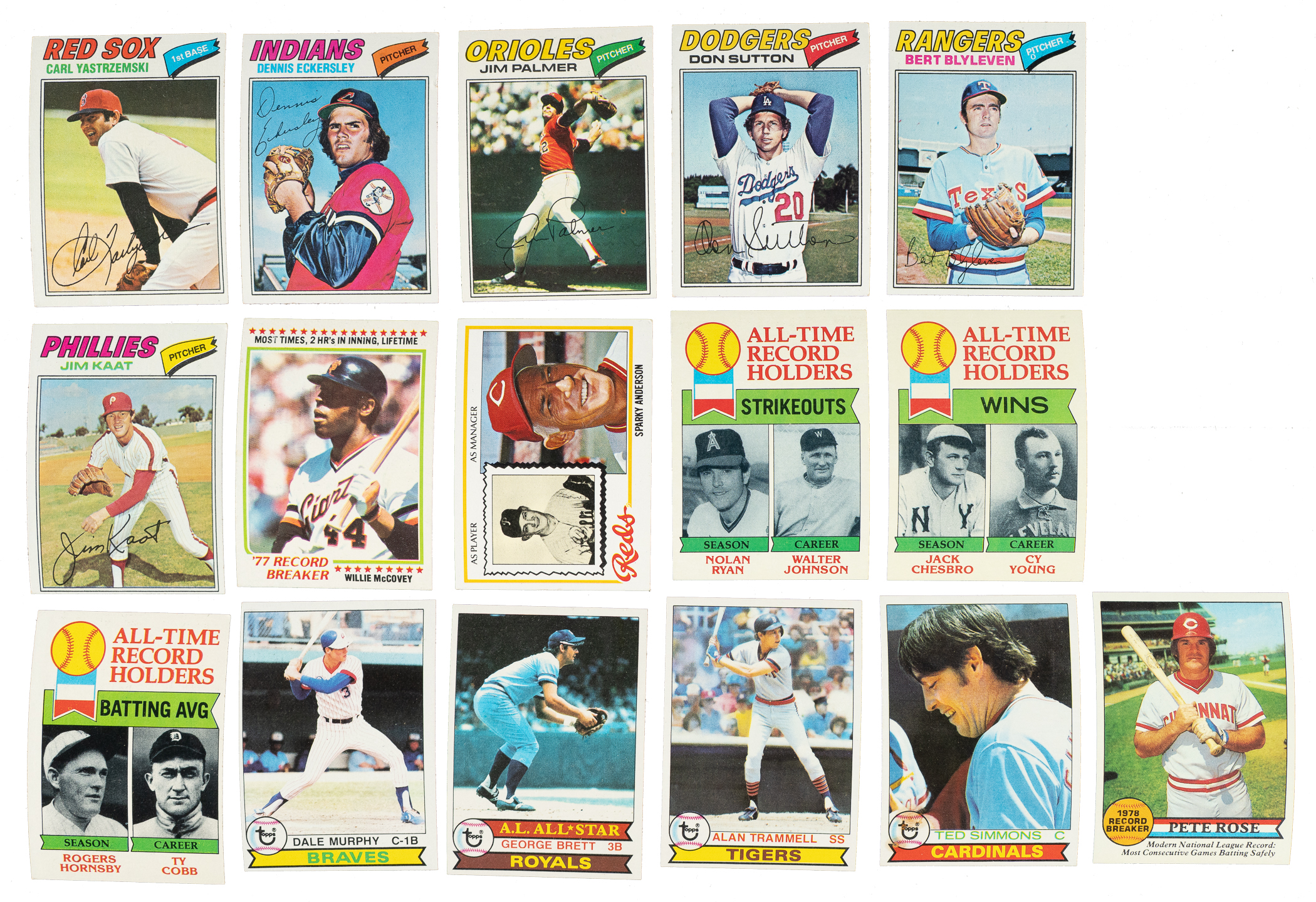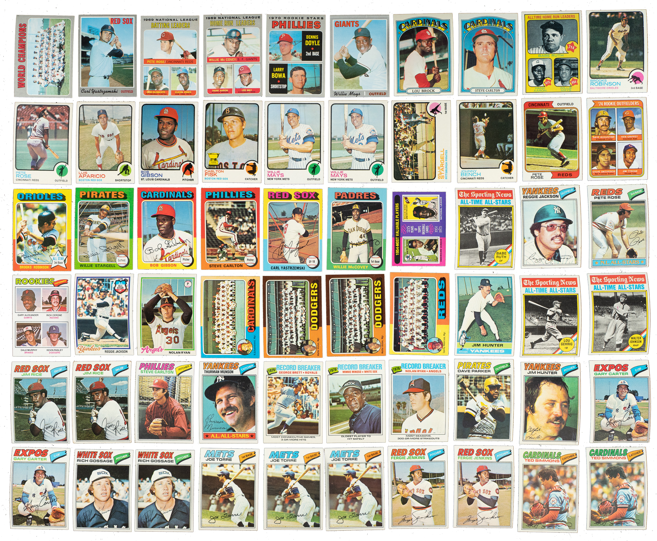 Substantial collection of 3,205 Topps baseball cards spanning the years 1970 to 1979, highlighted by 120 Hall of Famers, including Willie Mays, Frank Robinson, Roberto Clemente, George Brett, and Nolan Ryan. This collection consists of the following: 1) 1970 Topps (16 cards): Ex to Ex-Mt overall, with one Vg-Ex. Includes: #1 Mets Team (Ex-Mt), 10 Yastrzemski (Ex-Mt), 38, 49, 61 NL Batting Ldrs w/ Rose and Clemente, 64, 65 NL HR Ldrs w/ McCovey and Aaron, 70, 71, 84, 107, 115, 347, 539 Bowa RC, 600 Mays (Ex due to centering), and 634. 2) 1971 Topps (9 cards): Ranging from Vg/Vg-Ex to Nr/Mt (averaging Ex/Ex-Mt). Includes: #10, 17, 202, 293, 550 Killebrew (20/80 L/R, otherwise Ex-Mt+), 587, 640 F. Robinson (Ex-Mt), 674, and 751. 3) 1972 Topps (616 cards, 368 different): 29% Nr/Mt or better, 61% Ex to Ex-Mt, and 10% Vg to Vg-Ex (including a couple lesser and a couple with a slight miscut). Includes twenty-seven cards from the high-number series (#657-787). Keys: #49 Mays (Ex+), 51 Killebrew (Vg-Ex+), 87 NL RBI Ldrs w/ Torre/Stargell/Aaron, two 154 Simmons, 195 Cepeda, 200 Brock (Ex+), three 240 Allen, 241 Fingers, two 313 Aparicio, two 400 Oliva, 420 Carlton (Vg-Ex), 449 Lemon, two 451 La Russa, two 515 Blyleven, and 709 Kaat (Ex-Mt due to centering). 4) 1973 Topps (129 cards, 121 different): 36% Nr/Mt or better, 54% Ex to Ex-Mt, and 10% Vg to Vg-Ex Keys: #1 Ruth/Mays/Aaron (Ex-Mt), 50 Clemente (Ex-Mt), 90 B. Robinson (Ex-Mt), 130 Rose (Nr/Mt), 165 Aparicio, 190 Gibson, 193 Fisk (Ex), 230 Morgan, 237 Mathews, 257 Berra, two 305 Mays (Nr/Mt+ and Ex+), 370 Stargell, 380 Bench (Ex), 400 Perry, 472 Gehrig ATL, 480 Marichal, and two 609 Lopes RC. 5) 1974 Topps (373 cards, 279 different) Plus 82 Traded: 55% Nr/Mt to Nr/Mt-Mt (including a few Mint), 40% Ex to Ex-Mt, and 5% Vg to Vg-Ex. Keys: #4 Aaron Special, 35 Perry, 70 Allen, 179 Berra MGR, 190 Oliva, 197a/Washington, three 260 Simmons, two 270T Santo Traded, 300 Rose (Nr/Mt-Mt), 330T Marichal Traded, 387a/Washington, 440 Kaat, 542 Gossage, and 598 Griffey Sr. RC. Includes near-complete set of 41 different cards (out of 44) from the traded series. 6) 1975 Topps (594 cards, 303 different): 34% Nr/Mt to Nr/Mt-Mt, 53% Ex to Ex-Mt, and 13% Vg to Vg-Ex. #192 MVPs and 660 Aaron are minis. Keys: Two #7 Busby/Bosman/Ryan HL, 35 Santo, 50 B. Robinson (Nr/Mt), 60 Jenkins, 75 Simmons, 100 Stargell, two 130 Niekro, 150 Gibson (Nr/Mt-Mt), 185 Carlton, 220 Sutton, two 243 Kaat, 280 Yastrzemski (Nr/Mt), two 325 Lopez, 400 Allen, 450 McCovey, 560 Perez, and 660 Aaron (Ex, Mini). 7) 1976 Topps (137 cards, all different): 54% Nr/Mt to Nr/Mt-Mt, 41% Ex to Ex-Mt, and 5% Vg to Vg-Ex. Keys: #100 Hunter, 341 Gehrig ATAS, 345 Ruth ATAS (Ex-Mt), and 349 Johnson ATAS. 8) 1977 Topps (1,088 cards): 15% Nr/Mt to Nr/Mt-Mt, 64% Ex to Ex-Mt, and 21% Vg to Vg-Ex. Keys: #1 Brett/Madlock LL, 10 Jackson (Gd), two 60 Rice, 110 Carlton, 170 Munson, 231 Brett RB, 232 Minoso RB, 234 Ryan RB (Nr/Mt+), 270 Parker, 280 Hunter, two 295 Carter, two 319 Gossage, three 425 Torre, two 430 Jenkins, 450 Rose (Vg-Ex), two 470 Simmons, 476 Murphy RC (Nr/Mt-Mt), 480 Yastrzemski, two 488 Clark/Mazzilli RC525 Eckersley, 600 Palmer, 620 Sutton, 630 Blyleven, 631 Brett Brothers and 638 Kaat. 9) 1978 Topps (84 cards, all different): 16% Nr/Mt to Nr/Mt-Mt, 62% Ex to Ex-Mt, and 22% Vg to Vg-Ex. Keys: #200 Jackson (Vg-Ex+) and 400 Ryan (Ex-Mt). 10) 1979 Topps (159 cards, all different): 18% Nr/Mt to Nr/Mt-Mt, 61% Ex to Ex-Mt, and 21% Vg to Vg-Ex. Keys: #39 Murphy, 204 Rose RB, 330 Brett (Nr/Mt-Mt), 358 Trammell, and 510 Simmons. This is an extremely impressive and sizable collection of cards from these classic sets with scores of stars and Hall of Famers. Total: 3,205 cards. The size/weight of this item requires that there will be an additional shipping charge for this lot.