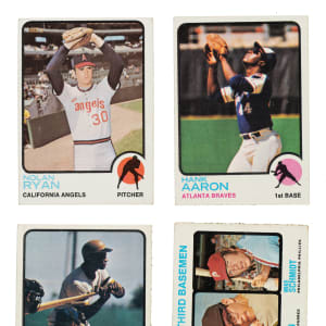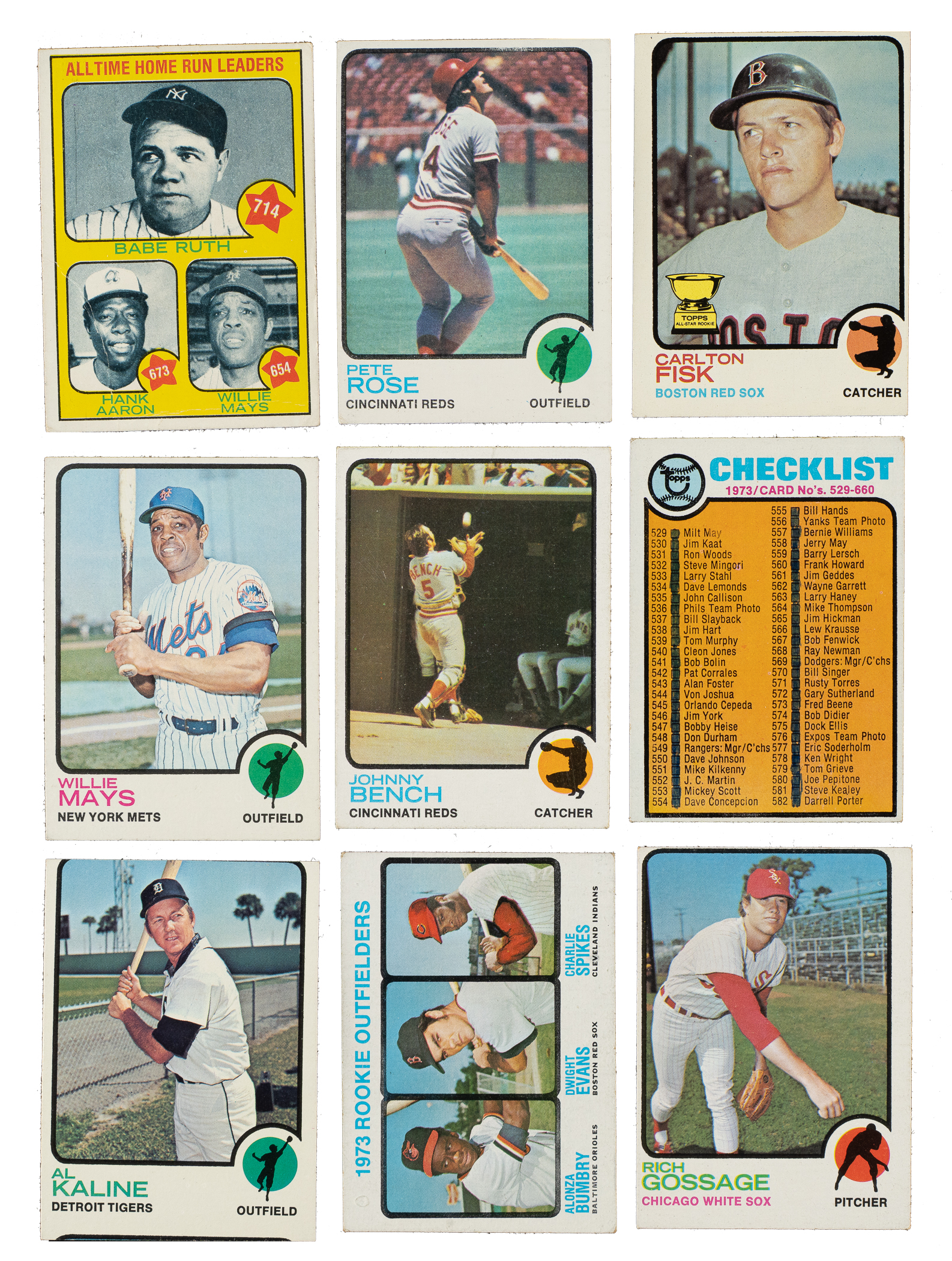 Presented is a near-complete set of the 1973 Topps series consisting of 659 different cards, out of 660 in the set. The rookie cards of Hall of Famers Mike Schmidt and Rich Gossage, as well as the final cards of Roberto Clemente and Willie Mays, highlight the 1973 Topps issue, one of the most popular sets of the 1970s. Missing only #420 for completion. Includes three duplicates (#62, 126, and 145). Condition is Vg-Ex to Ex-Mt overall, averaging Vg-Ex+/Ex, with many of the cards crisp and clean but technically grading lesser due to centering issues. Keys: #1 Ruth/Mays/Aaron (Gd), 50 Clemente (Ex), 100 Aaron (Ex), 130 Rose (Vg-Ex), 174 Gossage RC (Vg), 193 Fisk (Vg-Ex), 220 Ryan (Vg-Ex), 280 Kaline (miscut, no top border, otherwise Ex), 305 Mays (Ex), 380 Bench (Vg), 614 Evans RC (Vg), and 615 Schmidt RC (Vg). This is a very attractive 1973 Topps near-complete set (minus one) with numerous highlights. Total: 662 cards. The size/weight of this item requires that there will be an additional shipping charge for this lot.