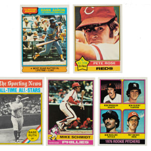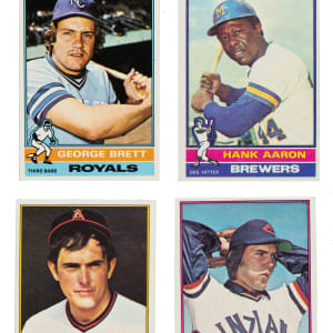 Presented is a very attractive 660-card complete set of 1976 Topps Baseball, plus three traded series cards. The set is highlighted by dozens of stars and Hall of Famers, including Nolan Ryan, George Brett, Dennis Eckersley (rookie), and the final card of Hank Aaron. Condition is Ex to Nr/Mt overall, averaging Ex-Mt, with all cards bright and clean and centering responsible for technical downgrades on many cards. Keys: #1 Aaron RB (Ex-Mt), 19 Brett (Nr/Mt), 98 Eckersley RC (miscut, otherwise Ex+), 240 Rose (Ex-Mt), 330 Ryan (Ex-Mt), 345 Ruth ATAS (Ex+), 480 Schmidt (Ex), 550 Aaron (Ex+), and 599 Guidry RC (Ex-Mt). Total: 663 cards. The size/weight of this item requires that there will be an additional shipping charge for this lot.