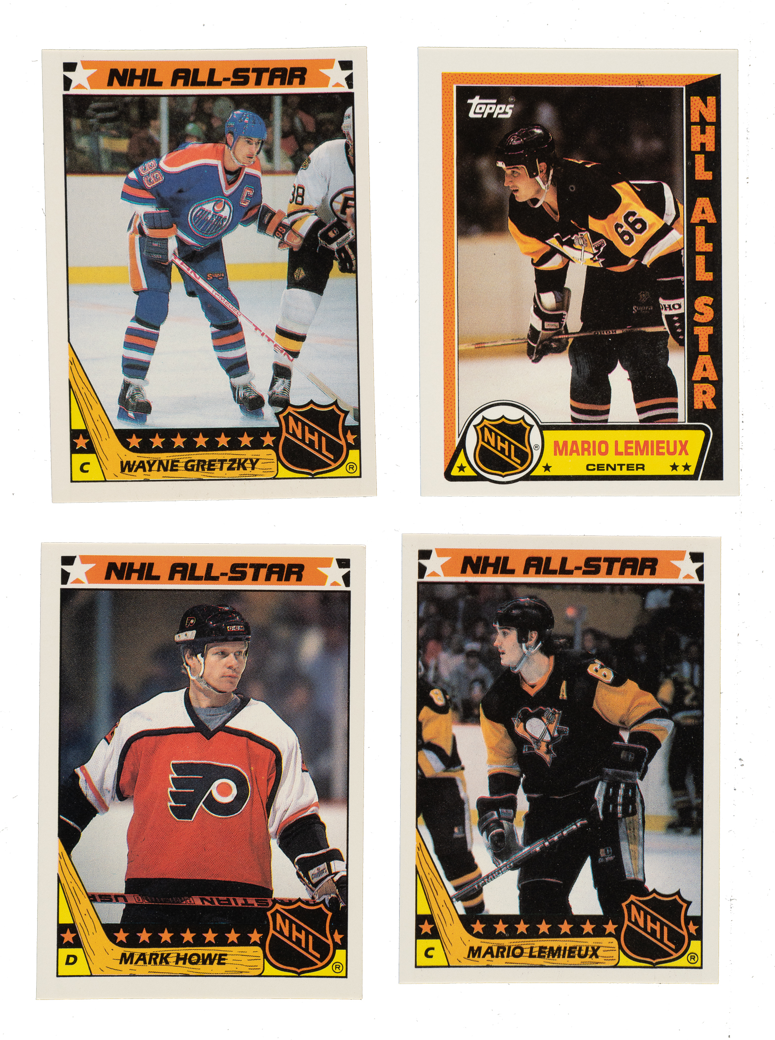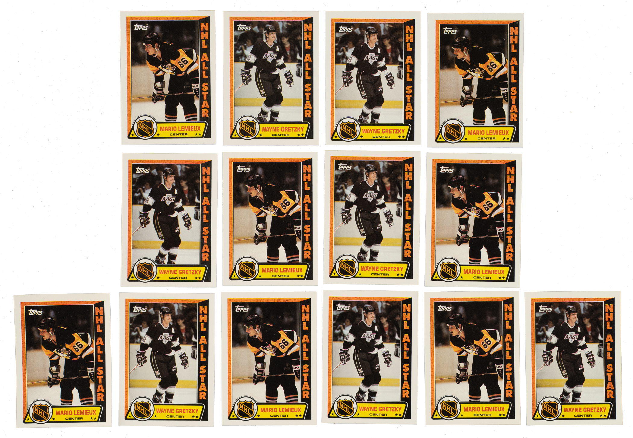 Presented is a very substantial collection of 1987-1988 and 1989-1990 Topps Hockey stickers, including seven complete sets. Condition is 90% ranging from Nr/Mt to Mint (averaging Nr/Mt-Mt) and 10% lesser (mostly Ex to Ex-Mt). This collection consists of the following: 1) 1987-1988 Near-Complete Set (32/33): Missing only #19 for completion. Includes duplicate #20. Keys: #5 Gretzky (Nr/Mt+), and 11 Lemieux (Nr/Mt). 2-8) Seven 1989-1990 Complete Sets (7 sets, 33 cards per set): Keys: Seven #3 Lemieux (Nr/Mt-Mt overall, with one Nr/Mt and a couple bordering on Mint) and seven 11 Gretzky (Nr/Mt-Mt overall, with one Nr/Mt and a couple bordering on Mint). 9) 1989-1990 Near-Complete Set (30/33) Plus 203 Duplicates: The duplicates are mostly common players and team stickers. Missing the following three cards for completion: #4, 11 Gretzky, and 20. Key: #3 Lemieux (Nr/Mt-Mt). Total: 497 cards. The size/weight of this item requires that there will be an additional shipping charge for this lot.