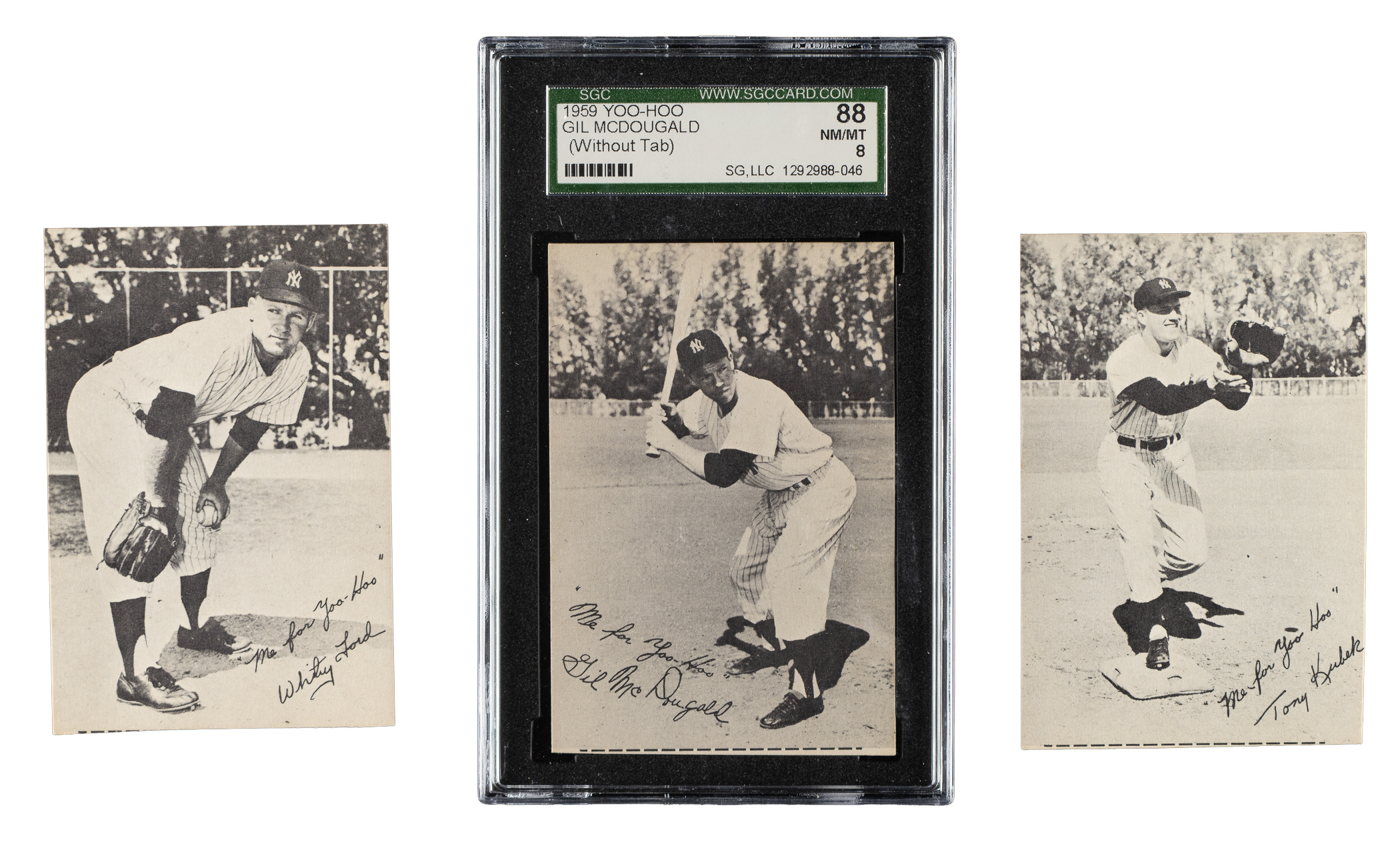 Trio of 1959 Yoo-Hoo cards, featuring New York Yankees Hall of Famer Whitey Ford. This collection consists of the following (all without tabs): Ford (Ex), Kubek (Ex), and McDougald (SGC NM/MT 88). Total: 3 cards.