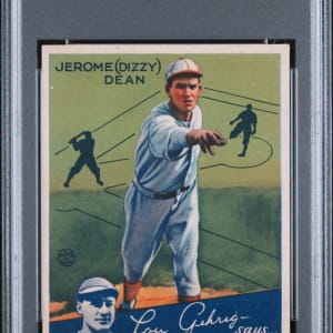 Graded NM 7 by PSA. High-grade example of St. Louis Cardinals Hall of Famer Dizzy Dean from the 1934 Goudey Gum set. Regarded by many as the greatest pitcher of all time, Dean’s pitching career began in 1932 and was brief but spectacular. From 1932 to 1936 he won 120 games, including 30 in 1934. He was also one of the game’s most popular and irrepressible characters, and the central figure of St. Louis’ legendary “Gas House Gang” of the 1930s. The offered card has vibrant colors, an extremely sharp image, and strong corners with light touches of wear. Clean reverse with boldly printed green text. This is a superb high-grade example of one of the most popular Hall of Famers of the 1930s.