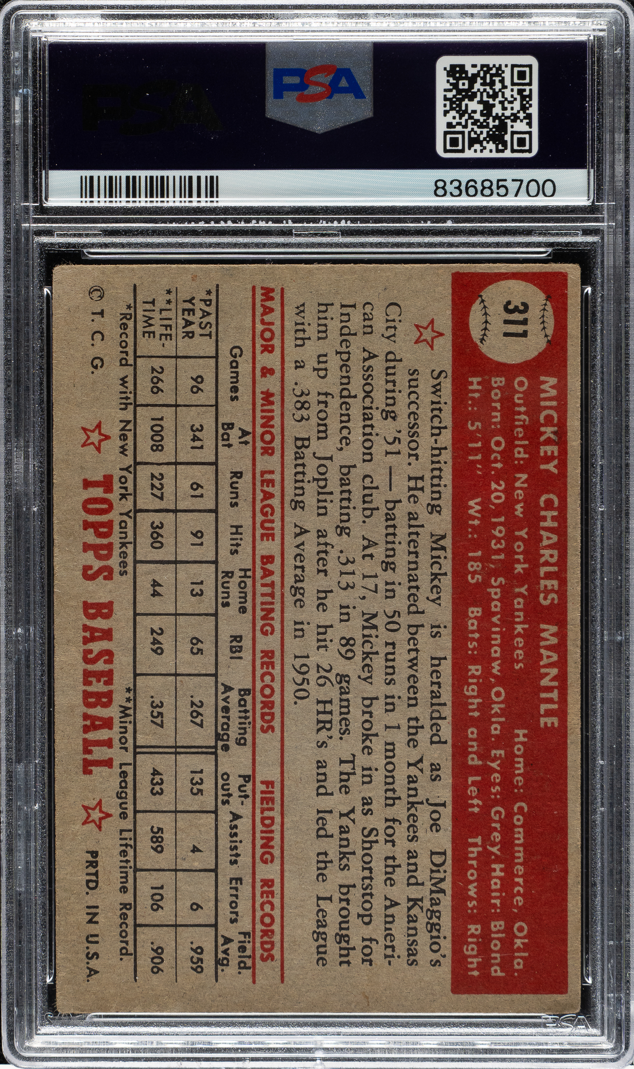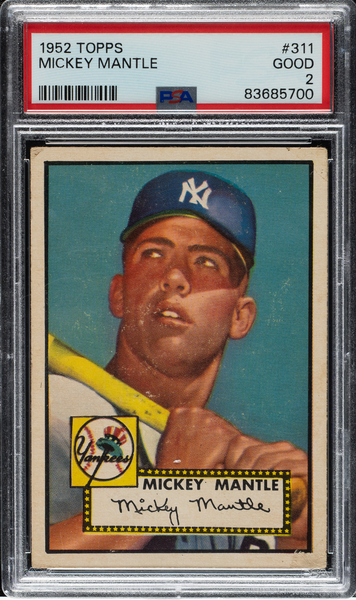 Graded GOOD 2 by PSA. One of card collecting's classics, Mantle's #311 Topps rookie card is the key to the 1952 set, one of the most famous of all cards, and the single most popular and valuable postwar baseball card. In August 2022, an SGC MINT+ 9.5 example sold at public auction for $12.6 million, a record at that time for any sports card. Do not be fooled by the modest assigned grade! This example has brilliant colors, outstanding registration, honest corner wear, and outstanding centering. Clean reverse. It presents at a level far better than its assigned grade, which is the result of minor areas of surface wear along the front. This card presents an outstanding opportunity to acquire a visually appealing example of Mickey Mantle's most celebrated card in an extremely desirable condition, yet very possibly at a small fraction of the cost of a higher-grade example with the same eye appeal.