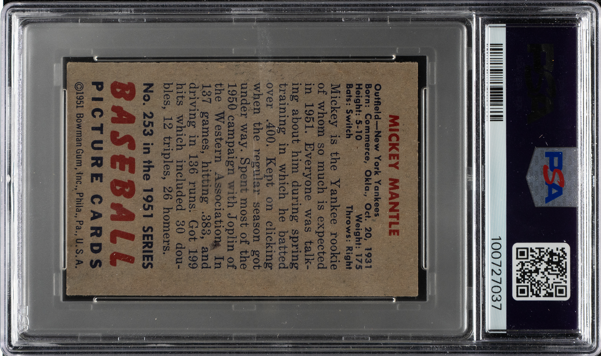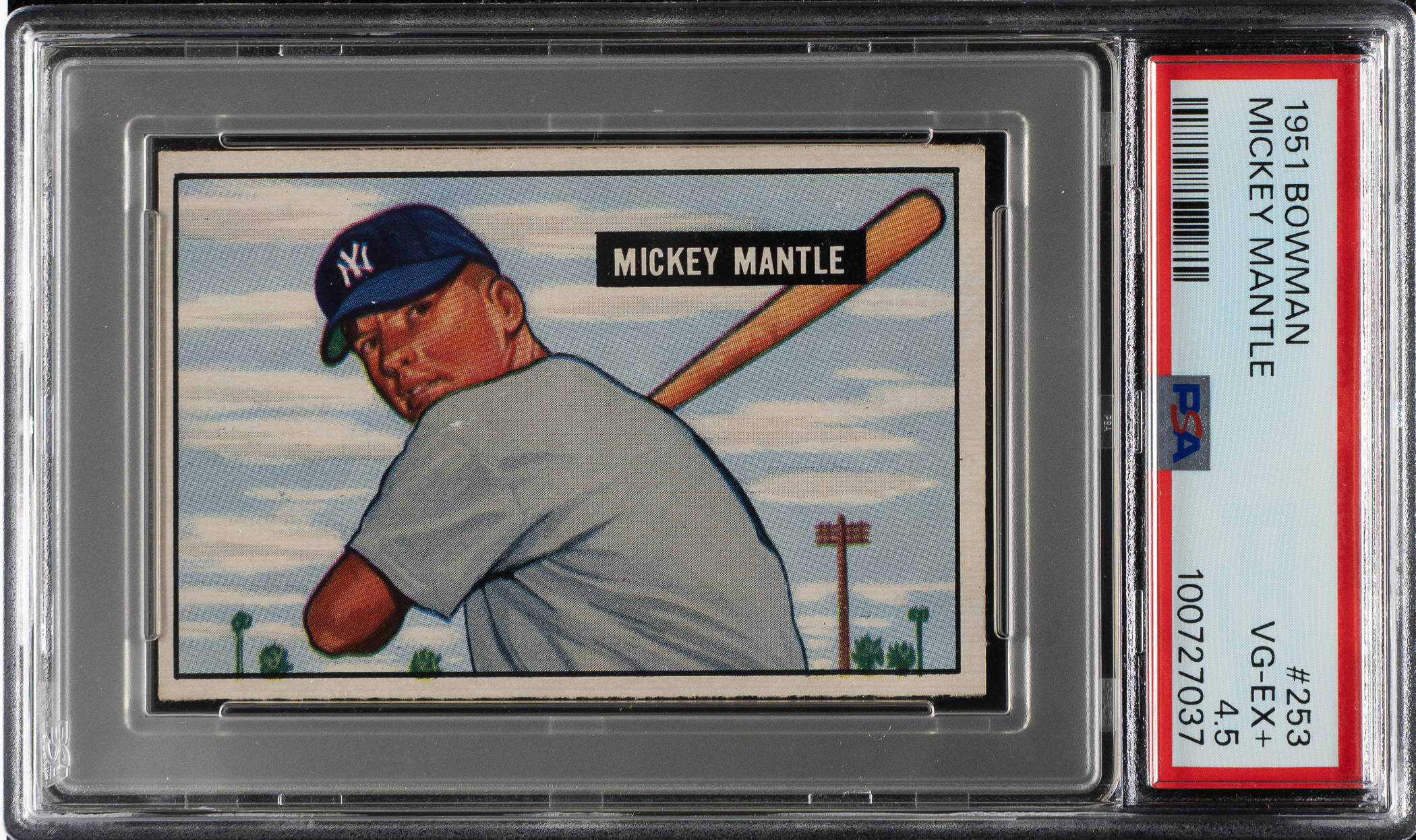 Graded VG-EX+ 4.5 by PSA. Attractive mid-grade example of New York Yankees Hall of Famer Mickey Mantle's true rookie card. One of card collecting's classics, Mantle's Bowman rookie card is the key to the 1951 set and one of the most popular of all postwar baseball cards. This example has bright colors, a crisp image, and light corner wear. Mainly clean with no distracting print lines that are commonly found with this card. Boldly printed reverse. A small patch of extra ink is visible near the right edge of the reverse. This is a solid mid-grade example of one of Mantle's most desirable and significant cards.