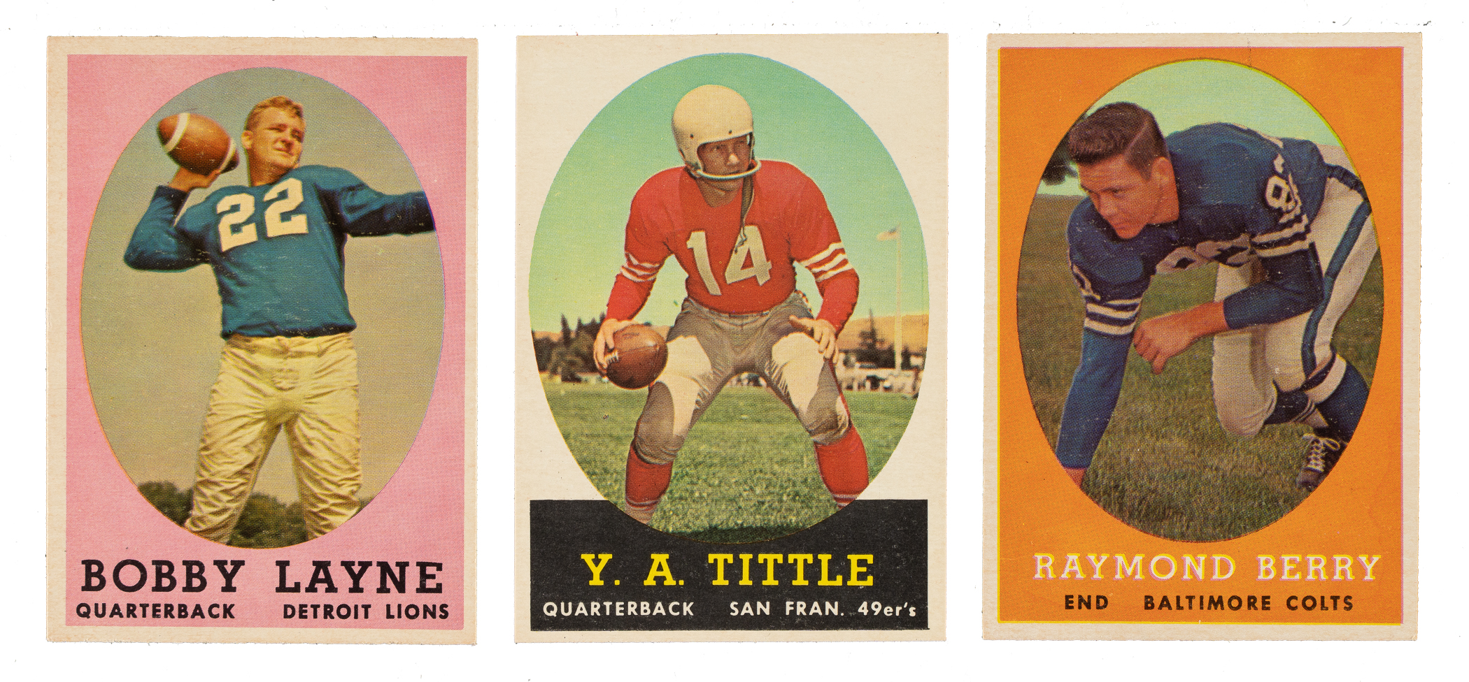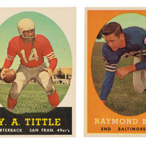 Presented is a near-complete set of 1958 Topps football consisting of 131 different cards (out of 132 in the set), highlighted by thirty-three Hall of Famers, including Bart Starr, Frank Gifford, and the rookie card of Sonny Jurgensen. Missing only #62 J. Brown for completion. Condition is32% Nr/Mt to Nr/Mt-Mt (mostly Nr/Mt), 60% Ex to Ex-Mt, and 8% Vg to Vg-Ex. Keys: #2 Layne (Nr/Mt), 22 Unitas (Vg-Ex+), 66 Starr (25/75 T/B, otherwise Nr/Mt), 73 Gifford (Ex+), 86 Tittle (Nr/Mt-Mt), 90 Jurgensen RC (Ex+), 120 Berry (Nr/Mt+), and 129 Blanda (Ex-Mt). This is a crisp and clean near-complete set (minus one) of this popular football issue. Total: 131 cards.