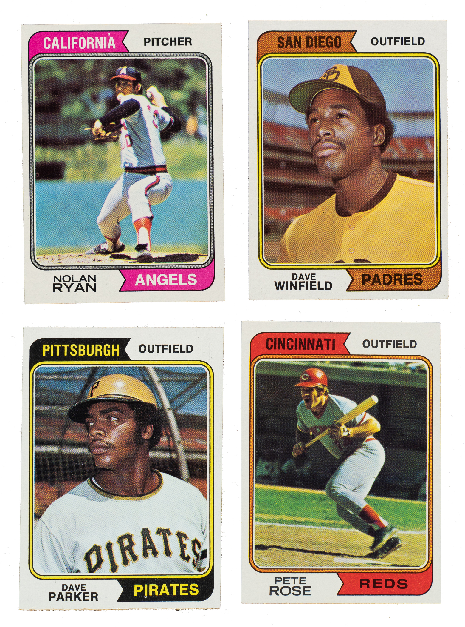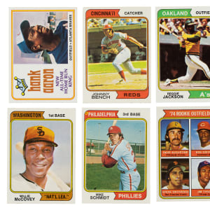 Presented is a very attractive and mostly high-grade complete master set of 1974 Topps baseball cards consisting of the following: complete 660-card basic set, 44-card Traded series, 24-card Team Checklists set, all fifteen "Washington, Nat'l" variations, and variations for cards #608, 599, and 654. Condition of the base set is 65% Nr/Mt to Nr/Mt-Mt (including some Mint) and 35% Ex to Ex-Mt (including 4% slightly lesser). Keys: #1 Aaron (Ex-Mt+), 10 Bench (Vg-Ex+), 20 Ryan (Ex-Mt), 130 Jackson (Nr/Mt-Mt), 250a McCovey/Washington (Nr/Mt-Mt), 252 Parker RC (Nr/Mt-Mt), 283 Schmidt (wax on reverse, otherwise Ex-Mt), 300 Rose (Nr/Mt-Mt), and 456 Winfield RC (Nr/Mt+). Condition of the Traded set is Nr/Mt to Nr/Mt-Mt overall, with 10% slightly lesser. Condition of the team checklists ranges from Vg-Ex to Nr/Mt (averaging Ex/Ex-Mt). This is an outstanding complete 1974 Topps master set. Total: 746 cards.