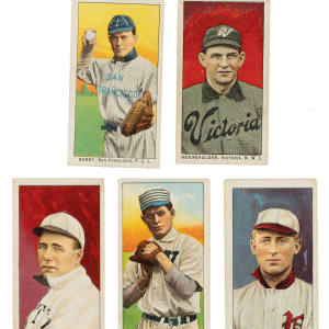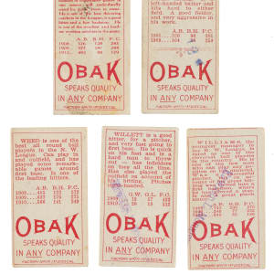 Collection of five 1911 T212 Obak Cigarettes cards. This collection consists of the following: Berry (Pr), Householder (factory hand stamp on reverse, otherwise Vg), Weed (Vg+), Willett (collector's hand stamp on reverse, otherwise Vg), and Williams (collector's hand stamp on reverse, otherwise Vg). Total: 5 cards.