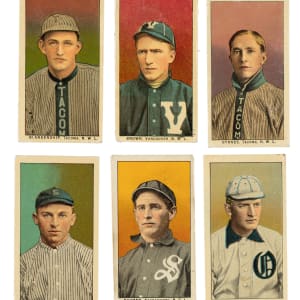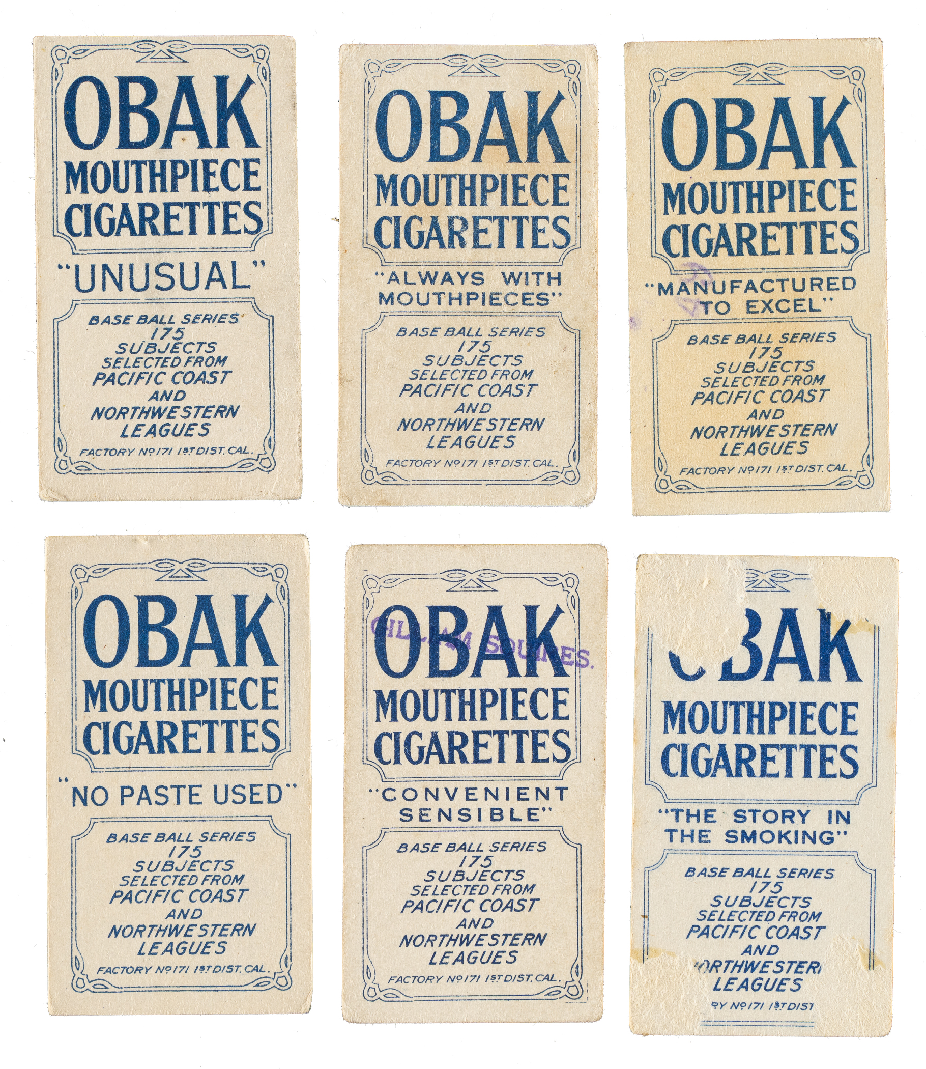 Collection of six 1910 T212 Obak Cigarettes "175 Subjects" cards. This collection consists of the following: Blankenship (slight trim to top edge, otherwise Gd), Brown (slight trim to top edge, otherwise Gd+), Byrnes (original ink stamp on reverse, otherwise Vg), Ostdiek (Vg), Raymer (collector's rubber stamp on reverse, otherwise Vg), and Wolverton (Pr). Total: 6 cards.