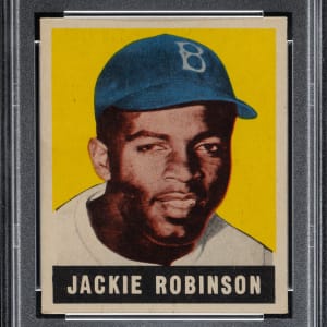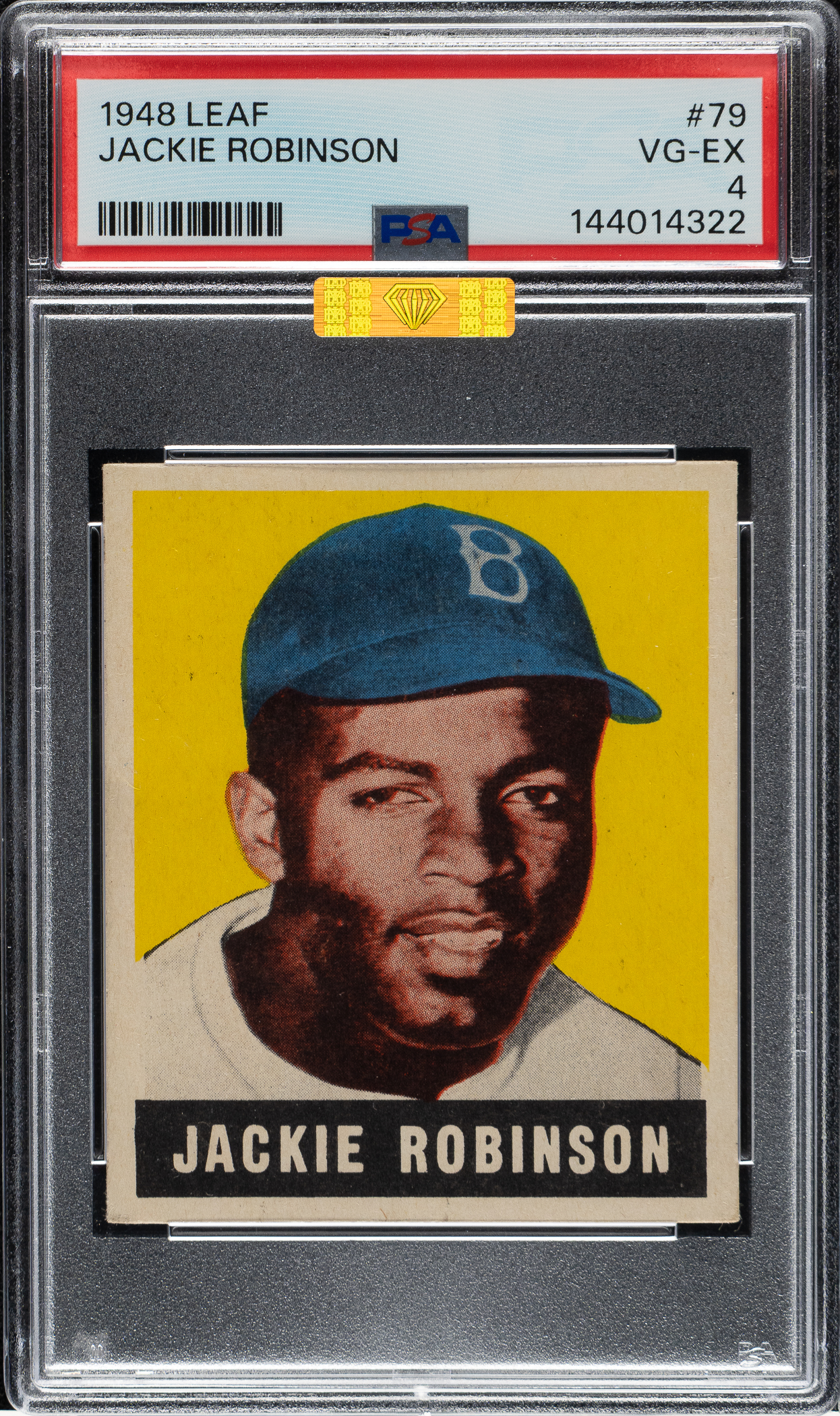 Graded VG-EX 4 by PSA. Beautiful example of this classic rookie card featuring Brooklyn Dodgers Hall of Famer Jackie Robinson. The 1948-1949 Leaf bubble-gum card of Robinson is one of the most popular, striking, and classic of all his cards. The offered card features vibrant colors, outstanding registration, and four strong corners. Clean reverse. An exceptionally attractive example of this classic card which presents at a level far superior than suggested by its technical grade. Awarded an MBA Gold Diamond by Mike Baker Authenticated for high-end eye appeal. A corresponding MBA sticker is affixed to the front of the holder.