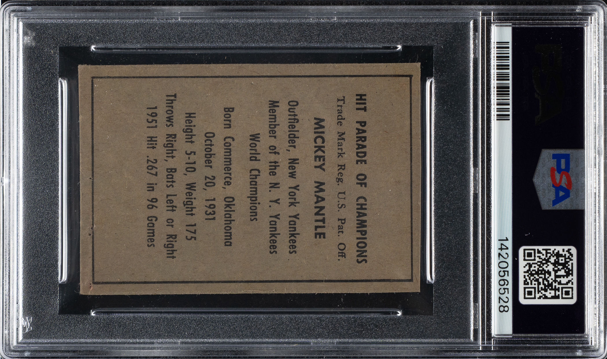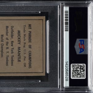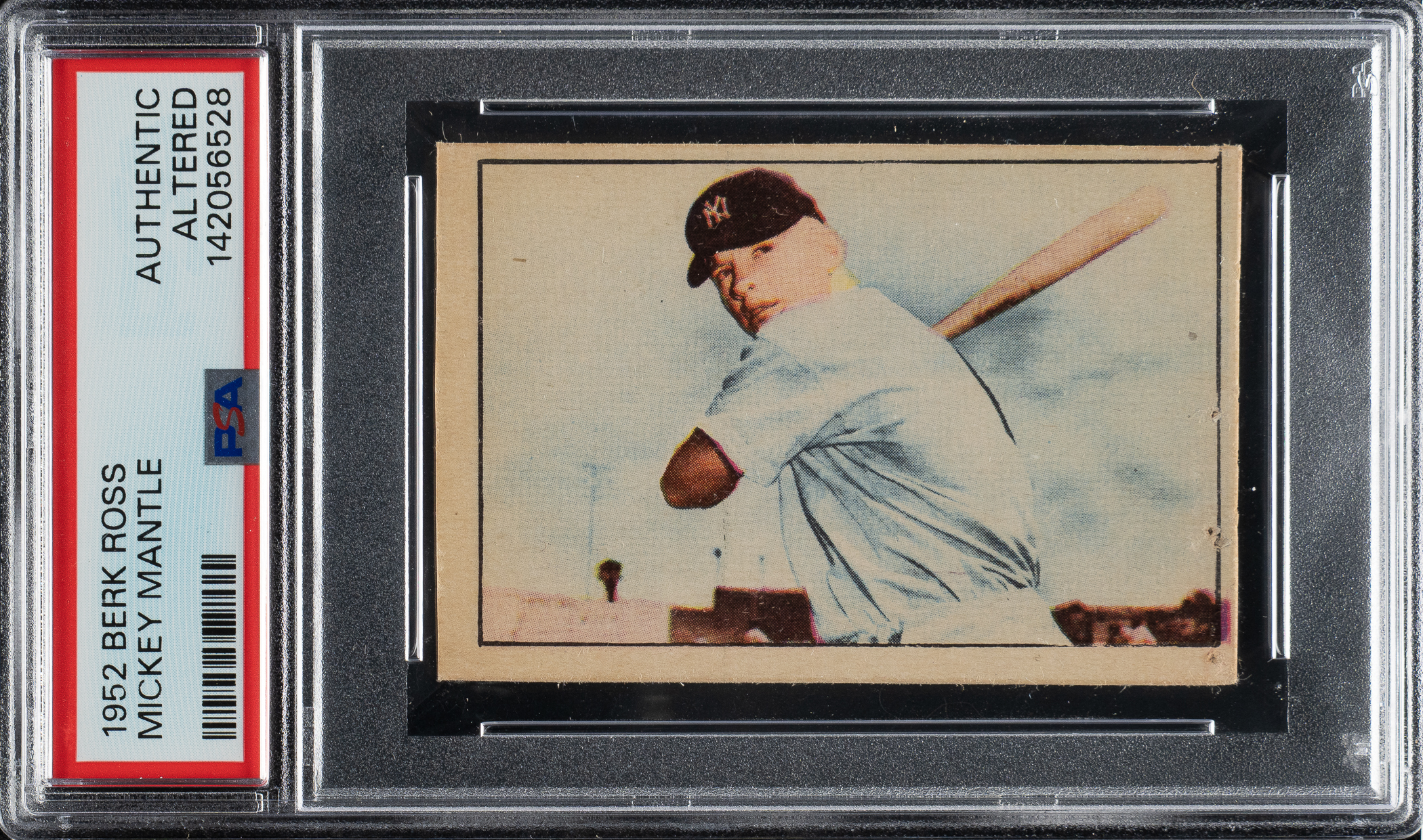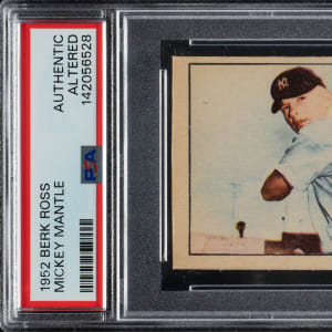 Encapsulated as "Authentic - Altered" by PSA. New York Yankees Hall of Famer Mickey Mantle. A staple hole is present on the right edge, and there is a tiny pinhole on the right corner, which has been filled in.