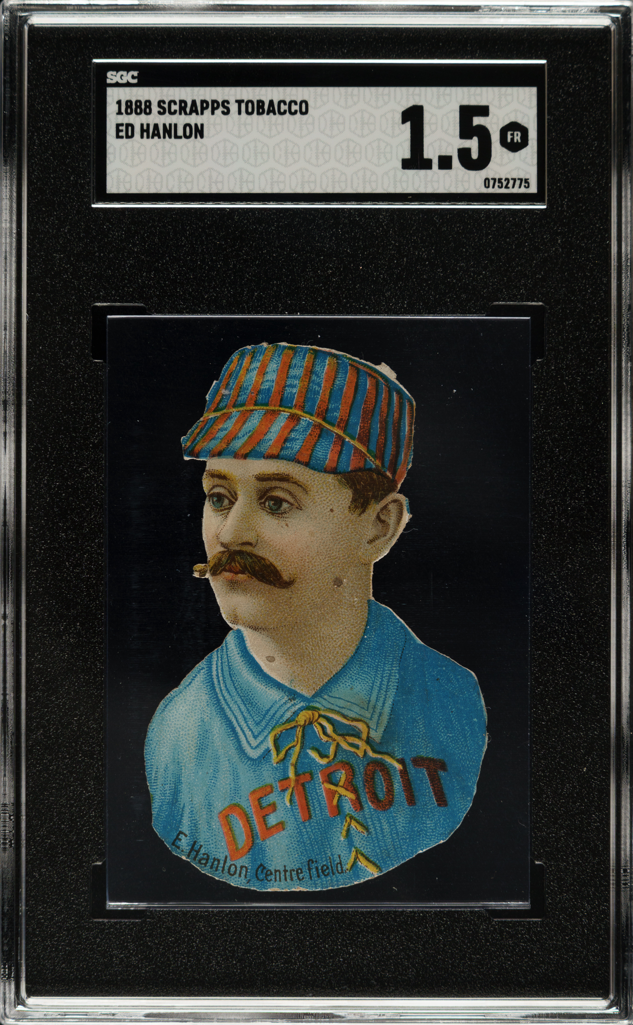 Graded FAIR 1.5 by SGC. Very appealing example of this early classic card of Hall of Famer Ned Hanlon from the unusual 1888 H. D. Smith & Company Baseball Gum Card Die-Cuts series. This uniquely designed issue features nine players from the American Association’s legendary St. Louis Brownie Champs and nine players from the Detroit Wolverines. It is one of only a few full-color baseball issues from the nineteenth century and also one of the most distinctive and unusual of all early baseball card sets. For decades, the set was referred to as "Scrapps" or "Scrapps Tobacco," but recent extraordinary newspaper archive research has finally allowed for the definitive identification of the issuer: H. D. Smith & Company, a Cincinnati Candy and Gum manufacturer. The hobby has long known that these die-cuts were not actually issued by "Scrapps Tobacco" (as no brand of that name has ever been found) but we personally never thought we would ever learn exactly how they were issued. The fact is, they were actually issued as premiums with gum! These cards were intended to be glued into scrapbooks and almost always display evidence of glue residue or album removal on the reverse. The offered example is no exception. The card presents with bold colors on the front but ultimately grades very modestly due to evidence of album removal on the reverse. Despite this flaw, this is a very high-quality Hall of Famer example with strong visual appeal.