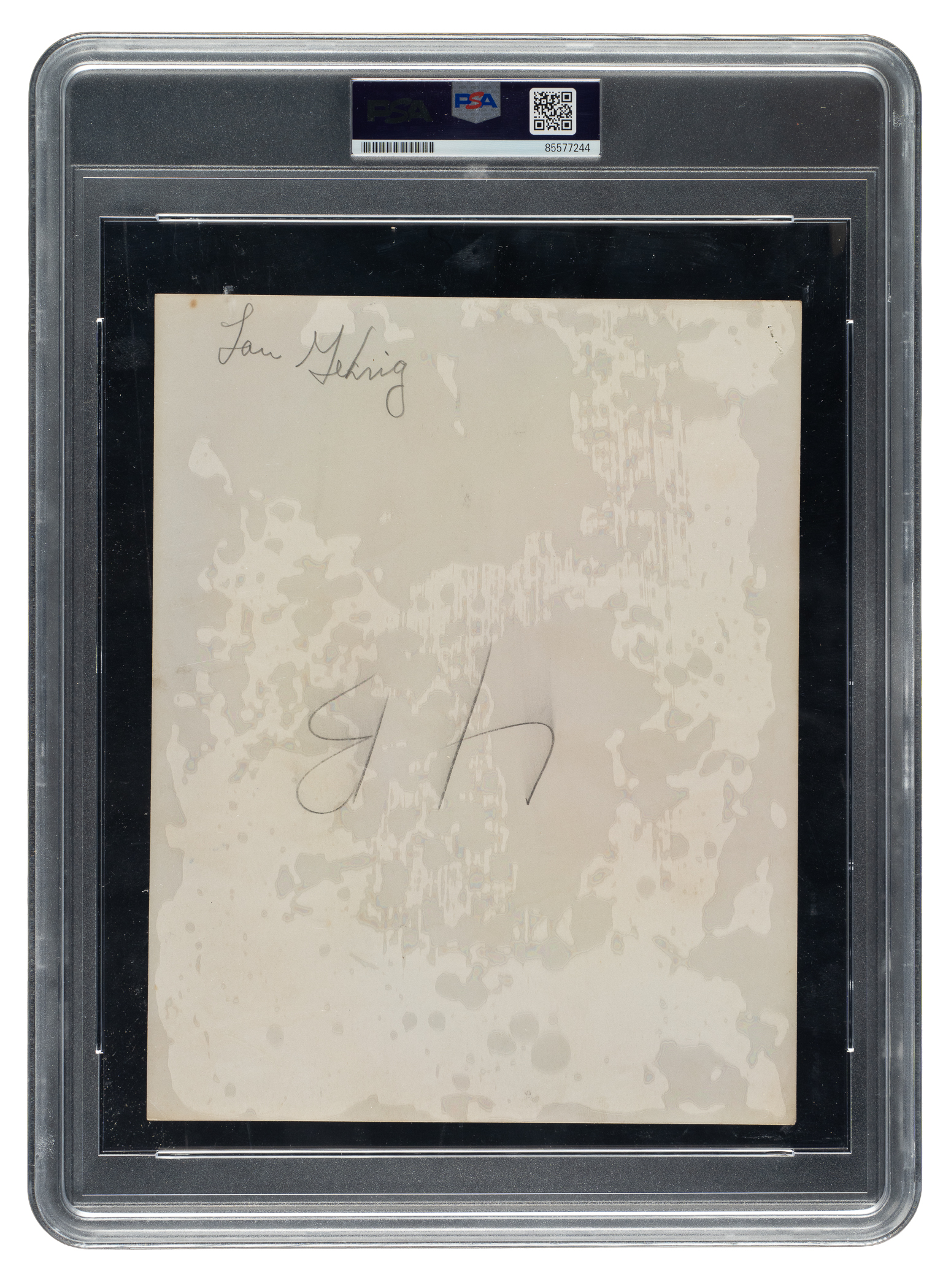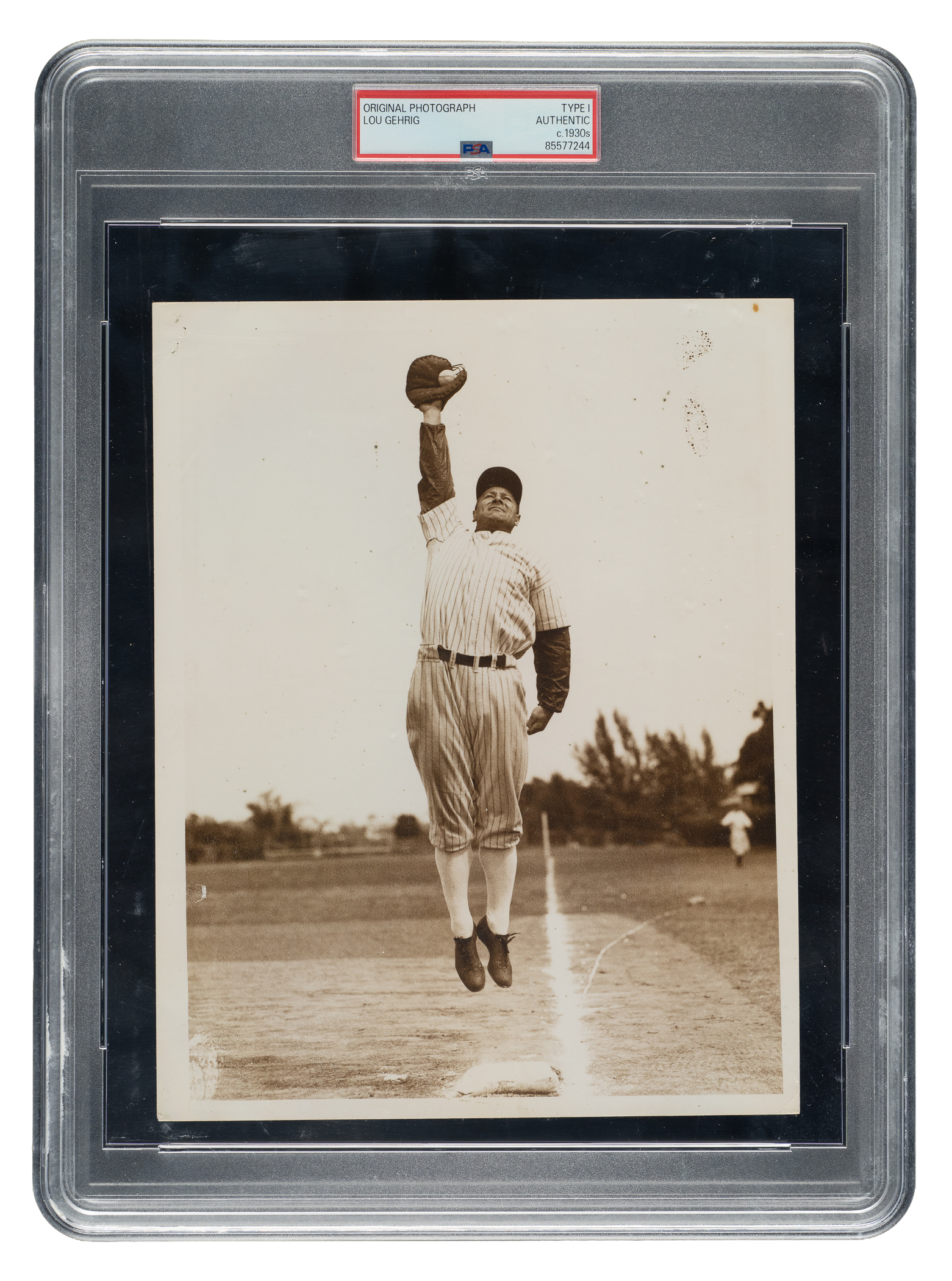 Original photo picturing New York Yankees Hall of Fame first baseman Lou Gehrig during spring training, circa 1930s. Encapsulated and certified as an original Type I photograph by PSA/DNA. The image captures Gehrig as he leaps in the air to catch the ball during practice. Gehrig's name is written in pencil on the reverse. The photo (7 x 9 inches) displays light creasing, a staple hole on the upper-left corner, and scattered black markings on the upper-right quadrant. In Good condition overall.