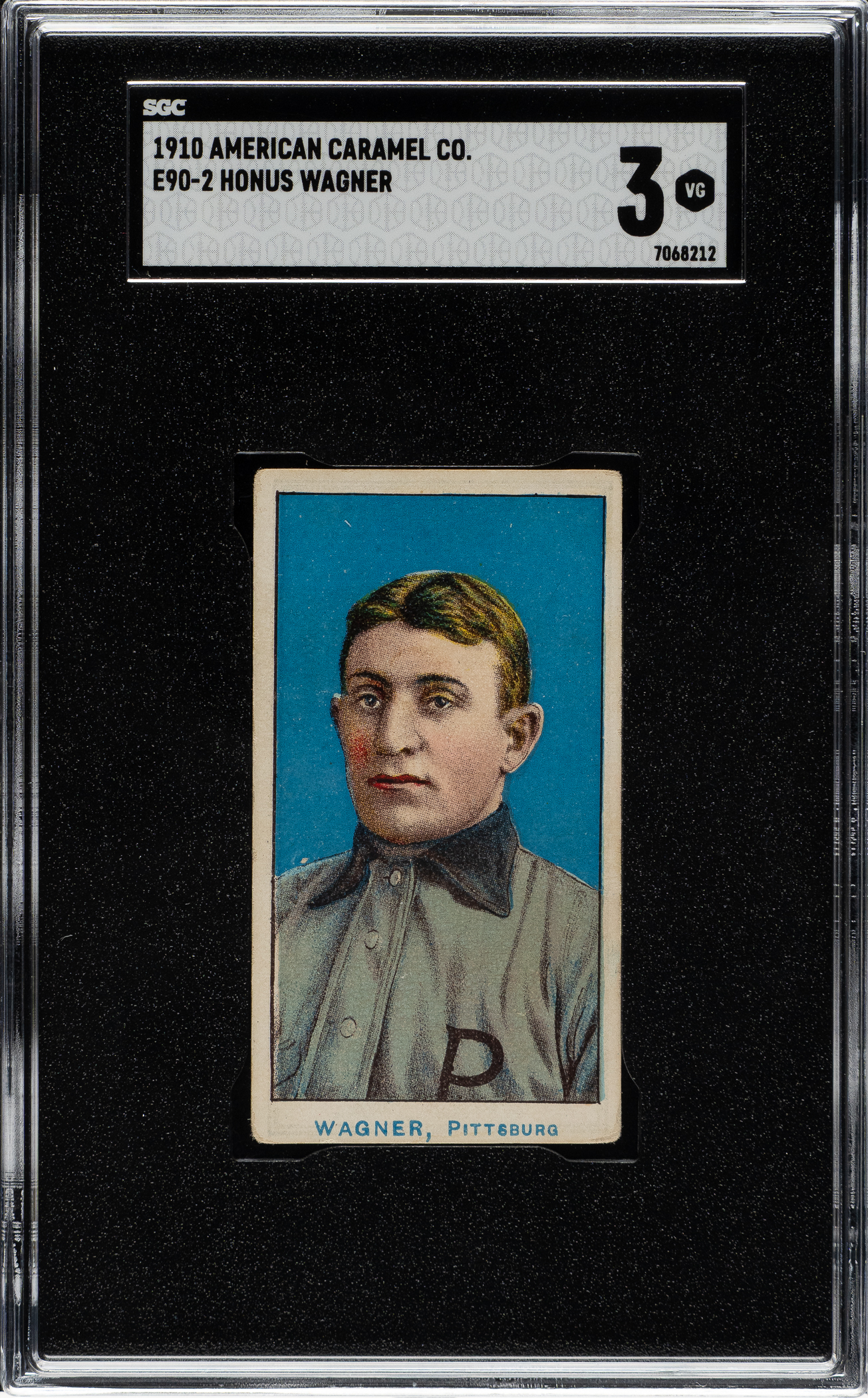 Graded VG 3 by SGC. Presented is the key card from the 1910 E90-2 American Caramel set. This very scarce set was regionally issued in the Pittsburgh area and features only members of the Pirates, the National League champions of the previous year. This is one of Honus Wagner's most striking cards and features a portrait image reminiscent of the pose on his famous T206 card. The offered card features a brilliant blue background, outstanding registration, and honest corner wear. The reverse has light toning. This is a striking example of this card, which is recognized as among the most classic and popular of all 1910-era Honus Wagner cards.