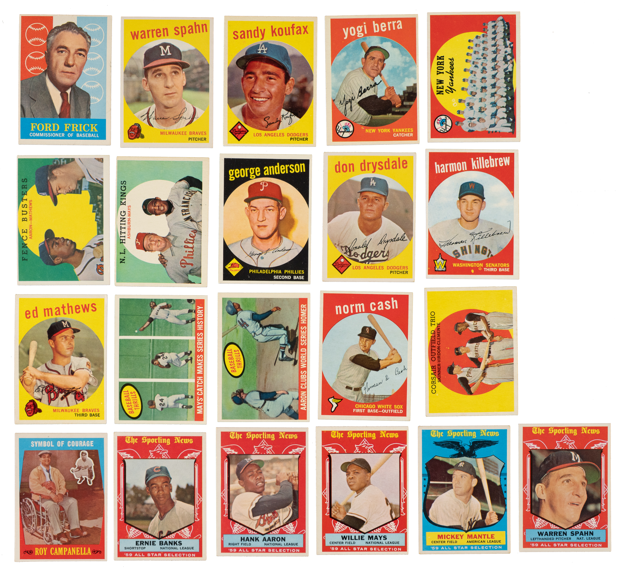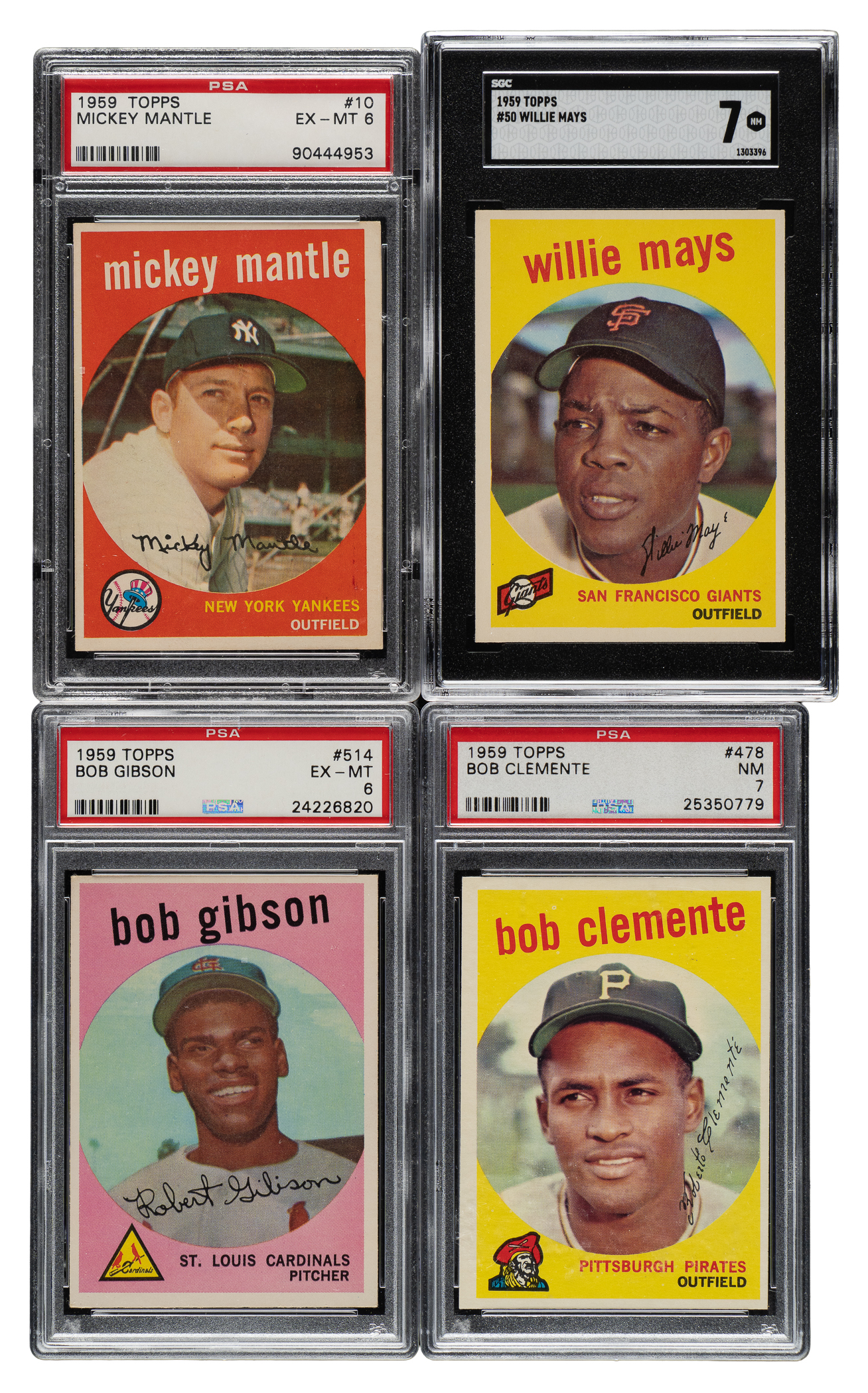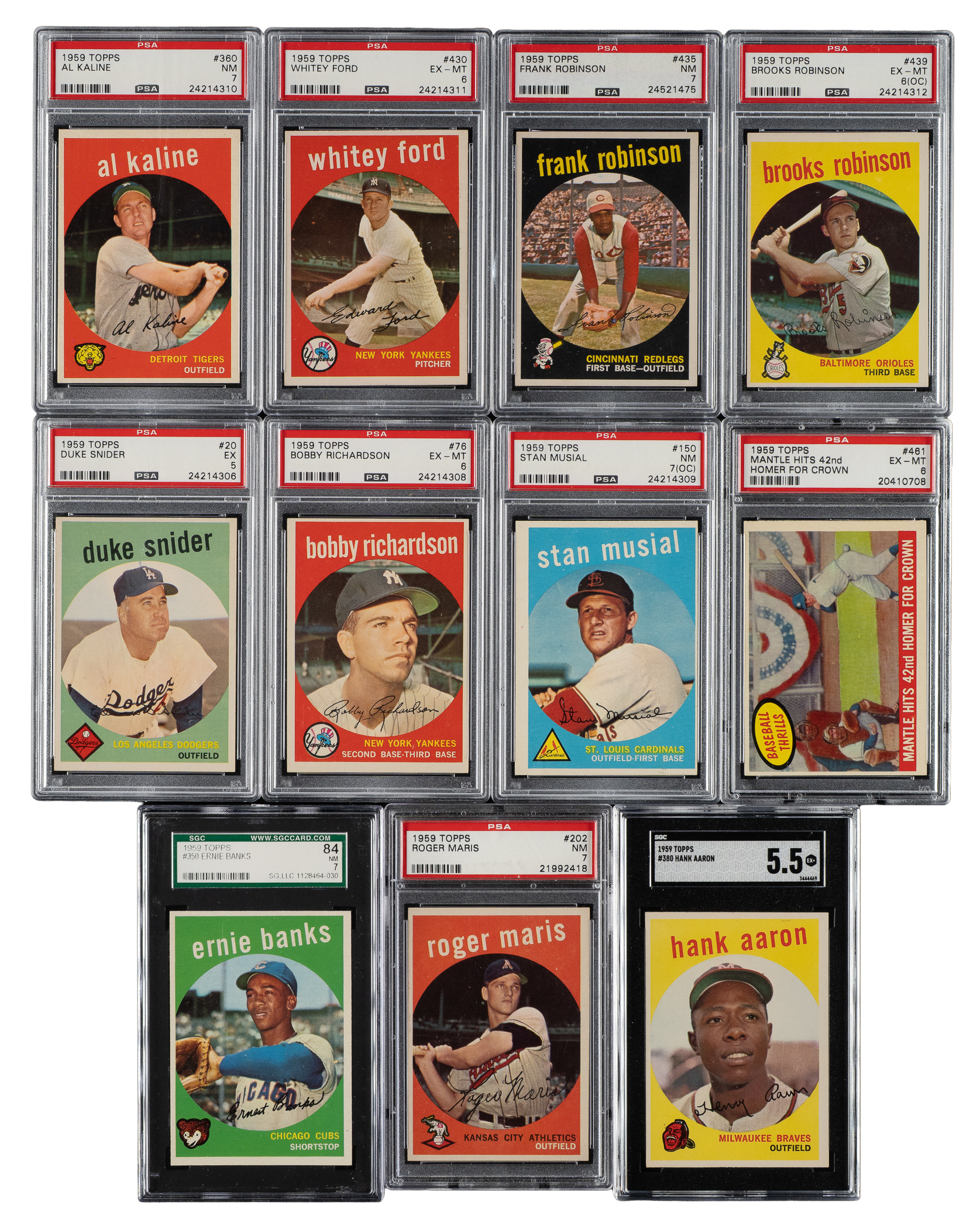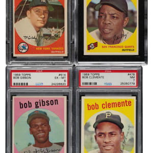 Very attractive and consistent complete set of 1959 Topps baseball. The 1959 Topps set is highlighted by all the stars and Hall of Famers of the era, including the rookie card of St. Louis Cardinal Hall of Famer Bob Gibson. Condition is 20% Ex-Mt to Nr/Mt (approximately two-thirds Ex-Mt), 69% Vg-Ex to Ex, and 11% Gd to Vg (including a couple lesser and six with a slight trim). Fifteen cards have been professionally graded and encapsulated by PSA (12) SGC (3). Keys: #1 Frick (Vg-Ex+), 10 Mantle (EX-MT 6), 20 Snider (EX 5), 40c Spahn/1921 (Ex), 50 Mays (SGC NM 7), 76 Richardson (EX-MT 6), 150 Musial (NM 7 [OC]), 163 Koufax (Vg-Ex), 180 Berra (Ex), 202 Maris (NM 7), 212 Fence Busters (10/90 T/B, otherwise Ex), 317 NL Hitting Kings (5/95 T/B, otherwise Vg-Ex), 338 Anderson RC (Vg-Ex+), 350 Banks (SGC NM 84), 360 Kaline (NM 7), 380 Aaron (SGC EX+ 5.5), 387 Drysdale (Vg+), 430 Ford (EX-MT 6), 435 F. Robinson (NM 7), 439 B. Robinson (EX-MT 6 [OC]), 450 Mathews (Vg-Ex), 461 Mantle Homer (EX-MT 6), 464 Mays' Catch (Ex-Mt), 467 Aaron Clubs Homer (Ex), 478 Clemente (NM 7), 509 Cash RC (Ex), 510 Yankees Team (Vg-Ex+), 514 Gibson RC (EX-MT 6), 515 Killebrew (Ex), 543 Corsair Outfield Trio w/ Clemente (Ex+), 550 Campanella (Ex), 559 Banks AS (Vg-Ex+), 561 Aaron AS (Ex), 563 Mays AS (Vg-Ex), 564 Mantle AS (Vg-Ex), and 571 Spahn AS (Ex). Attractive mid- to high-grade complete sets of classic issues from the 1950s such as this always generate tremendous collector interest. This is the type of vintage set that, to many collectors, represents the very best value. Total: 572 cards. The size/weight of this item requires that there will be an additional shipping charge for this lot.