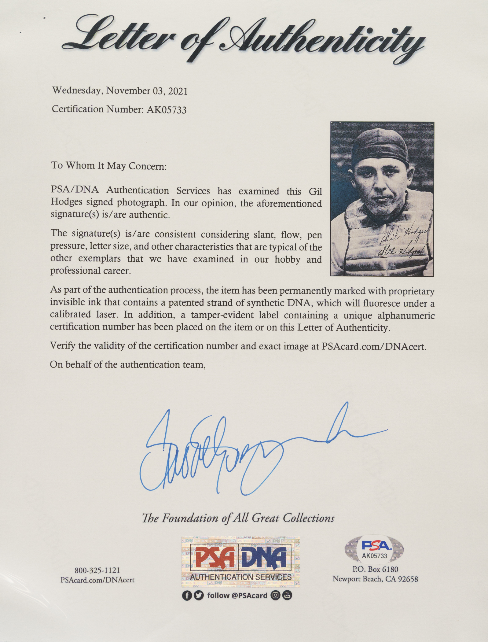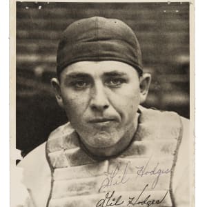 Exceedingly rare signed 1947 Brooklyn Dodgers Picture Pack featuring Hall of Famer Gil Hodges. This piece features Hodges in his rookie season donning catcher's equipment prior to him transitioning to first base full-time. While unsigned examples do appear from time to time, signed examples are nearly impossible to find. In fact, this is the only signed example we have ever handled! Hodges has boldly penned his name directly above the facsimile signature on his chest protector. The piece presents extremely well despite a few minor condition issues, including small areas of paper loss on the edges. It has also been neatly mounted to a thin backing. Regardless of these issues, this remains an exceptional piece for any advanced Hodges or Brooklyn Dodgers collector. Full LOA from PSA/DNA.