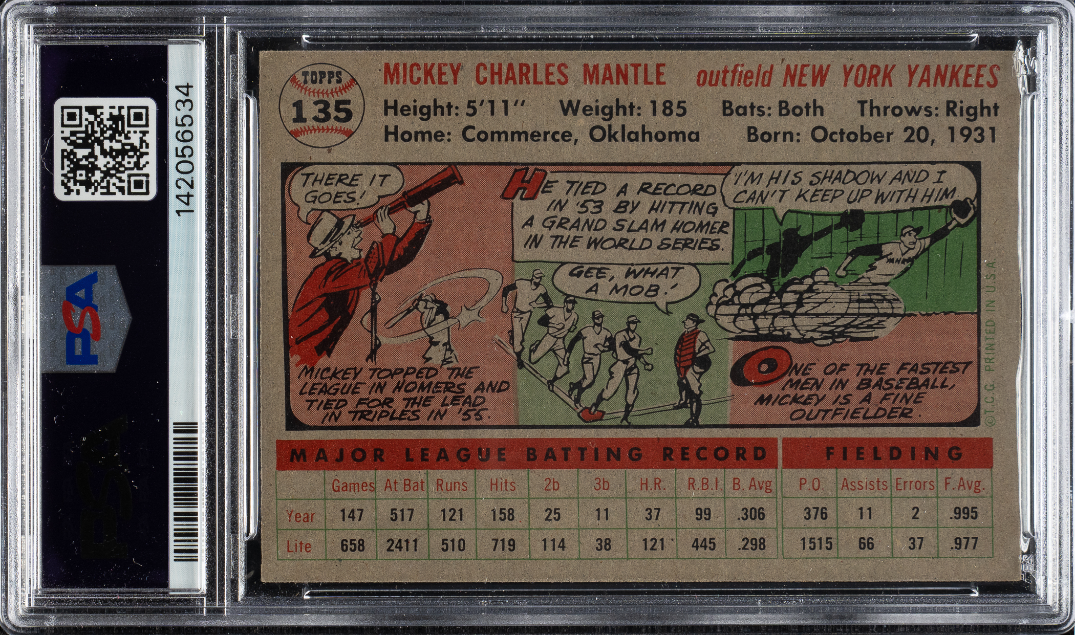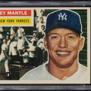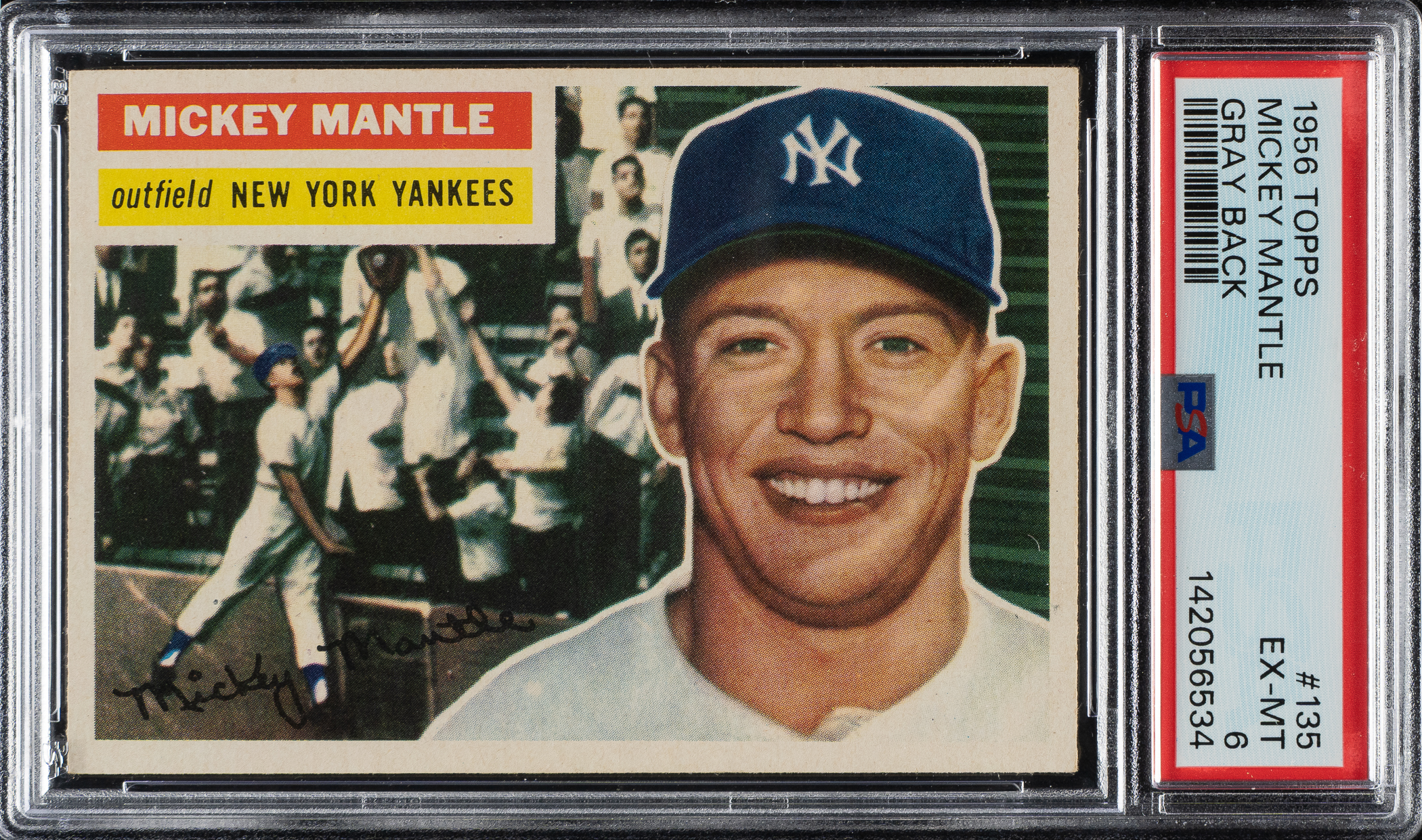 Graded EX-MT 6 by PSA (submitted by REA). Attractive gray-back variety of New York Yankees Hall of Famer Mickey Mantle's 1956 Topps card. The 1956 Topps Mantle card is highly regarded by collectors on many counts. In addition to being a striking card with an exceptional design, this card dates from Mantle's Triple Crown season. This example has bold colors, outstanding registration, and light corner wear. Clean reverse.