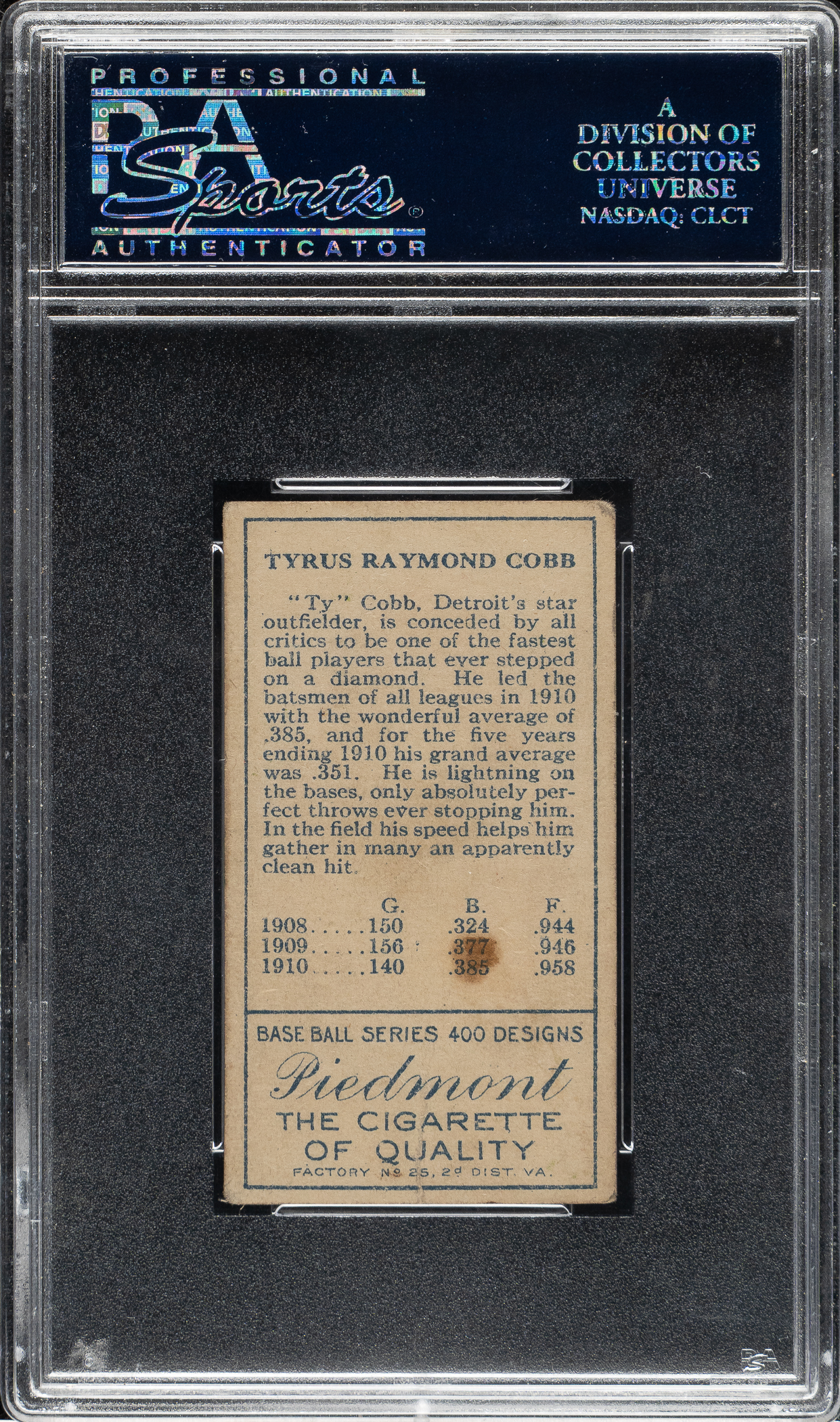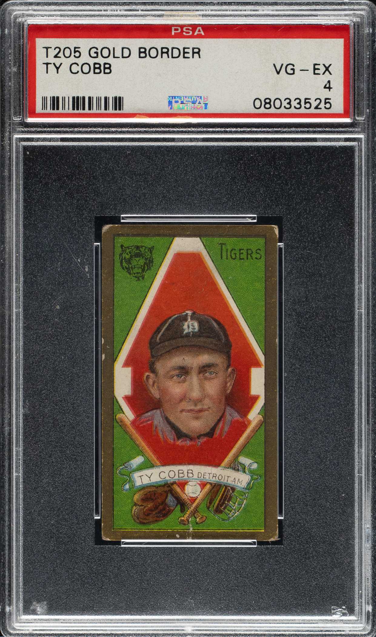Graded VG-EX 4 by PSA. Classic card of Detroit Tigers Hall of Famer Ty Cobb from the T205 Gold Border series. This is a solid mid-grade example of one of collecting's classic cards. Cobb is not just the most valuable card in the set, it is also one of the best-known and most popular of all his cards. This example has vibrant colors, a bold image, even corner wear (weaker top left), and light chipping along the delicate gold borders. Advertising for Piedmont appears on the reverse. Please note there is a vertical crease in from the bottom edge. This is an outstanding example of Ty Cobb, the key card in the T205 Gold Border set, in a particularly desirable grade, from this extremely condition-sensitive set.