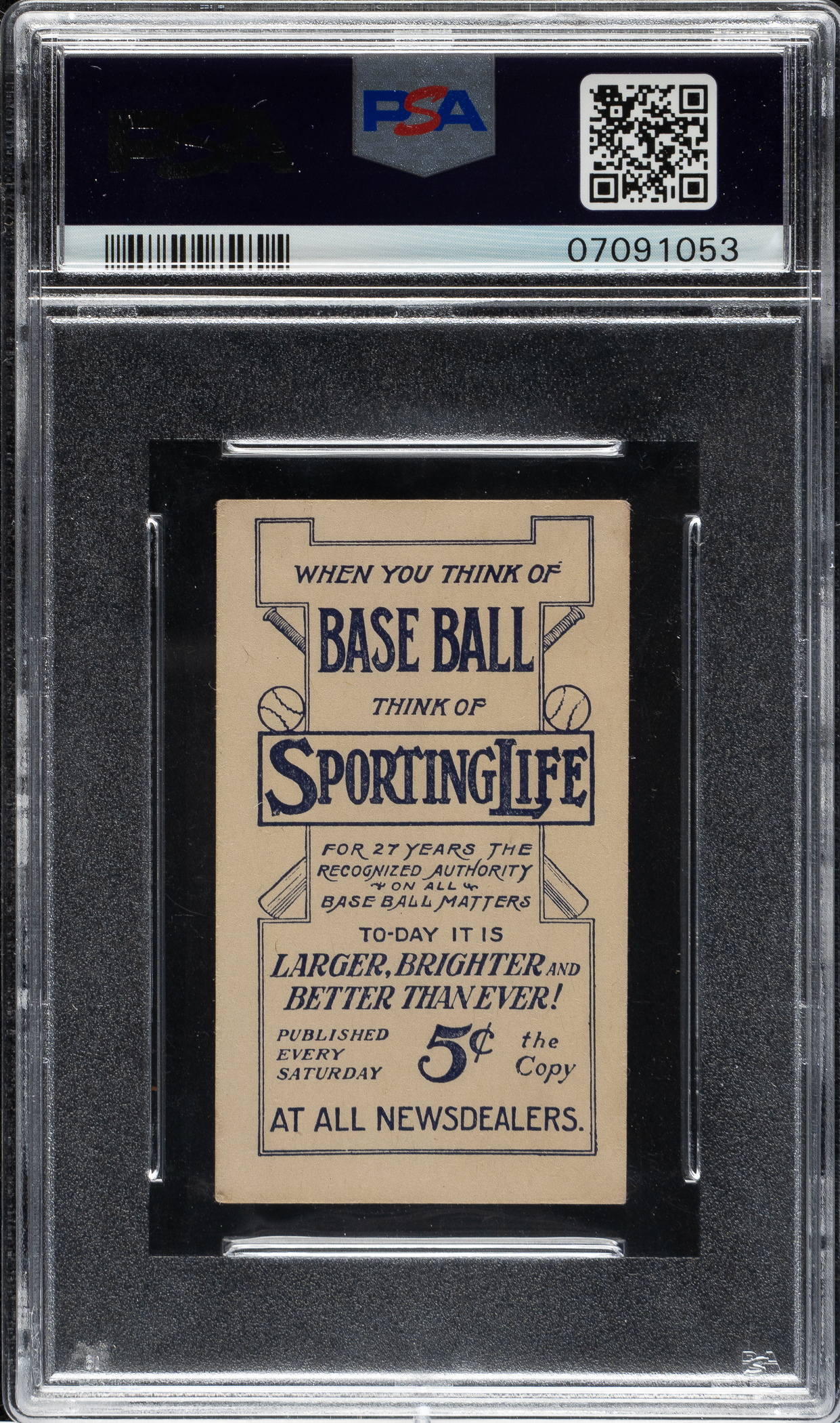 Graded EX-MT 6 by PSA. Beautiful example of New York Giants Hall of Famer Christy Mathewson from the M116 Sporting Life set, one of the most popular of all 1910-era issues. M116s are appreciated by collectors for their distinctive style and rarity relative to the more commonly seen tobacco cards of the era. Mathewson is one of the key cards of the series, and the offered example features a portrait of him set against a blue background. M116 Sporting Life cards were issued in sets of 12 cards per series, and the blue background cards are the most desirable subset within the entire set. These 24 cards were issued with both blue backgrounds and pastel backgrounds. The offered card features a brilliant blue background, outstanding registration, and light corner wear. The Sporting Life advertisement is boldly printed. This is a magnificent card, which would be a worthy addition to any M116 Sporting Life, Christy Mathewson, or Hall of Fame card collection.