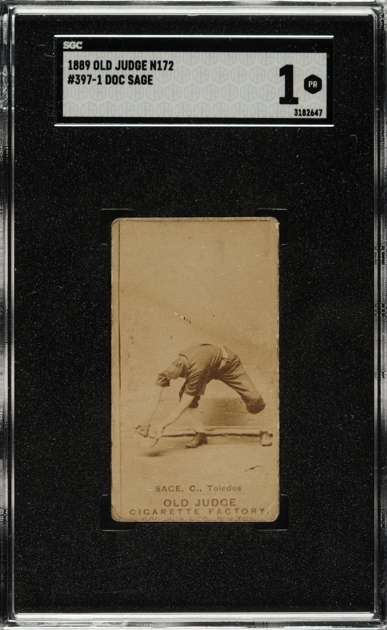 Rarely offered example of Doc Sage (Toledo, pose #397-1) from the N172 Old Judge series. According to the comprehensive book The Photographic Baseball Cards of Goodwin & Company (1886-1890), commonly referred to as the "Old Judge Book," Sage is a particularly scarce subject in the entire N172 set and is listed as among the "Top 100 Scarcest N172s." Graded POOR 1 by SGC (submitted by REA), the offered example displays corner wear and evidence of album removal on the reverse. This is a very pleasing N172 example of Sage, which will be of special interest to advanced Old Judge collectors for its noted scarcity.