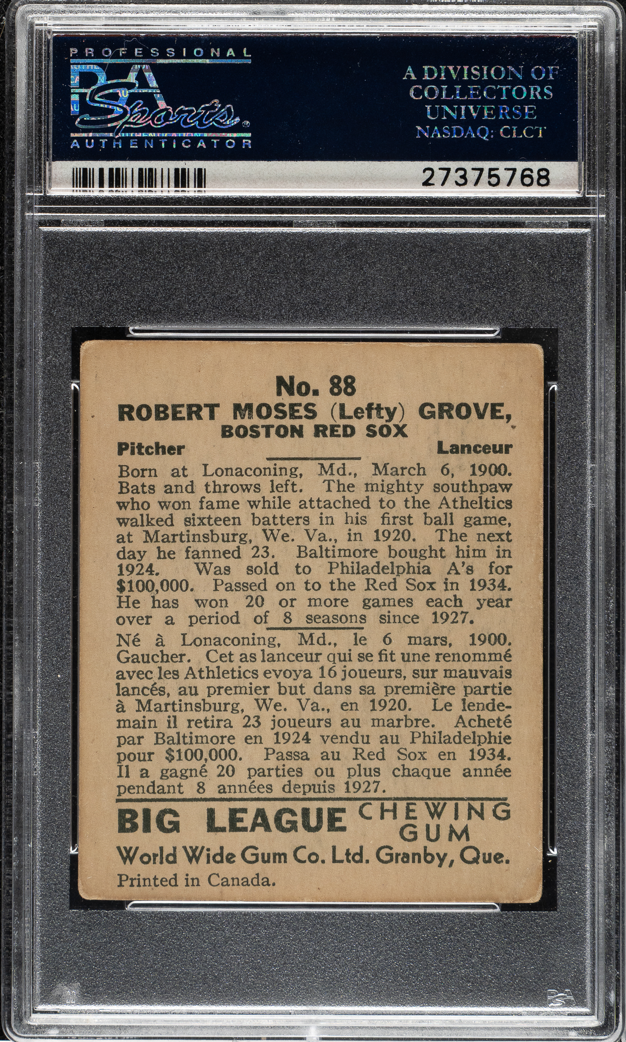 Graded VG 3 by PSA. Boston Red Sox Hall of Famer Lefty Grove.