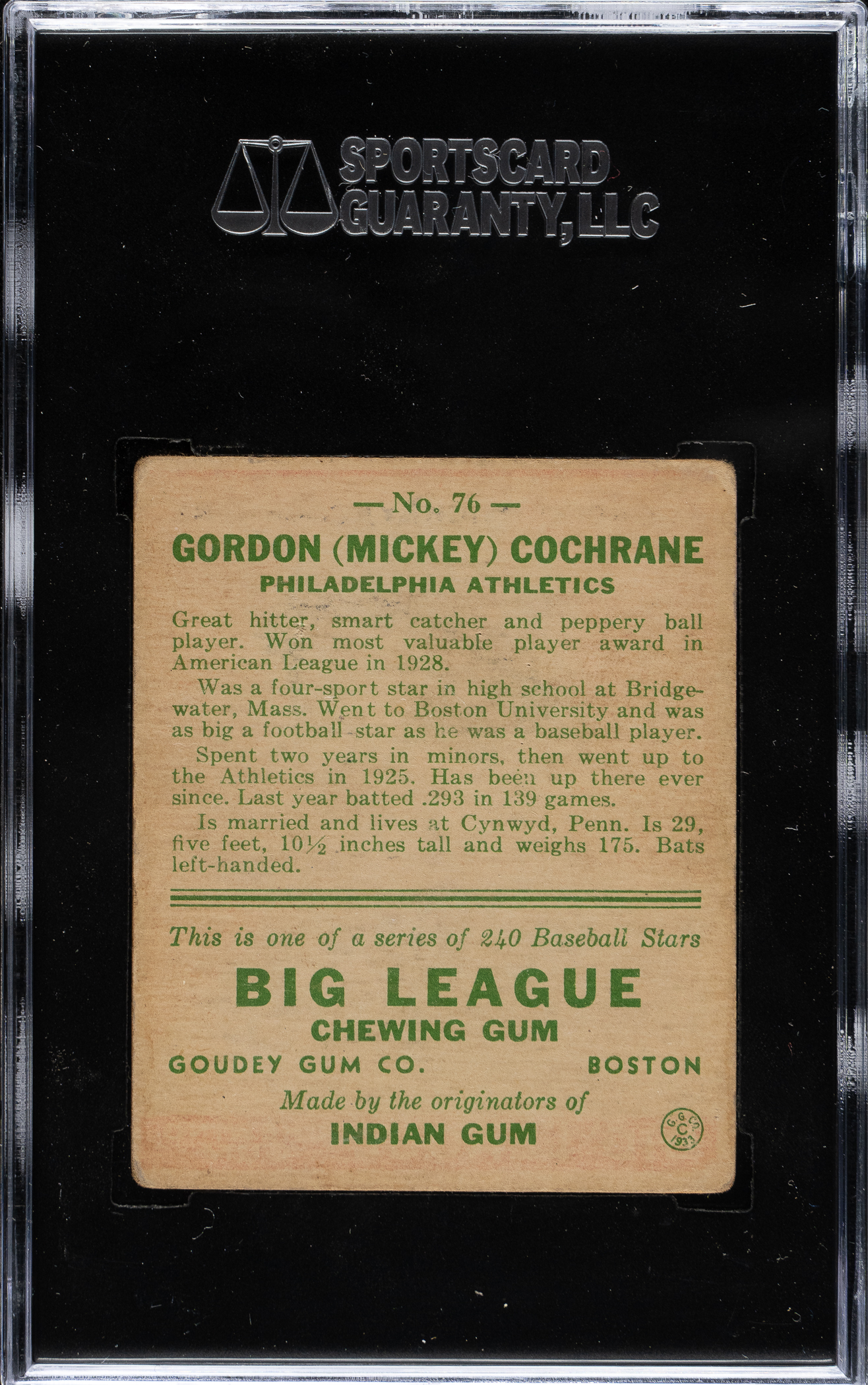 Graded VG+ 45 by SGC. Philadelphia Athletics Hall of Famer Mickey Cochrane.