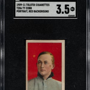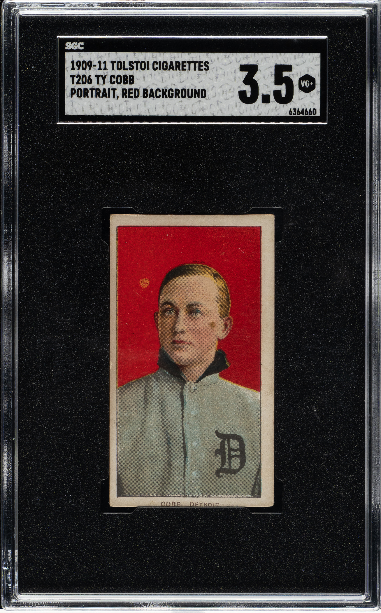 Graded VG+ 3.5 by SGC. Outstanding Ty Cobb (portrait, red background) card from the legendary T206 White Border set with a desirable Tolstoi advertising reverse. Cobb's red background portrait pose has long been considered one of the classics of the T206 set and of all vintage cards. The fact that this card features an unusual and scarce Tolstoi advertising reverse naturally makes this example of special note. T206Resource.com ranks Tolstoi as the 18th most difficult back to acquire out of 39 total backs available within the T206 White Border set. The offered example has a bold red background (with a small print imperfection next to Cobb's head) and honest corner wear. The important advertising reverse is boldly printed. This is a fantastic example of this classic Ty Cobb card, one of the keys to the T206 set, and one of the most popular of all prewar tobacco cards, in an ideal grade and with a scarce and desirable advertising back.