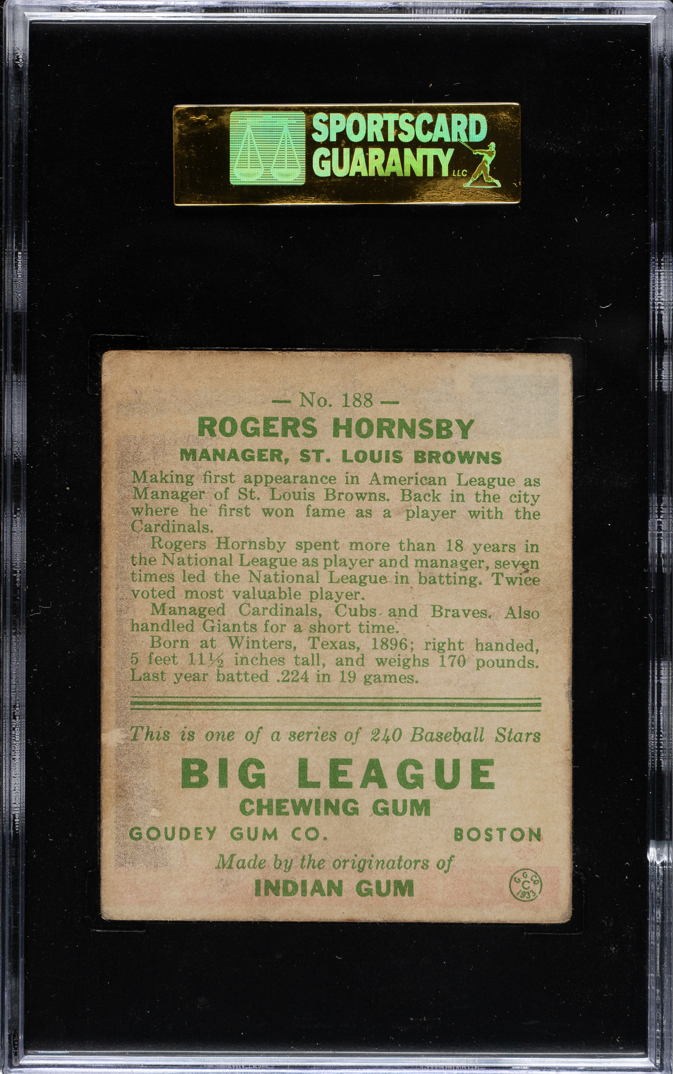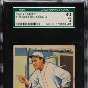 Lot # 1413: 1933 R319 Goudey #188 Rogers Hornsby SGC VG 40