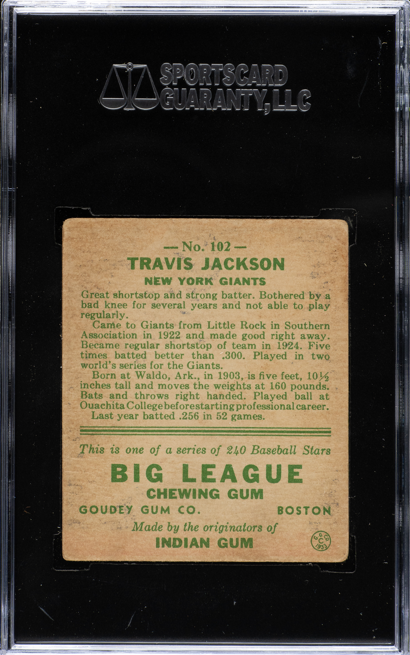Lot # 1371: 1933 R319 Goudey #102 Travis C. Jackson SGC GOOD 30