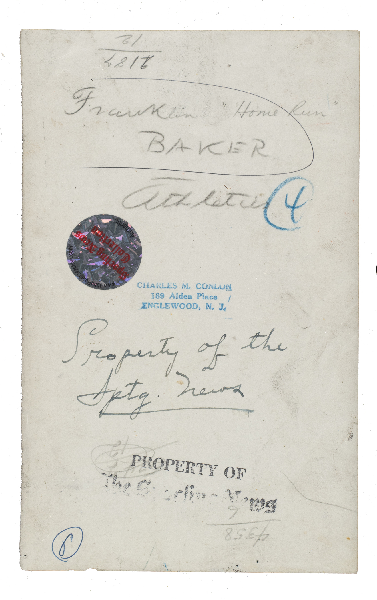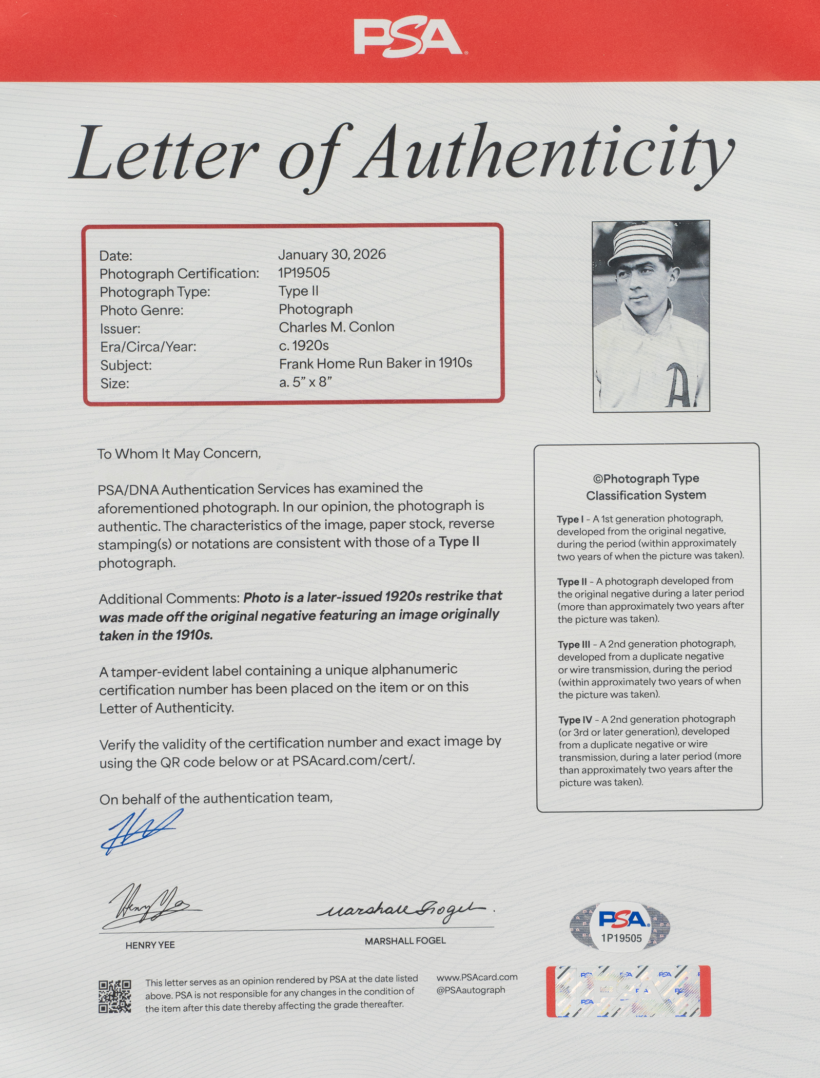 Philadelphia Athletics Hall of Famer Frank "Home Run" Baker photograph. Certified as a type II photograph by PSA/DNA. Total dimensions: 5 x 8 Inches. Full LOA from PSA/DNA.
