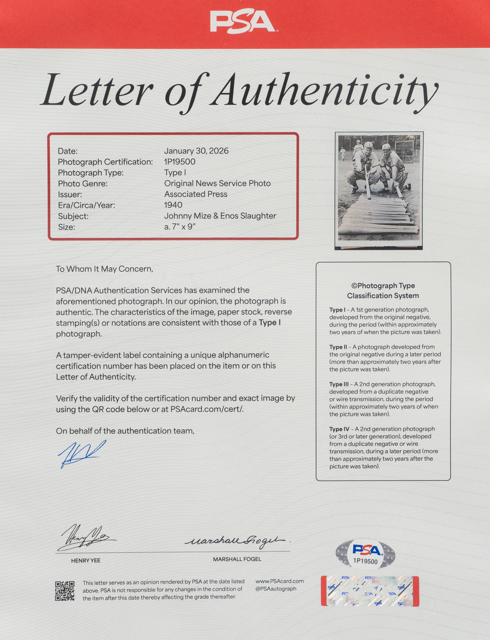 St. Louis Cardinals Hall of Famers Johnny Mize and Enos Slaughter photograph. Certified as an original type I photograph by PSA/DNA. Total dimensions: 7 x 9 Inches. Full LOA from PSA/DNA.