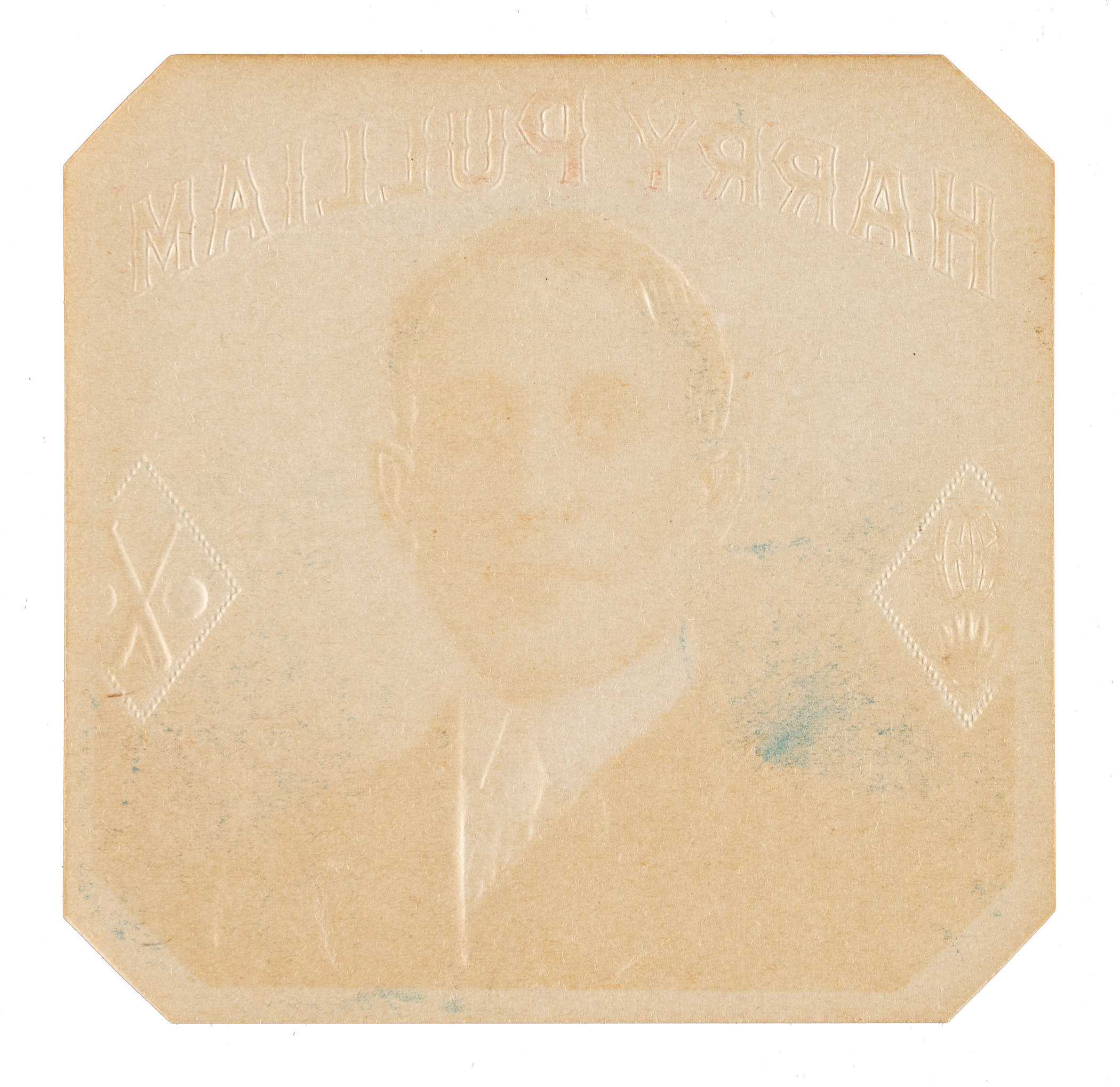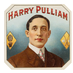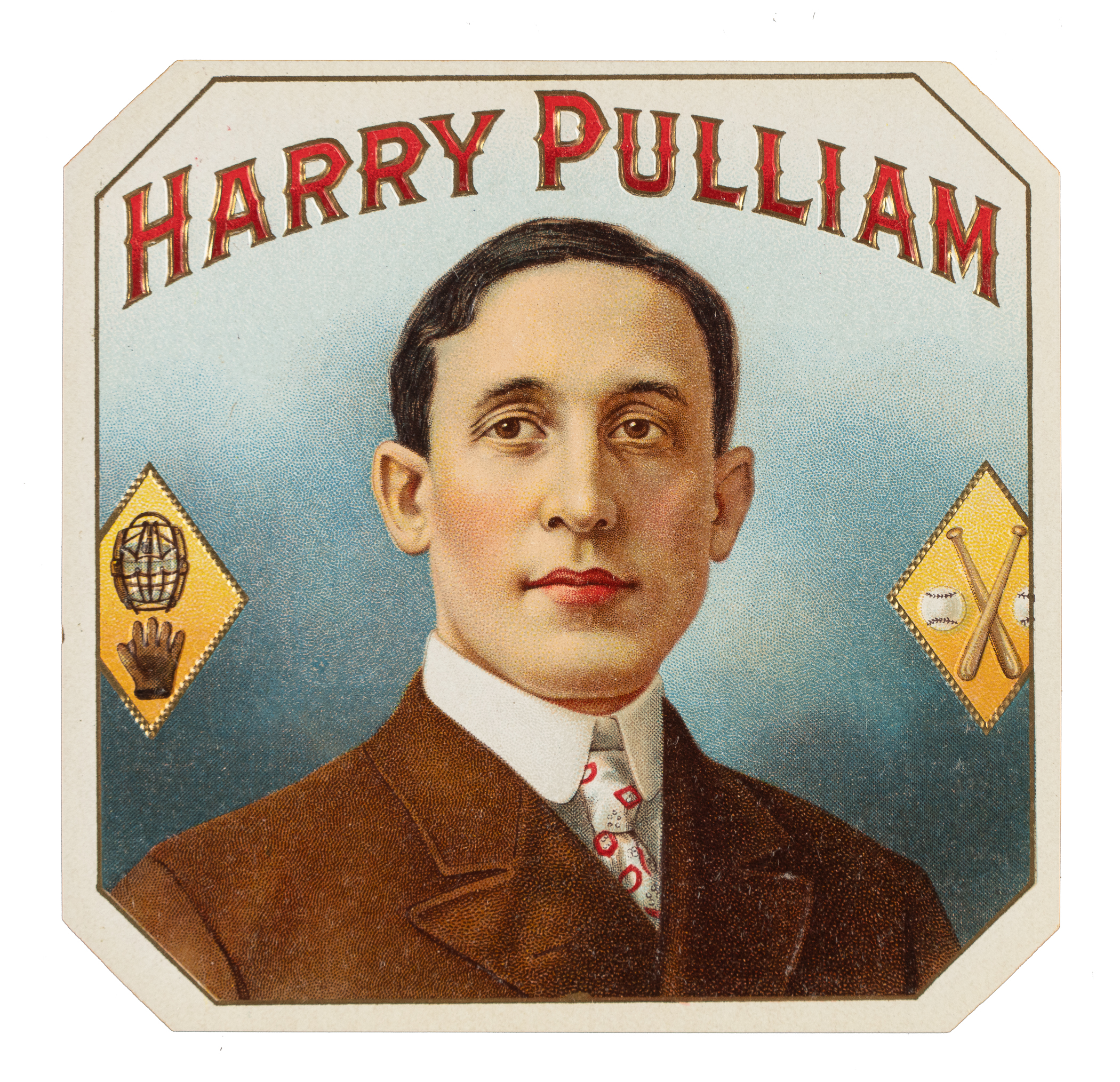 Circa 1910 Harry Pulliam cigar label. The colorful label (4.25 x 4 inches) features an illustration of the former National League president in formal attire, with images of baseball equipment on either side of him. As President of the National League, Harry Pulliam was the subject of tremendous criticism relating to his handling of the Merkle affair of 1908. The pressure of this criticism, combined with his mental instability, led Pulliam to commit suicide while in office on July 28, 1909. Pulliam's good friend John Heydler took over as President of the National League for the remainder of the 1909 season and later served in that position from 1918 to 1934. This label almost certainly originates from a modern find, made many years ago, when an unopened case of Pulliam Cigar labels was discovered, direct from the printer, all in top condition. Since that time, most have been absorbed in the hobby, and they are not nearly as common today.