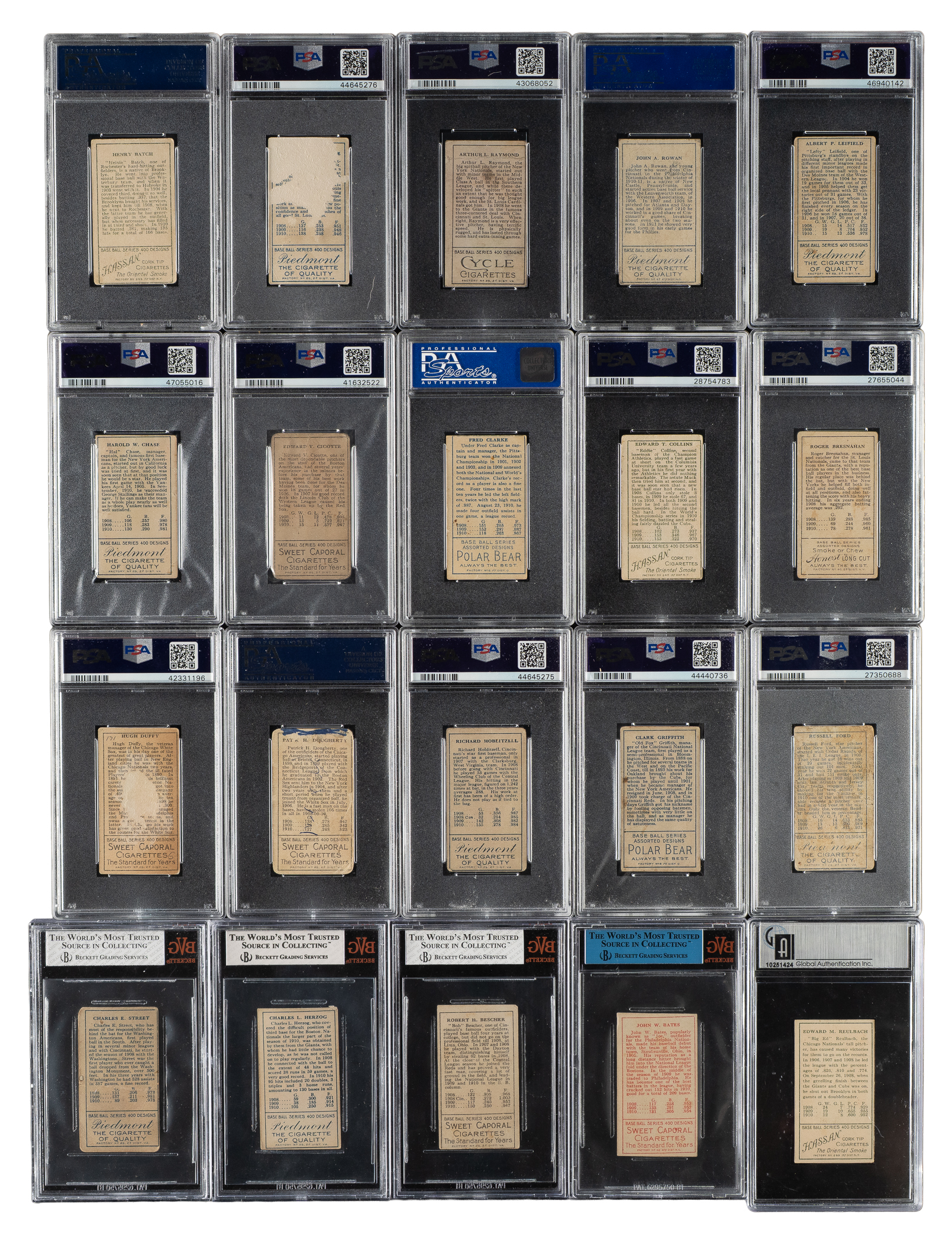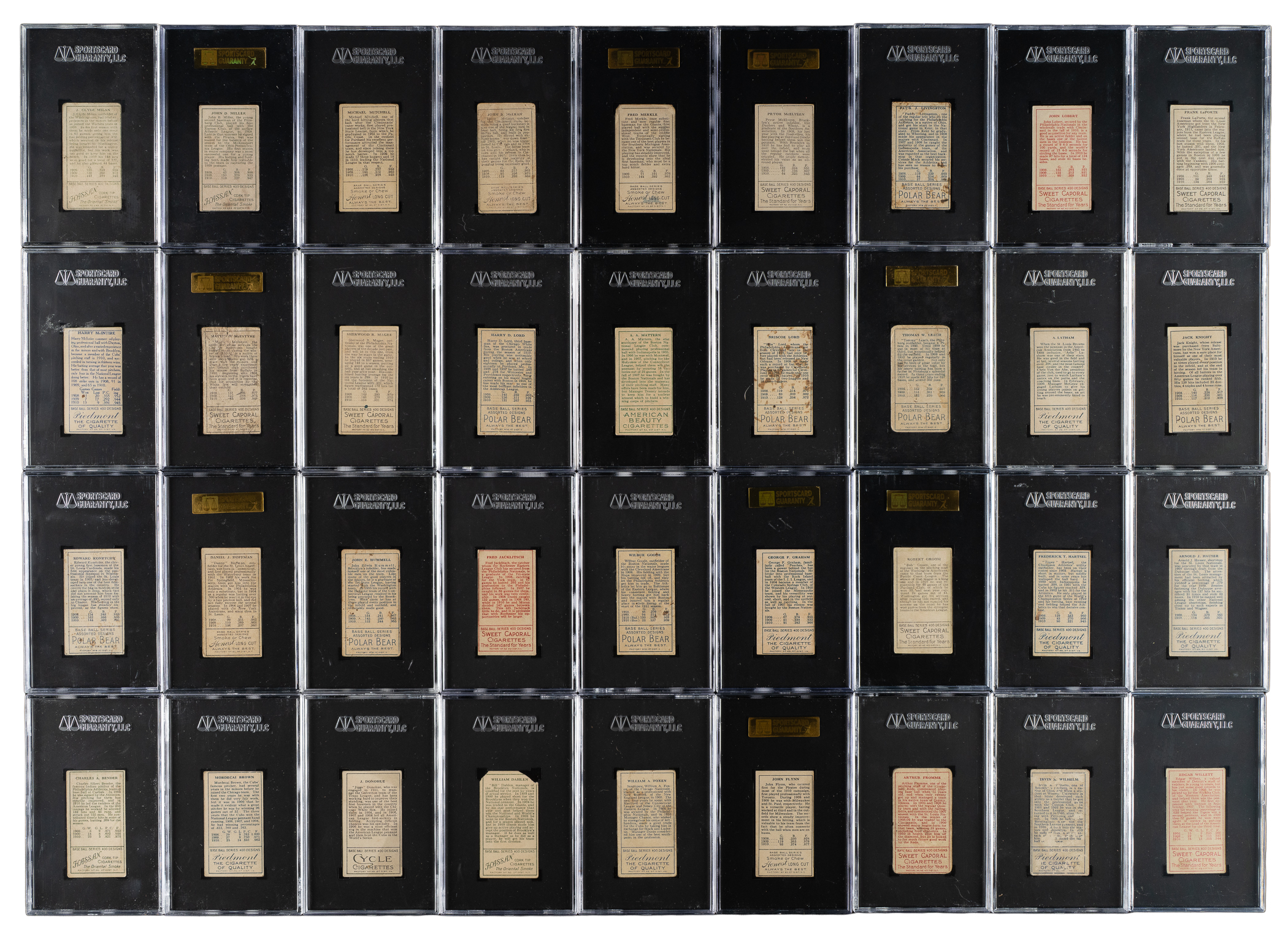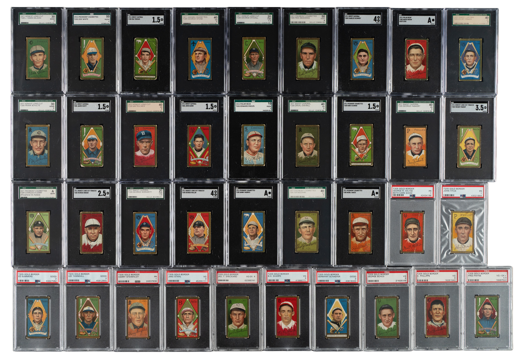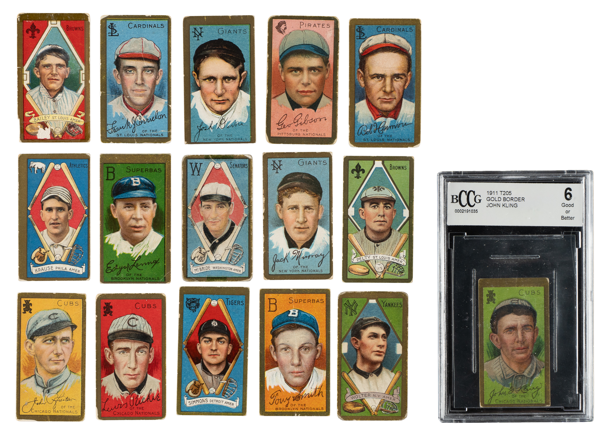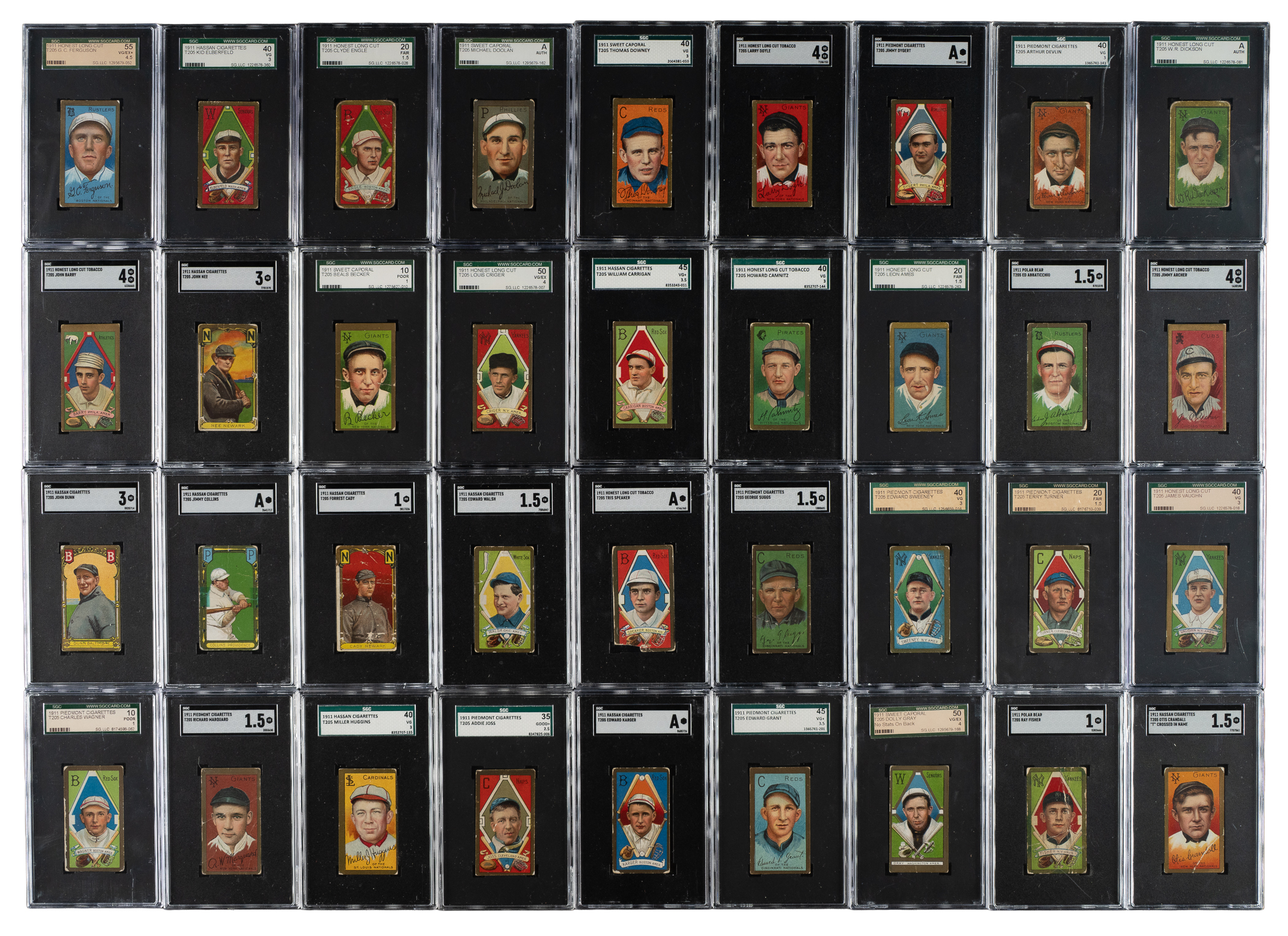 The T205 Gold Borders set is universally recognized as one of the classic tobacco-card issues and includes all the great stars of the era and many rarities. Presented is a near-complete set of 199 different cards (out of 208 in the basic set). Missing the following nine cards for completion: Barger/partial "B," Bresnahan/mouth open, Chase/left ear, Collins/mouth open, Ford/black cap, Graham/Cubs, Harmon/left ear, Shean/Cubs, and Wiltse/right ear. Though the cards span a variety of grades, they present with bright colors and crisp focus, and many of the lesser-graded examples still have great eye appeal. A total of 176 cards have been professionally graded and encapsulated by SGC (103), PSA (67), GAI (2), and BVG (4). Grading Composite (SGC unless noted): EX+ 5.5 (1 card): Barger/full "B" on cap (PSA). EX 60 (3 cards): Graham/Rustlers, Hartsel, and Jones (PSA). VG/EX+ 55 (4 cards): Bell (PSA), Ferguson, Payne (PSA), and Reulbach (GAI). VG/EX 50 (19 cards): Archer (SGC 4), Barry (SGC 4), Beck (PSA), Bender, Criger, Delahanty (PSA), Doyle (SGC 4), Egan (PSA, MK), Gaspar (PSA), Gray/no stats on back, McAllister (PSA), McGraw (PSA), Miller, Mullin (SGC 4), Schmidt (SGC 4), Sheckard (PSA), Snodgrass, D. White, and Willett (SGC 4). VG+ 45 (11 cards): Batch (PSA), Carrigan, Grant, Herzog (BVG), Johnson (GAI), T. Jones (PSA), Knight, Latham/A. Latham on back, McConnell (PSA), McIntire, and Parent (SGC 3.5). VG 40 (36 cards): Adkins (PSA), Austin (PSA, MK), Baker (PSA), Blackburne (PSA), Bresnahan/mouth closed (PSA), Camnitz, Clarke (PSA), Devlin, Downey, Dunn (SGC 3), Elberfeld, Ewing (PSA), Ewing (PSA), Hauser, Hoffman, Huggins, Killian (PSA), Konetchy, Kroh (PSA), Magee (SGC 3), Merritt (PSA), Milan, Nee (SGC 3), Needham, Overall, Paskert, Phillippe (PSA), Rowan (PSA), Rucker, Schlei (PSA), Sharpe (PSA), Stahl (PSA), Stanage, Stone, Sweeney, and Vaughan. GOOD+ 35 (11 cards): Bergen, Bescher (BVG), Brown (SGC 2.5), Griffith (PSA), Hanford (PSA), Joss, B. Lord (SGC 2.5), Mitchell (SGC 2.5), Moran (SGC 2.5), Olmstead (PSA), and Young. GOOD 30 (31 cards): Ball (PSA), Birmingham (PSA), Bransfield (PSA), Bridwell (PSA), Byrne (GOOD 2), Chase/gold frame extends (PSA), Collins/mouth closed (PSA), Daubert (PSA), Dooin (PSA), Doughtery/red sock (PSA, MK), Engle, Evans (PSA), Flynn, Ford/white (PSA, MC), Frick (PSA, MC), Gardner (PSA 2), Groom, Hemphill (PSA), Hummell, Lang (PSA), Lush (PSA), Maddox (PSA), Mattern, McElveen, Merkle, Meyers (PSA), Schaefer (PSA), Schulte, Summers (PSA), Tannehill (PSA), and Wilson. FAIR 20 (21 cards): Abbaticchio (SGC 1.5), Ames, Cicotte/"Black Sox" (PSA), Crandall/"t" crossed (SGC 1.5), Fletcher (PSA 1.5), Foxen (SGC 1.5), Leach, Leever (PSA), Marquard (SGC 1.5), McLean (SGC 1.5), Moriarity, Oldring (SGC 1.5), Quinn (SGC 1.5), Scott (SGC 1.5), Stovall, Street (BVG), Suggs (SGC 1.5), Thomas (SGC 1.5), Turner, Walsh (SGC 1.5), and Wheat (PSA). POOR 10 (19 cards): Becker, Cady (SGC 1), Donohue (SGC 1), Duffy (PSA, MK), Fisher (SGC 1), Fromme (SGC 1), Hoblitzell/"Cin." after 1908 stats (PSA), K. White (PSA), Lee (PSA), Leifield/"A. P." on front (PSA), Livingston (SGC 1), Mathewson, McIntyre, Phelps, Steinfeldt (PSA), Titus (PSA), Wagner, Wallace/with cap (PSA), and Wiltse/both ears show (PSA). Authentic (20 cards): Bates (BVG, Altered), Cobb, Dahlen, Dickson, Doolan, Dygert, Goode, H. Lord, J. Collins, Jacklitsch, Karger, LaPorte, Lobert, Murphy, O'Leary (ink added), Oakes, Raymond (Altered), Shean/Rustlers, Speaker, and Wilhelm/"suffe ed" in bio. The twenty-three unencapsulated cards grade two Vg-Ex, three Vg (including one residing in a BCCG holder), four Gd, three Fr, seven Pr and four trimmed. Unencapsulated Keys: Chance (borders trimmed off, otherwise Ex), Evers (borders trimmed off, otherwise Vg-Ex), Jennings (Fr due mostly to small spots of paper loss on reverse), Kleinow (Gd), Phelan (Fr, minor leaguer), Scanlan (Pr-Fr), and Tinker (borders trimmed off, otherwise Vg+). Most of the backs are Piedmont or Sweet Caporal, but also included are one American Beauty, three Cycle, 27 Hassan, 34 Honest Long Cut, 23 Polar Bear, and nine Sovereign. This is an attractive medium- to lower-grade near-complete set including many of the Hall of Famers, minor leaguers, and rarities that make the T205 Gold Borders set so challenging to complete. Total: 199 cards. The size/weight of this item requires that there will be an additional shipping charge for this lot.
