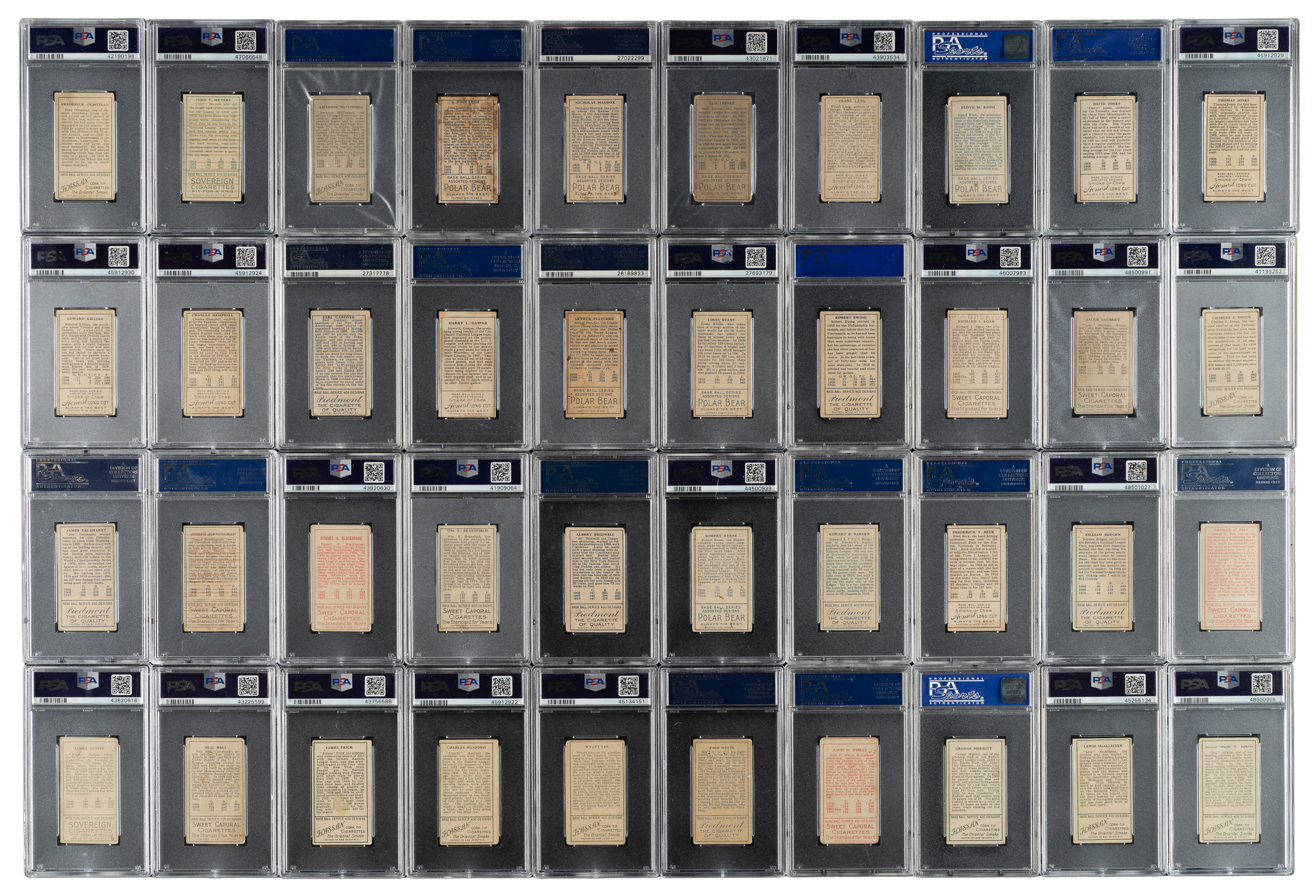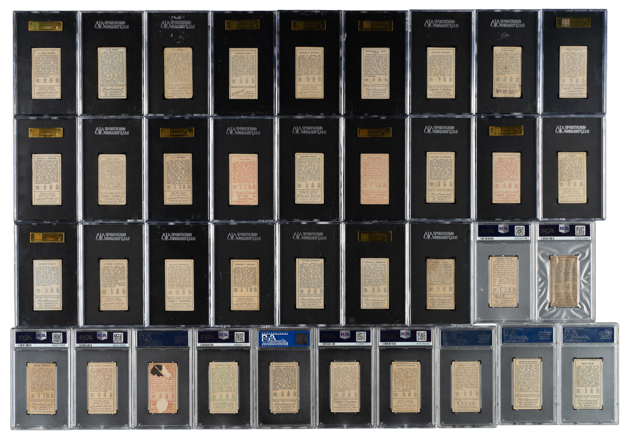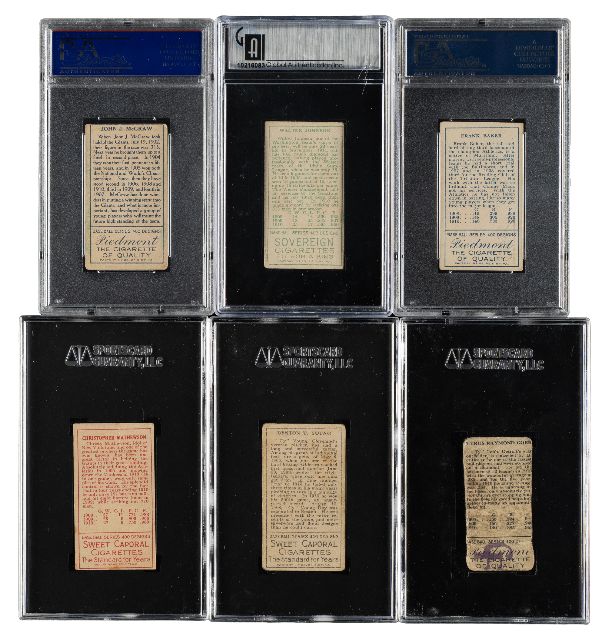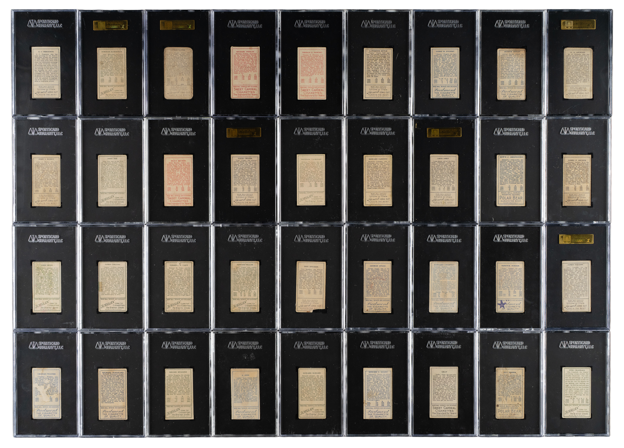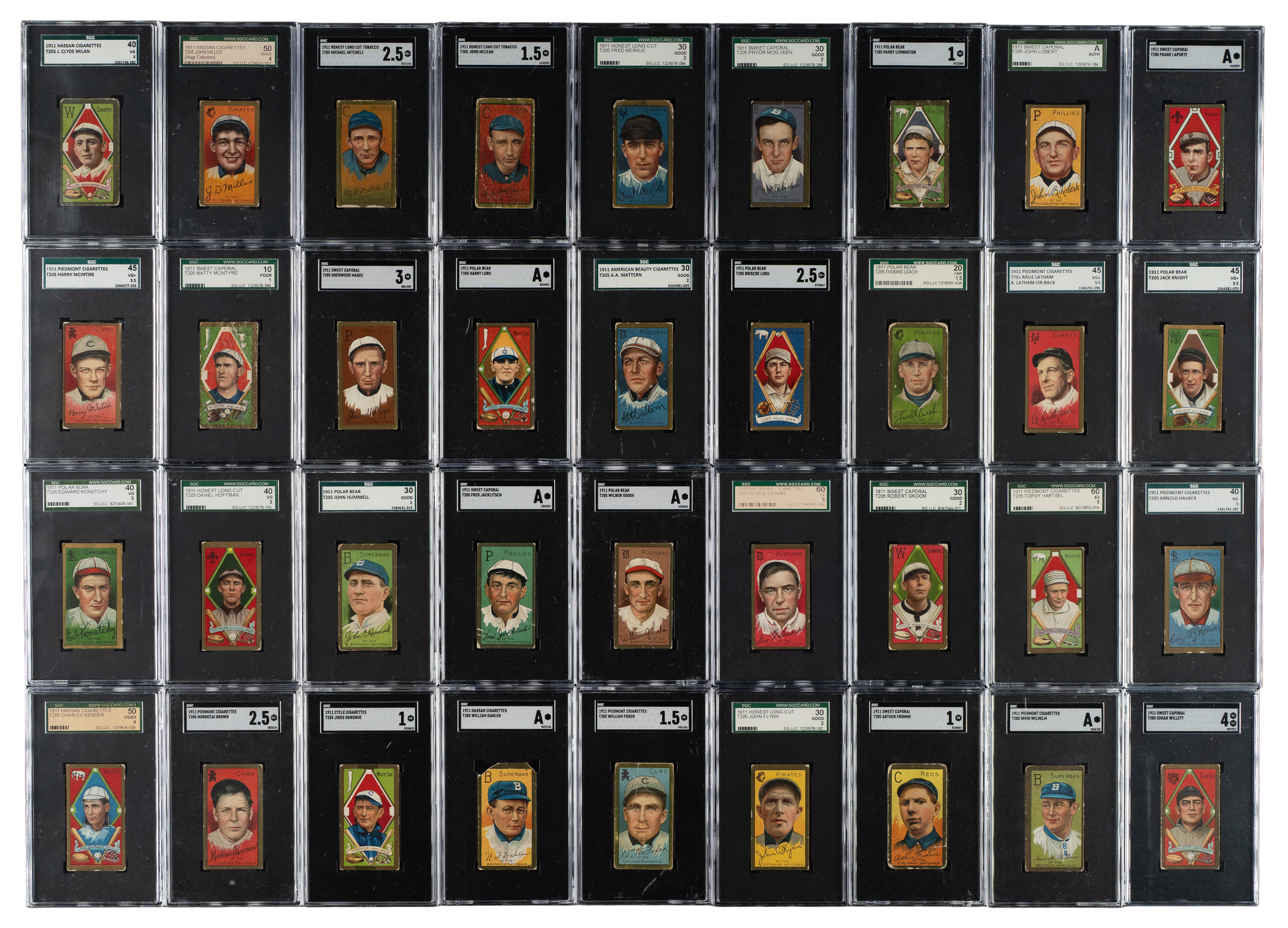 The T205 Gold Borders set is universally recognized as one of the classic tobacco-card issues and includes all the great stars of the era and many rarities. Presented is a near-complete set of 199 different cards (out of 208 in the basic set). Missing the following nine cards for completion: Barger/partial "B," Bresnahan/mouth open, Chase/left ear, Collins/mouth open, Ford/black cap, Graham/Cubs, Harmon/left ear, Shean/Cubs, and Wiltse/right ear. Though the cards span a variety of grades, they present with bright colors and crisp focus, and many of the lesser-graded examples still have great eye appeal. A total of 176 cards have been professionally graded and encapsulated by SGC (103), PSA (67), GAI (2), and BVG (4). Grading Composite (SGC unless noted): EX+ 5.5 (1 card): Barger/full "B" on cap (PSA). EX 60 (3 cards): Graham/Rustlers, Hartsel, and Jones (PSA). VG/EX+ 55 (4 cards): Bell (PSA), Ferguson, Payne (PSA), and Reulbach (GAI). VG/EX 50 (19 cards): Archer (SGC 4), Barry (SGC 4), Beck (PSA), Bender, Criger, Delahanty (PSA), Doyle (SGC 4), Egan (PSA, MK), Gaspar (PSA), Gray/no stats on back, McAllister (PSA), McGraw (PSA), Miller, Mullin (SGC 4), Schmidt (SGC 4), Sheckard (PSA), Snodgrass, D. White, and Willett (SGC 4). VG+ 45 (11 cards): Batch (PSA), Carrigan, Grant, Herzog (BVG), Johnson (GAI), T. Jones (PSA), Knight, Latham/A. Latham on back, McConnell (PSA), McIntire, and Parent (SGC 3.5). VG 40 (36 cards): Adkins (PSA), Austin (PSA, MK), Baker (PSA), Blackburne (PSA), Bresnahan/mouth closed (PSA), Camnitz, Clarke (PSA), Devlin, Downey, Dunn (SGC 3), Elberfeld, Ewing (PSA), Ewing (PSA), Hauser, Hoffman, Huggins, Killian (PSA), Konetchy, Kroh (PSA), Magee (SGC 3), Merritt (PSA), Milan, Nee (SGC 3), Needham, Overall, Paskert, Phillippe (PSA), Rowan (PSA), Rucker, Schlei (PSA), Sharpe (PSA), Stahl (PSA), Stanage, Stone, Sweeney, and Vaughan. GOOD+ 35 (11 cards): Bergen, Bescher (BVG), Brown (SGC 2.5), Griffith (PSA), Hanford (PSA), Joss, B. Lord (SGC 2.5), Mitchell (SGC 2.5), Moran (SGC 2.5), Olmstead (PSA), and Young. GOOD 30 (31 cards): Ball (PSA), Birmingham (PSA), Bransfield (PSA), Bridwell (PSA), Byrne (GOOD 2), Chase/gold frame extends (PSA), Collins/mouth closed (PSA), Daubert (PSA), Dooin (PSA), Doughtery/red sock (PSA, MK), Engle, Evans (PSA), Flynn, Ford/white (PSA, MC), Frick (PSA, MC), Gardner (PSA 2), Groom, Hemphill (PSA), Hummell, Lang (PSA), Lush (PSA), Maddox (PSA), Mattern, McElveen, Merkle, Meyers (PSA), Schaefer (PSA), Schulte, Summers (PSA), Tannehill (PSA), and Wilson. FAIR 20 (21 cards): Abbaticchio (SGC 1.5), Ames, Cicotte/"Black Sox" (PSA), Crandall/"t" crossed (SGC 1.5), Fletcher (PSA 1.5), Foxen (SGC 1.5), Leach, Leever (PSA), Marquard (SGC 1.5), McLean (SGC 1.5), Moriarity, Oldring (SGC 1.5), Quinn (SGC 1.5), Scott (SGC 1.5), Stovall, Street (BVG), Suggs (SGC 1.5), Thomas (SGC 1.5), Turner, Walsh (SGC 1.5), and Wheat (PSA). POOR 10 (19 cards): Becker, Cady (SGC 1), Donohue (SGC 1), Duffy (PSA, MK), Fisher (SGC 1), Fromme (SGC 1), Hoblitzell/"Cin." after 1908 stats (PSA), K. White (PSA), Lee (PSA), Leifield/"A. P." on front (PSA), Livingston (SGC 1), Mathewson, McIntyre, Phelps, Steinfeldt (PSA), Titus (PSA), Wagner, Wallace/with cap (PSA), and Wiltse/both ears show (PSA). Authentic (20 cards): Bates (BVG, Altered), Cobb, Dahlen, Dickson, Doolan, Dygert, Goode, H. Lord, J. Collins, Jacklitsch, Karger, LaPorte, Lobert, Murphy, O'Leary (ink added), Oakes, Raymond (Altered), Shean/Rustlers, Speaker, and Wilhelm/"suffe ed" in bio. The twenty-three unencapsulated cards grade two Vg-Ex, three Vg (including one residing in a BCCG holder), four Gd, three Fr, seven Pr and four trimmed. Unencapsulated Keys: Chance (borders trimmed off, otherwise Ex), Evers (borders trimmed off, otherwise Vg-Ex), Jennings (Fr due mostly to small spots of paper loss on reverse), Kleinow (Gd), Phelan (Fr, minor leaguer), Scanlan (Pr-Fr), and Tinker (borders trimmed off, otherwise Vg+). Most of the backs are Piedmont or Sweet Caporal, but also included are one American Beauty, three Cycle, 27 Hassan, 34 Honest Long Cut, 23 Polar Bear, and nine Sovereign. This is an attractive medium- to lower-grade near-complete set including many of the Hall of Famers, minor leaguers, and rarities that make the T205 Gold Borders set so challenging to complete. Total: 199 cards. The size/weight of this item requires that there will be an additional shipping charge for this lot.