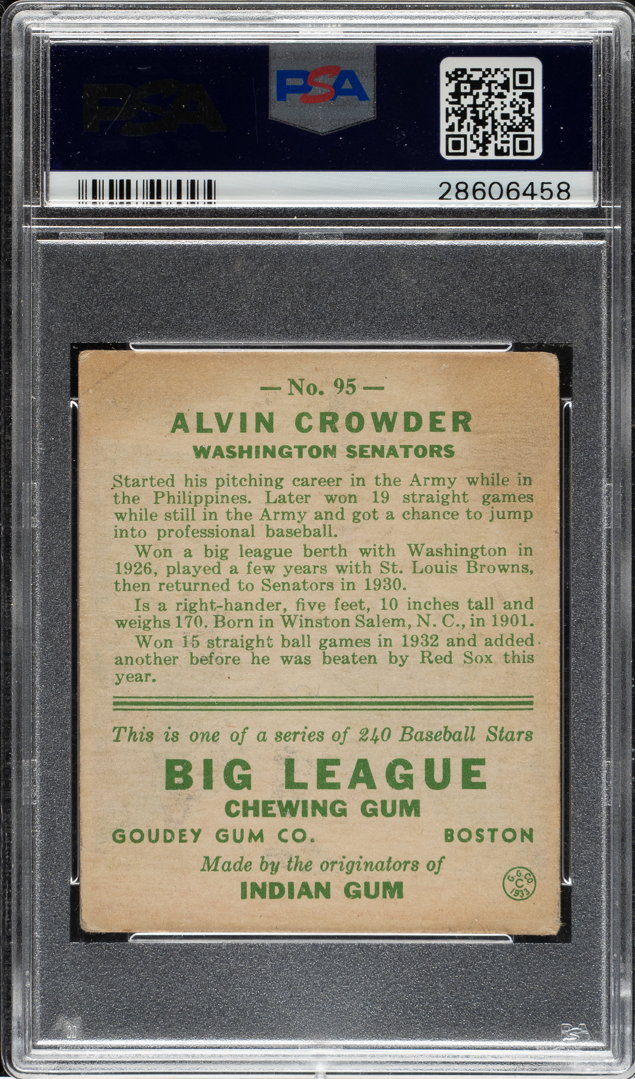 Lot # 1490: 1933 R319 Goudey #95 Alvin Crowder PSA VG+ 3.5