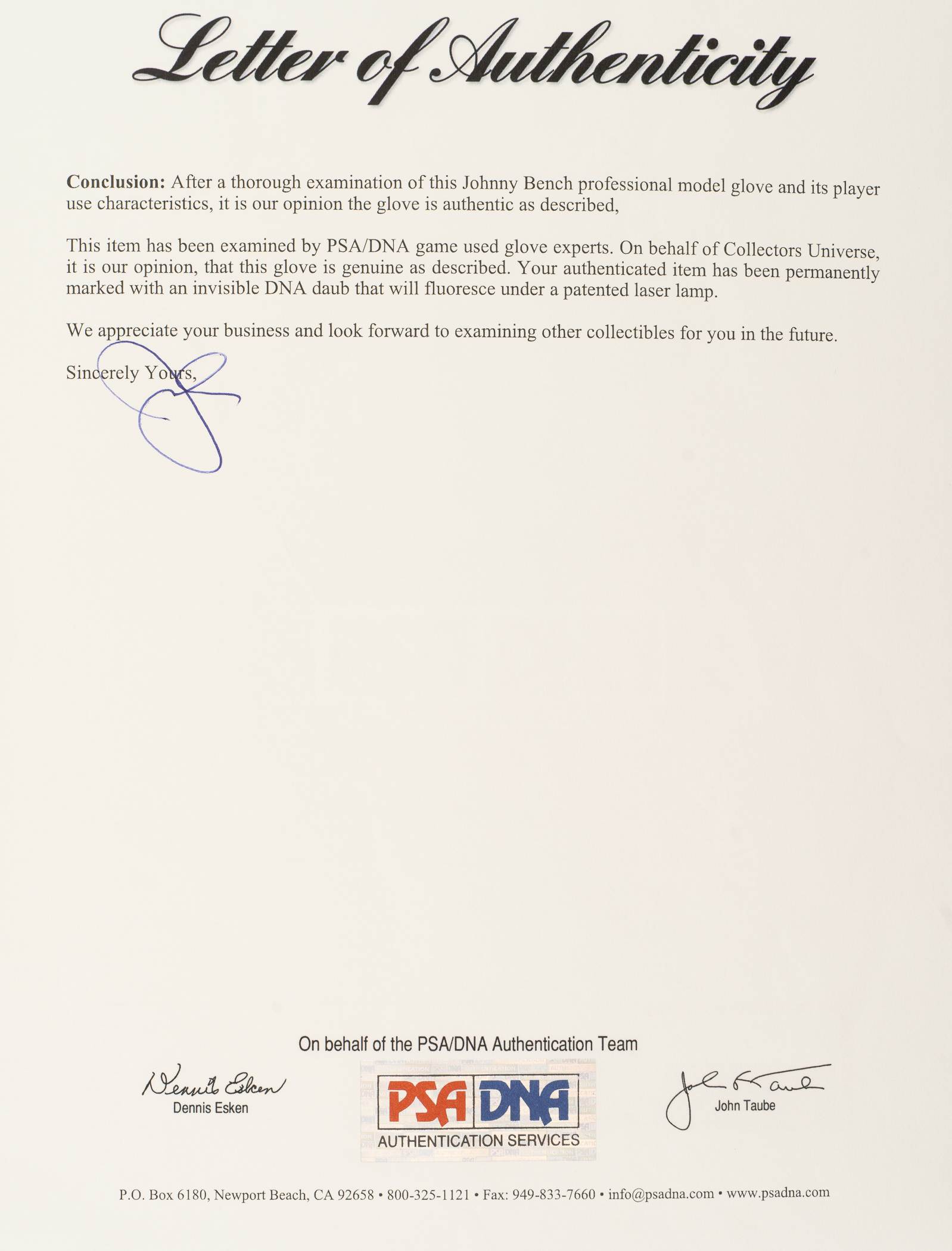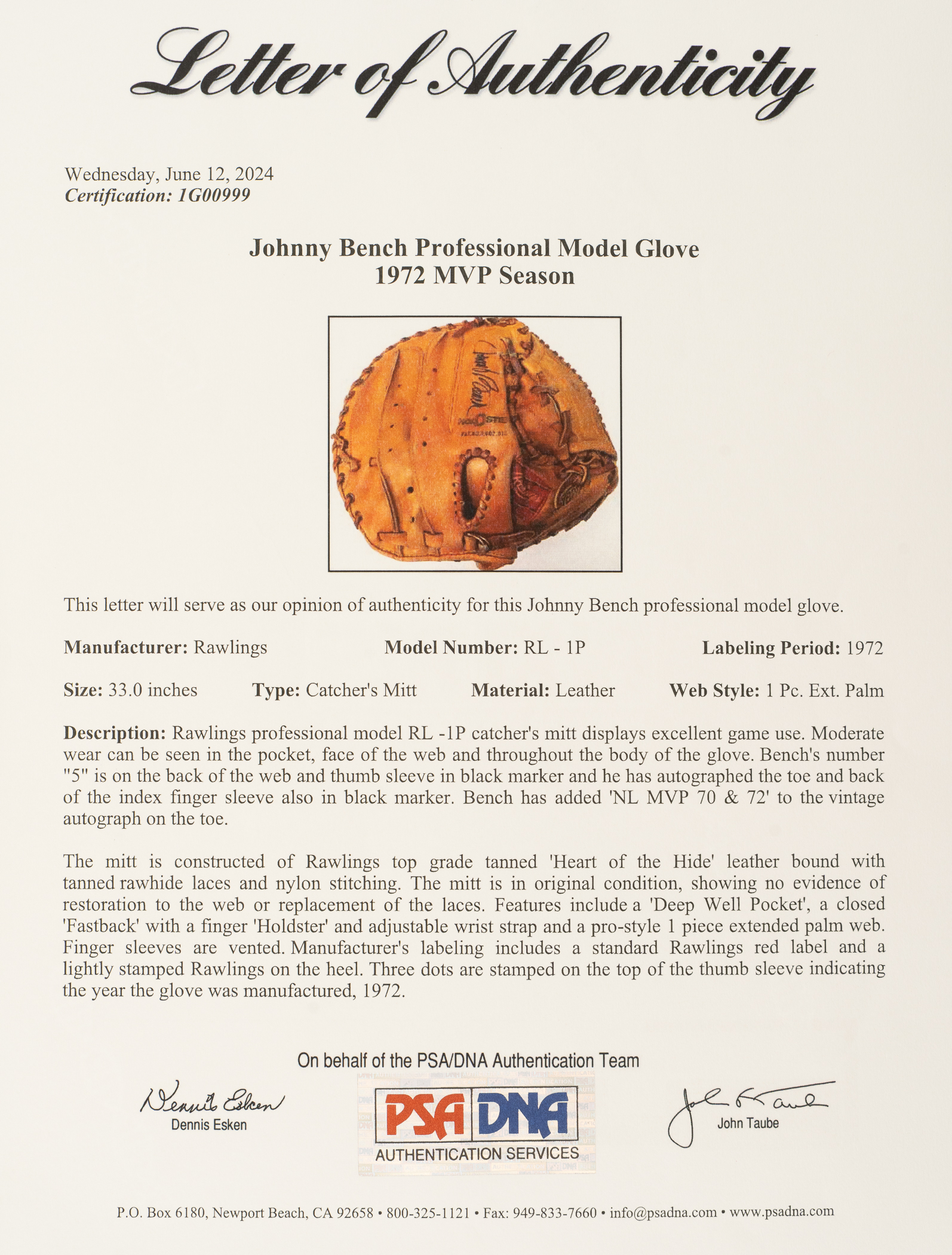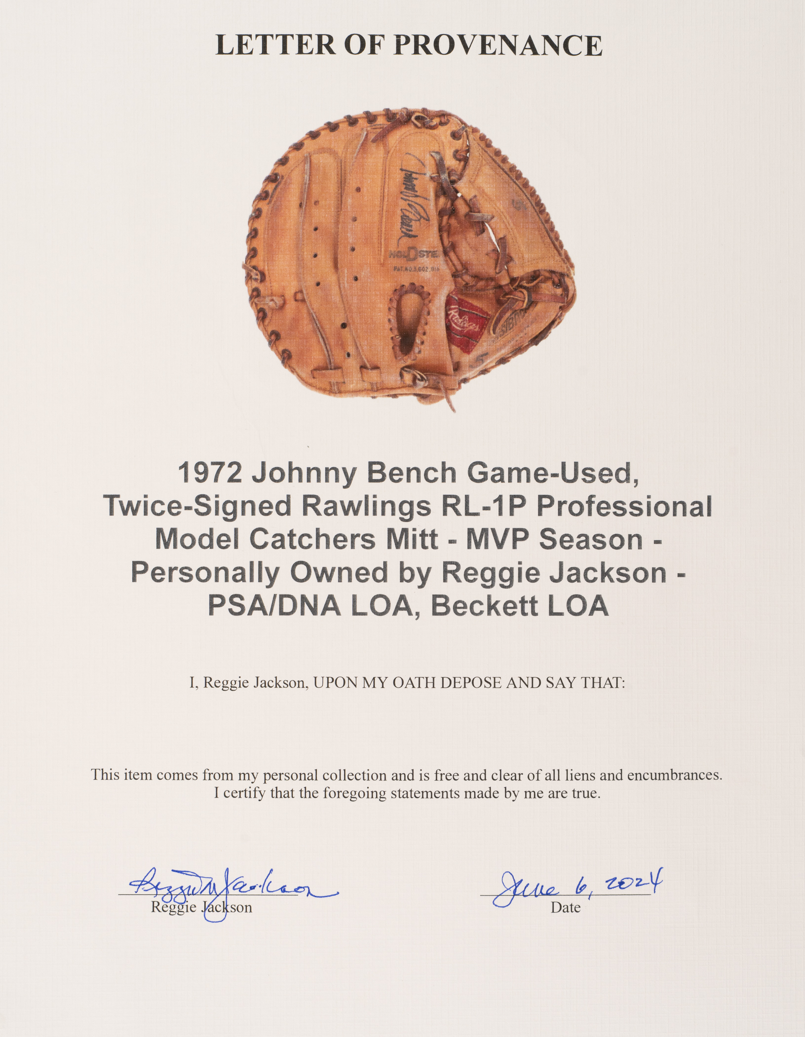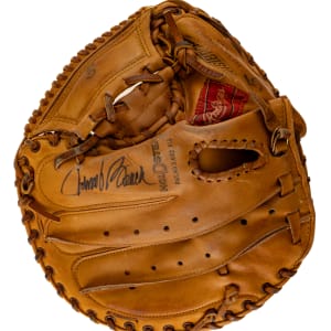 Rawlings catcher’s glove used by Cincinnati Reds Hall of Famer Johnny Bench during his 1972 season, where he won the National League MVP Award. This glove originates directly from fellow Hall of Famer Reggie Jackson and is accompanied by a signed LOA from Jackson attesting to its provenance. The “RL-1P” model glove features Bench's uniform number “5” written in vintage black marker on the back of the web and thumb sleeve. According to PSA/DNA, "three dots are stamped on the top of the thumb sleeve indicating the year the glove was manufactured, 1972." Bench has signed the glove twice in black ink, once on the back of the index finger, and again on the interior edge with an added inscription ("NL MVP 70 + 72"). Bench is considered by many to be the greatest catcher in baseball history. A two-time home-run champion and winner of two MVP Awards and 10 consecutive Gold Glove Awards, Bench was elected to the Hall of Fame in 1989, his first year of eligibility. In 1999, he was named as one of two catchers to baseball’s All-Century Team. Game-used gloves of Hall of Fame players, especially one of Bench’s stature, are rare. The fact that this glove originates directly from Reggie Jackson and is accompanied by a signed LOA from him, not to mention that it dates from one of Bench's two MVP seasons, makes it the finest example we have ever handled. The glove displays wear commensurate with a season of use. The leather remains supple and all of the lacing is intact. In Excellent condition overall. Full LOA from John Taube of PSA/DNA. LOA from Reggie Jackson. Full LOA from Steve Grad and Brian Sobrero/Beckett Authentication Services (autographs only).