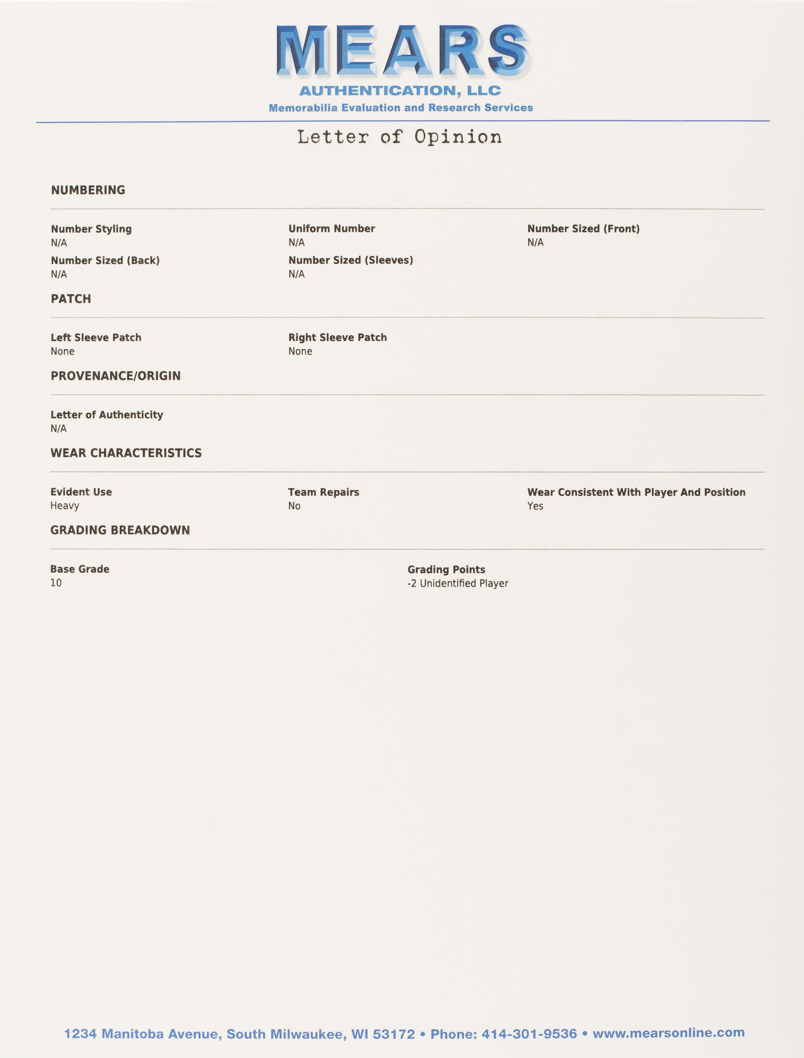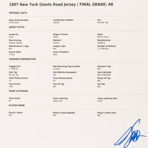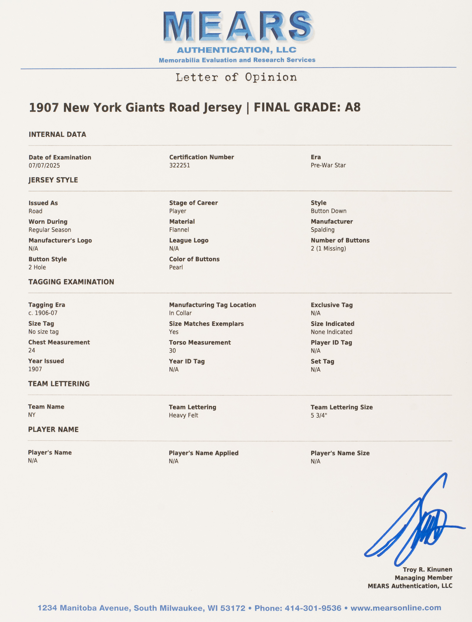 Offered here is the earliest New York Giants road jersey we have ever offered dating from 1907. Graded A8 by MEARS. The gray road flannel jersey, which predates uniform numbers, is simply lettered "NY" across the front in blue felt letters (now faded to light purple). A "Spalding" label is located in the collar, along with a vintage strip tag with faded ink (illegible). This is an extremely rare one-year style jersey, which was worn by the Giants only during the 1907 season. The jersey, which is completely original, is unaltered and displays heavy use, including one missing button and one cracked button. Jerseys dating from the dead-ball era are exceedingly rare, with literally less than a dozen examples known. Although the jersey displays no player identification, this remains a significant and rare one-year style dead-ball era flannel jersey. Graded A8 by MEARS (base grade of 10, with 2 points deducted for lack of positive player identification). Full LOA from MEARS.