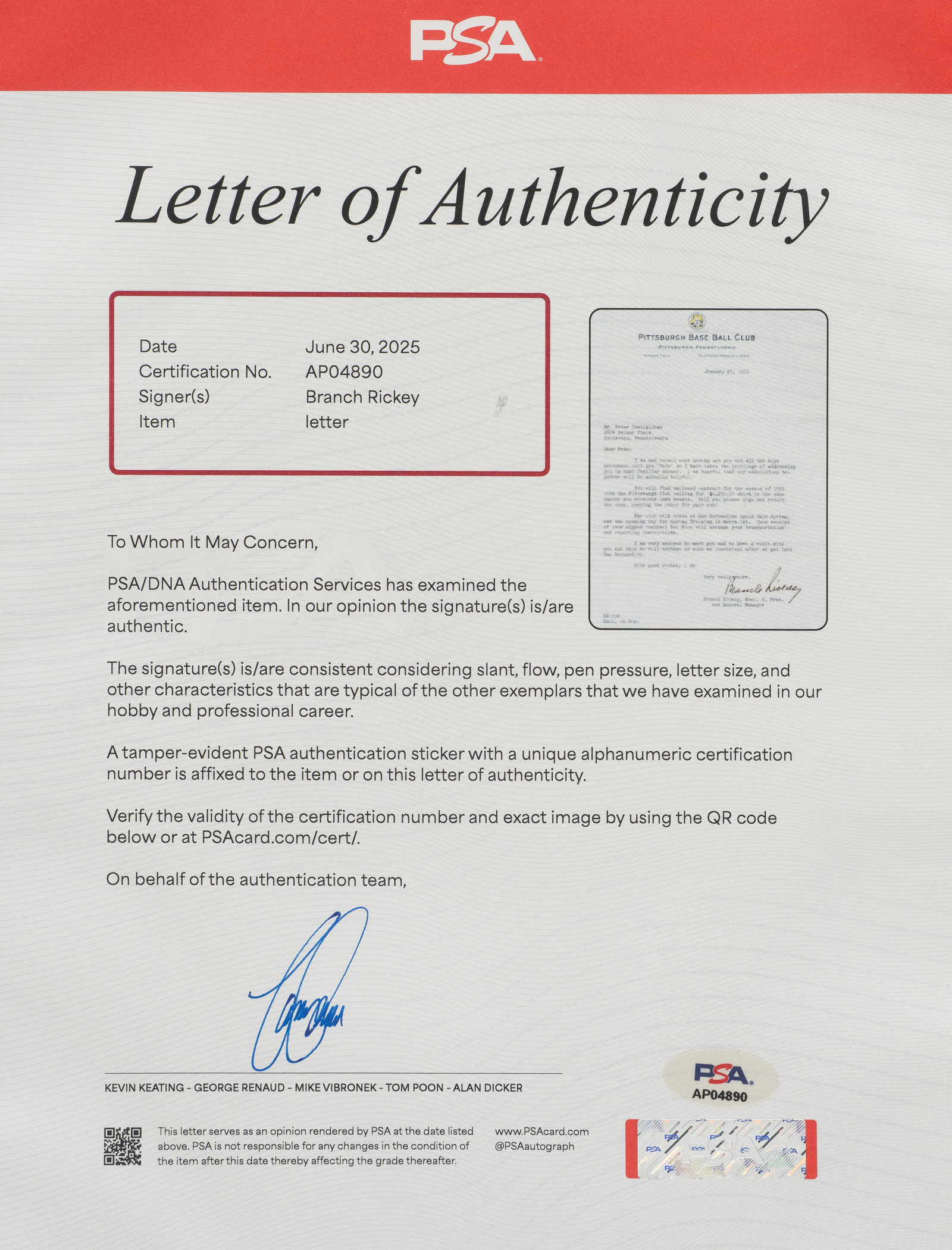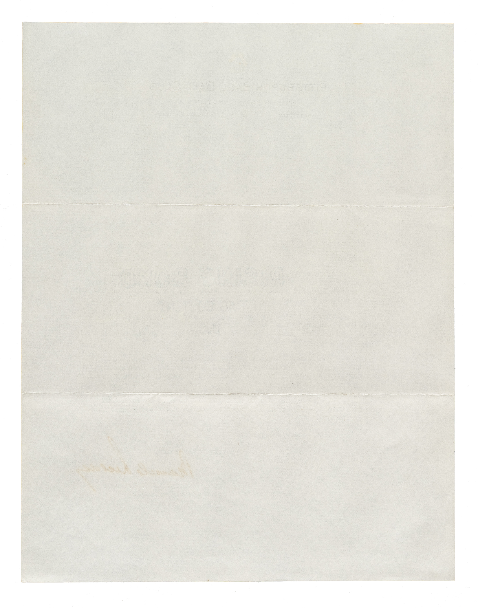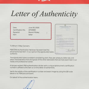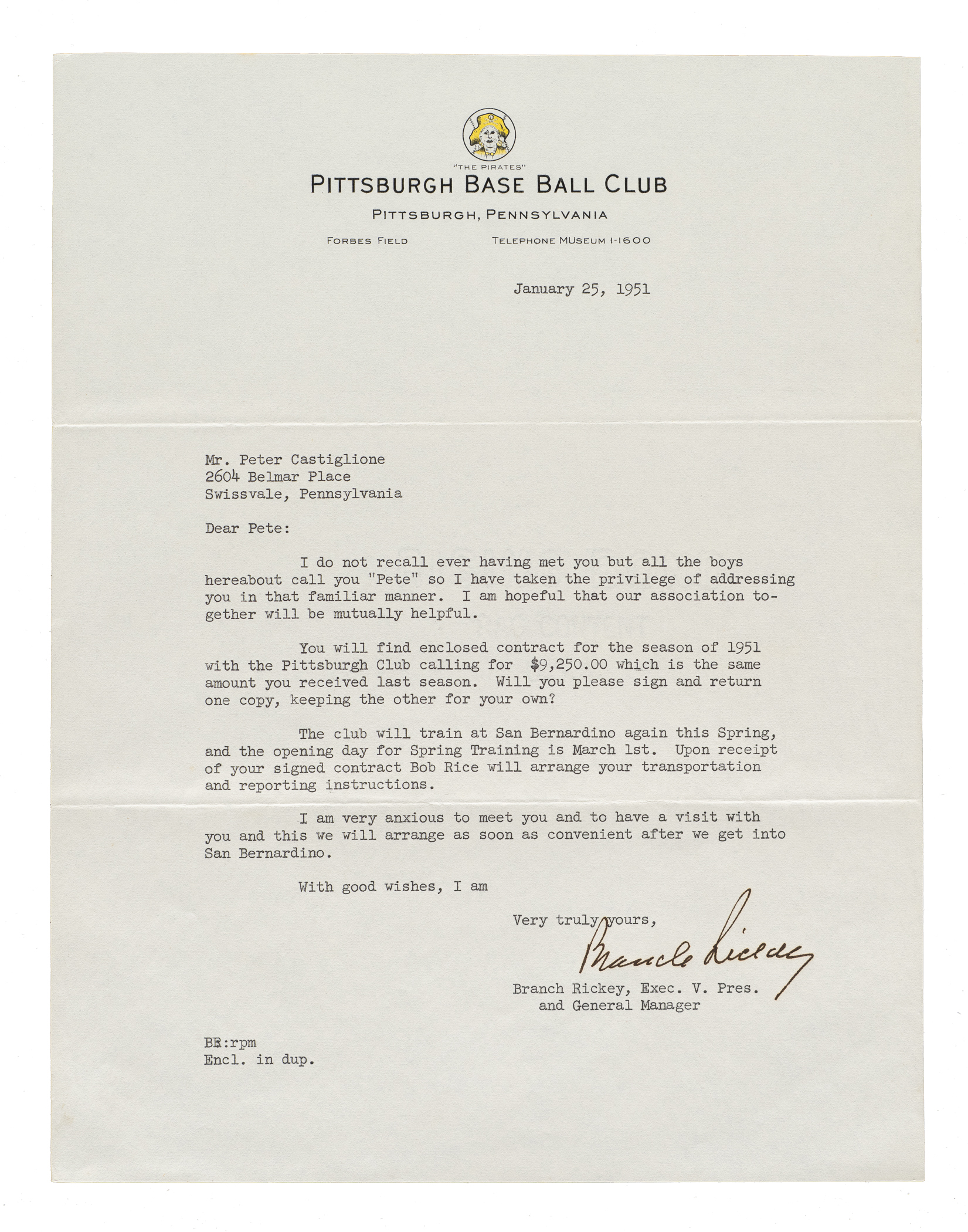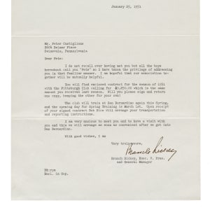 One-page typed letter, dated January 25, 1951, signed by Hall of Fame executive Branch Rickey. In his letter, written on official Pittsburgh Baseball Club letterhead to infielder Pete Castiglione, Rickey presents Castiglione with his contract for the upcoming 1951 season. In full: “Dear Pete: I do not recall ever having met you but all the boys hereabout call you “Pete” so I have taken the privilege of addressing you in that familiar manner. I am hopeful that our association together will be mutually helpful. You will find enclosed contract for the season of 1951 with the Pittsburgh Club calling for $9,250.00 which is the same amount you received last season. Will you please sign and return one copy, keeping the other for your own? The club will train at San Bernardino again this Spring, and the opening day for Spring Training is March 1st. Upon receipt of your signed contract Bob Rice will arrange your transportation and reporting instructions. am very anxious to meet you and to have a visit with you and this we will arrange as soon as convenient after we get into San Bernardino. With good wishes, I am Very truly yours...." Signed "Branch Rickey" in black fountain pen. The letter (8.5 x 11 inches) displays two horizontal mailing folds. In Excellent to Mint condition overall. Full LOA from PSA/DNA.